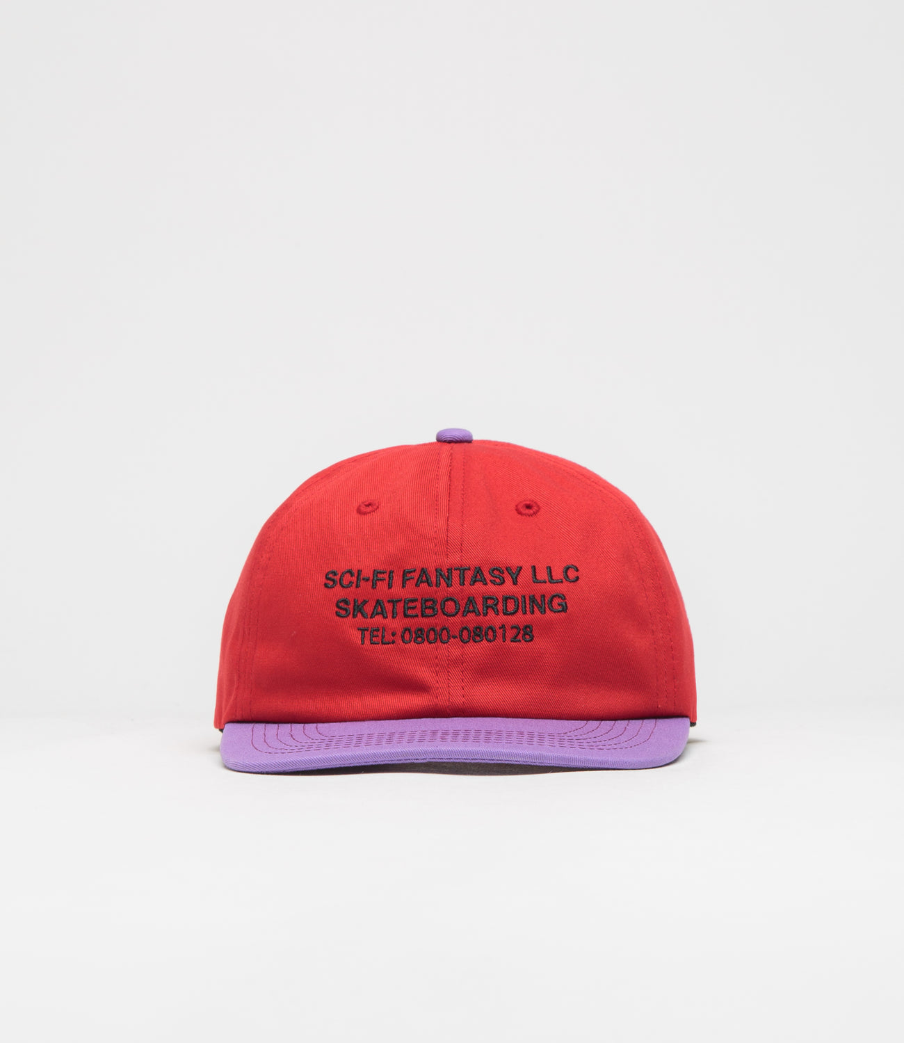 Sci-Fi Fantasy Business Post Cap in Red and Violet. Part of the brand’s latest release, this two-one Sci-Fi Fantasy cap is made from 100% cotton twill. Featuring a contrasting peak, embroidered eyelets and an adjustable snapback fastening, this red Sci-Fi Fantasy cap is finished with embroidered Sci-Fi Fantasy LLC Skateboarding crown detailing.