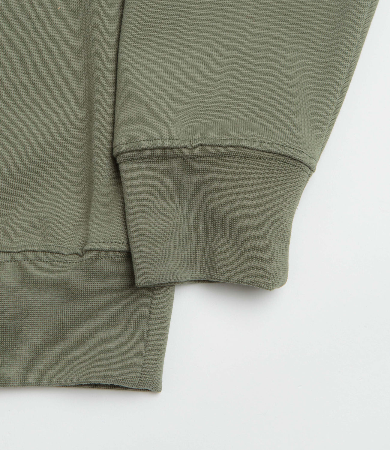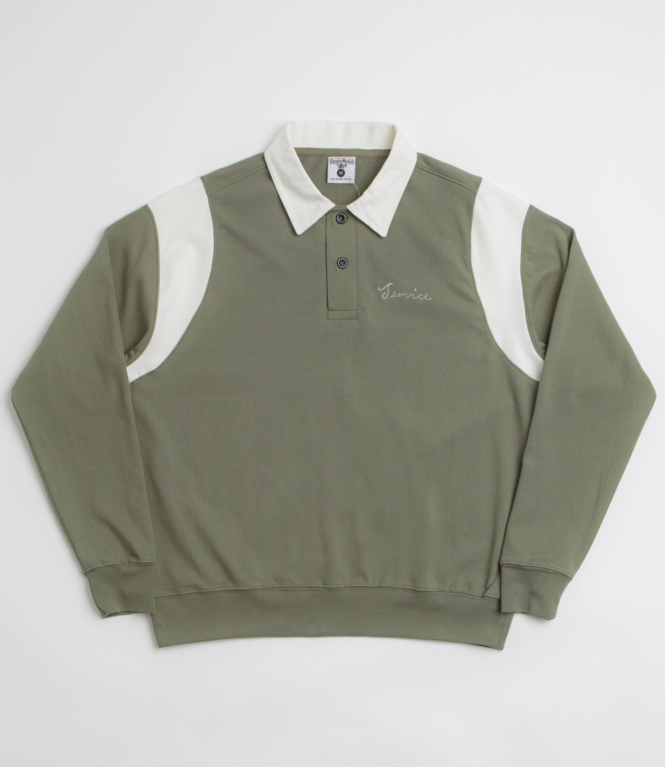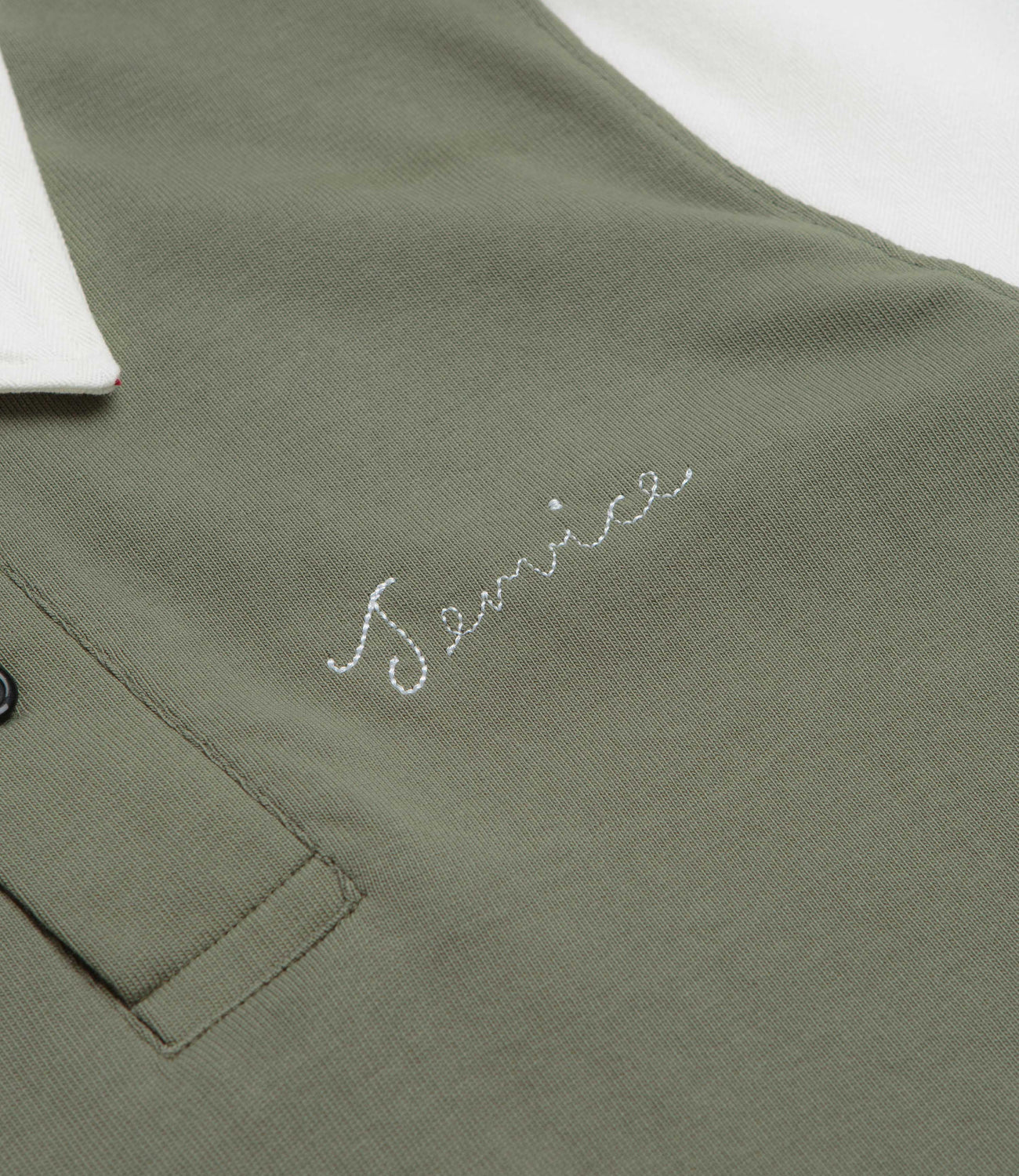 Service Works Bistro Rugby Shirt in Olive. Regular fitting, this heavyweight Service Works shirt is made from 100% organic cotton. Featuring a contrasting stand collar and herringbone panelling, this green Service Works shirt is finished with ribbed cuffs and embroidered branding.