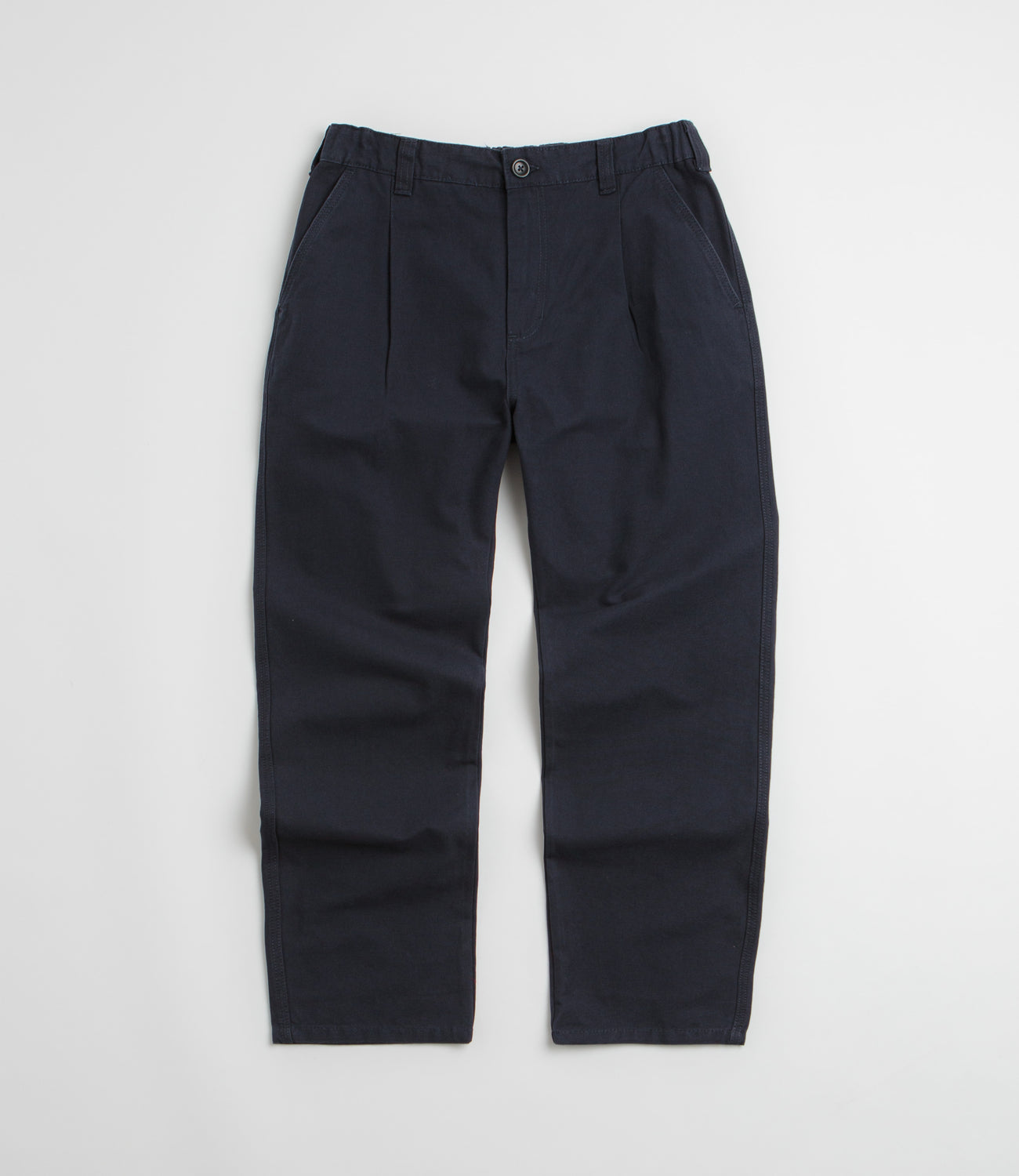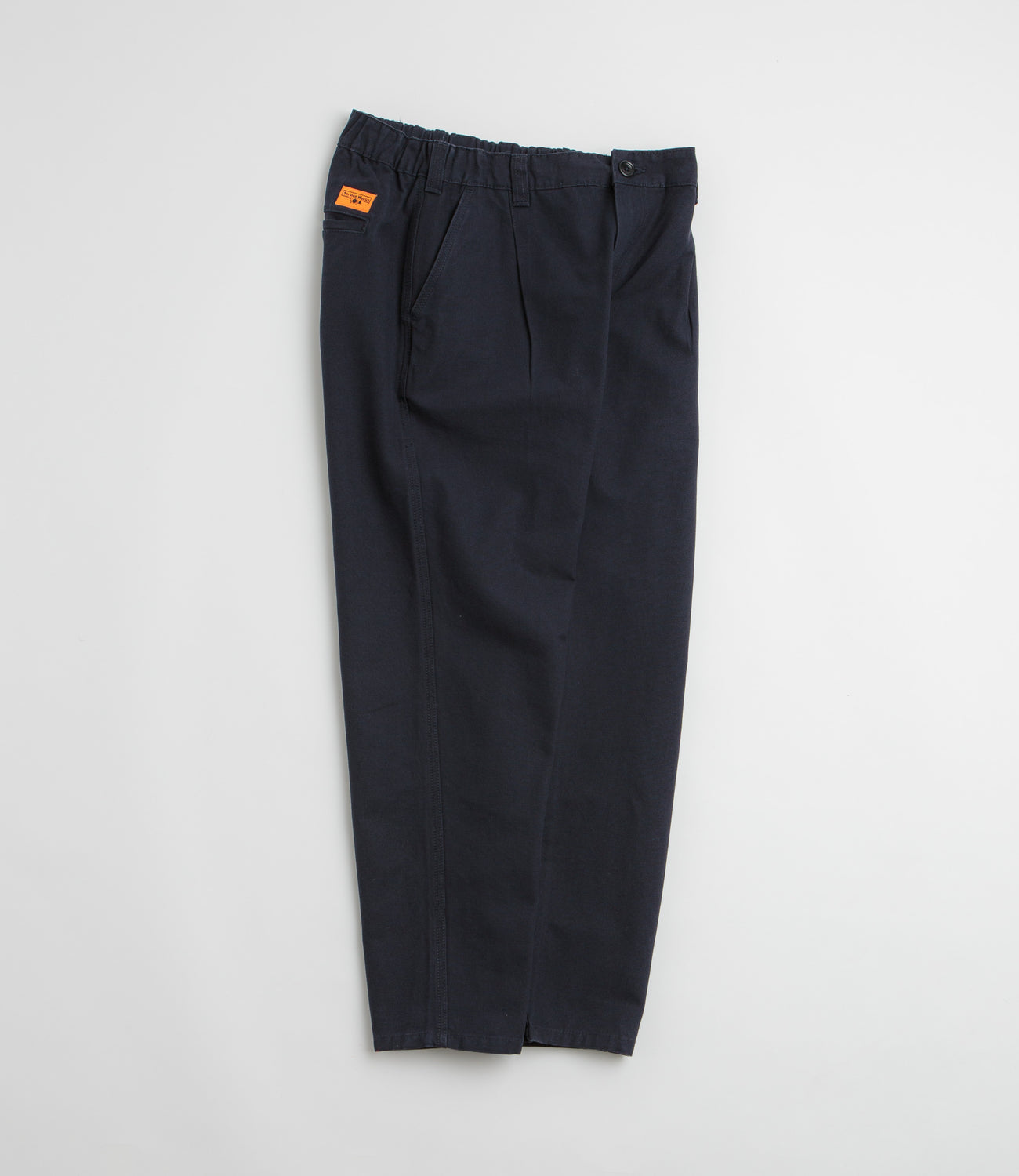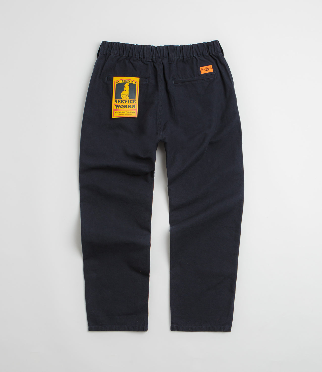 Service Works Canvas Waiter Pants in Dark Navy. Regular fitting with a slightly tapered leg, these Service Works pants are made from 100% organic cotton canvas. Featuring a half-elasticated waistband and single pleat details, these navy Service Works pants are finished with two front pockets, two rear pockets and flag label branding.