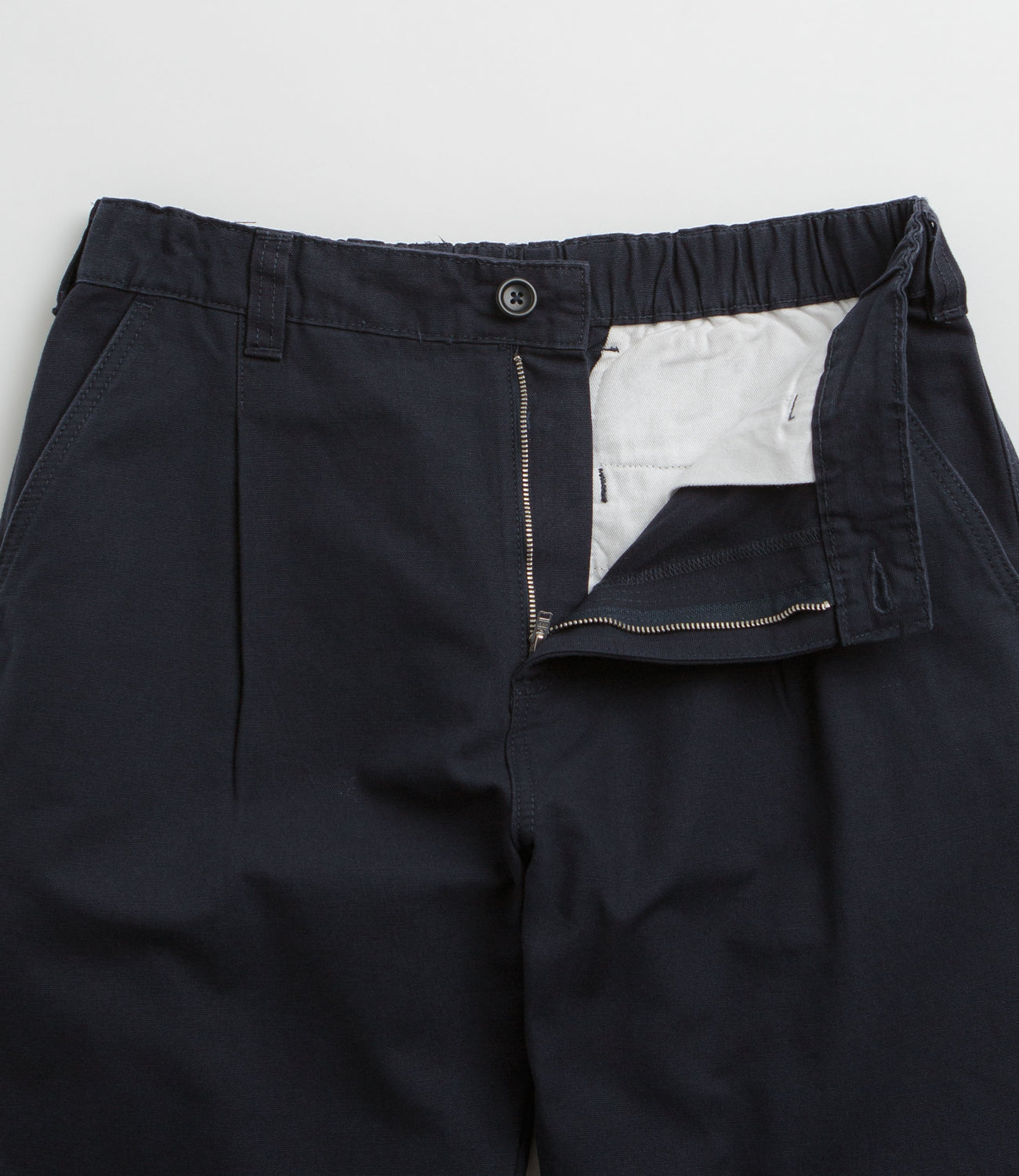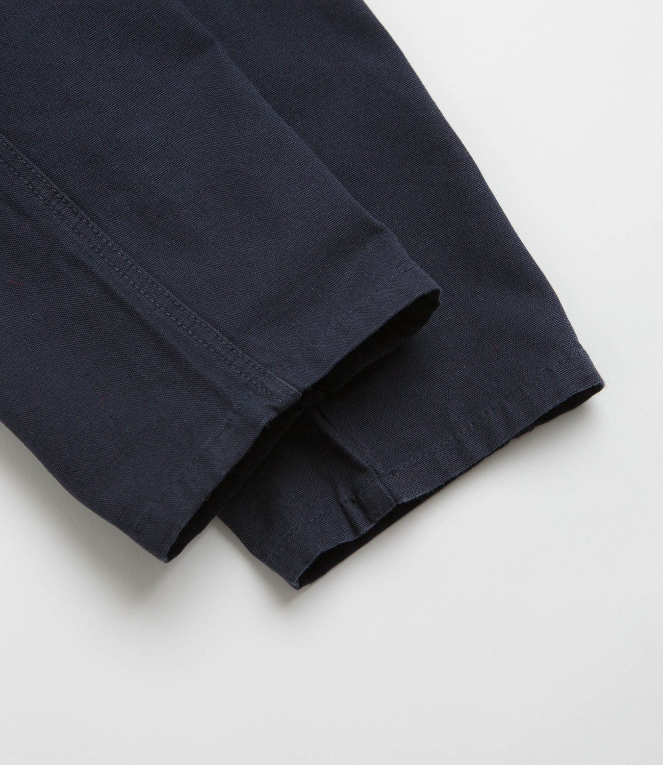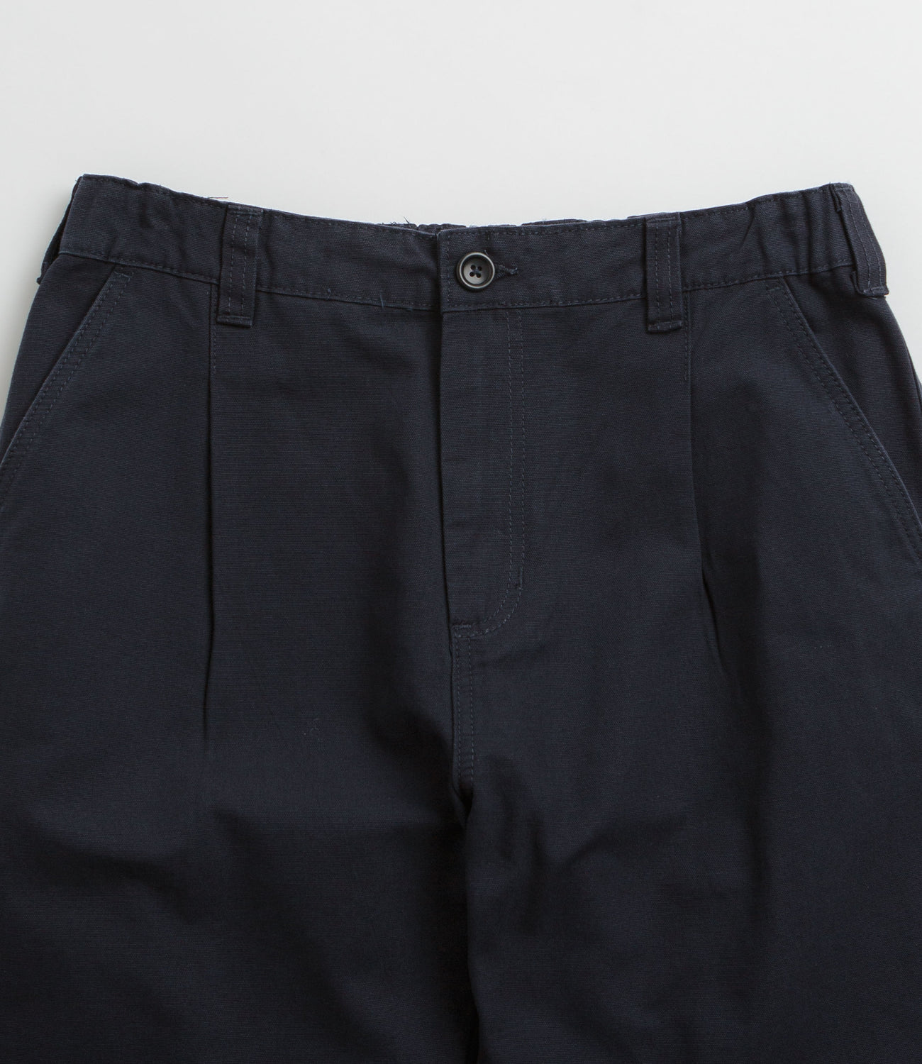 Service Works Canvas Waiter Pants in Dark Navy. Regular fitting with a slightly tapered leg, these Service Works pants are made from 100% organic cotton canvas. Featuring a half-elasticated waistband and single pleat details, these navy Service Works pants are finished with two front pockets, two rear pockets and flag label branding.