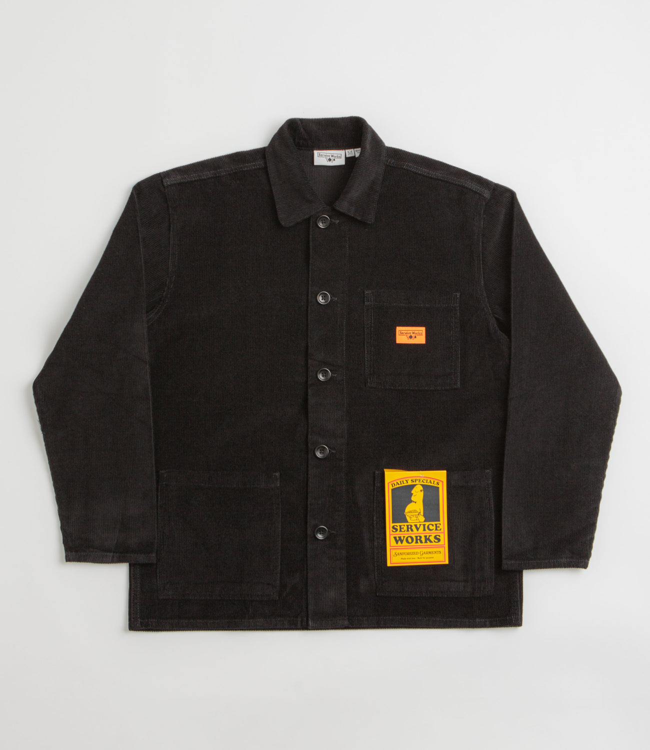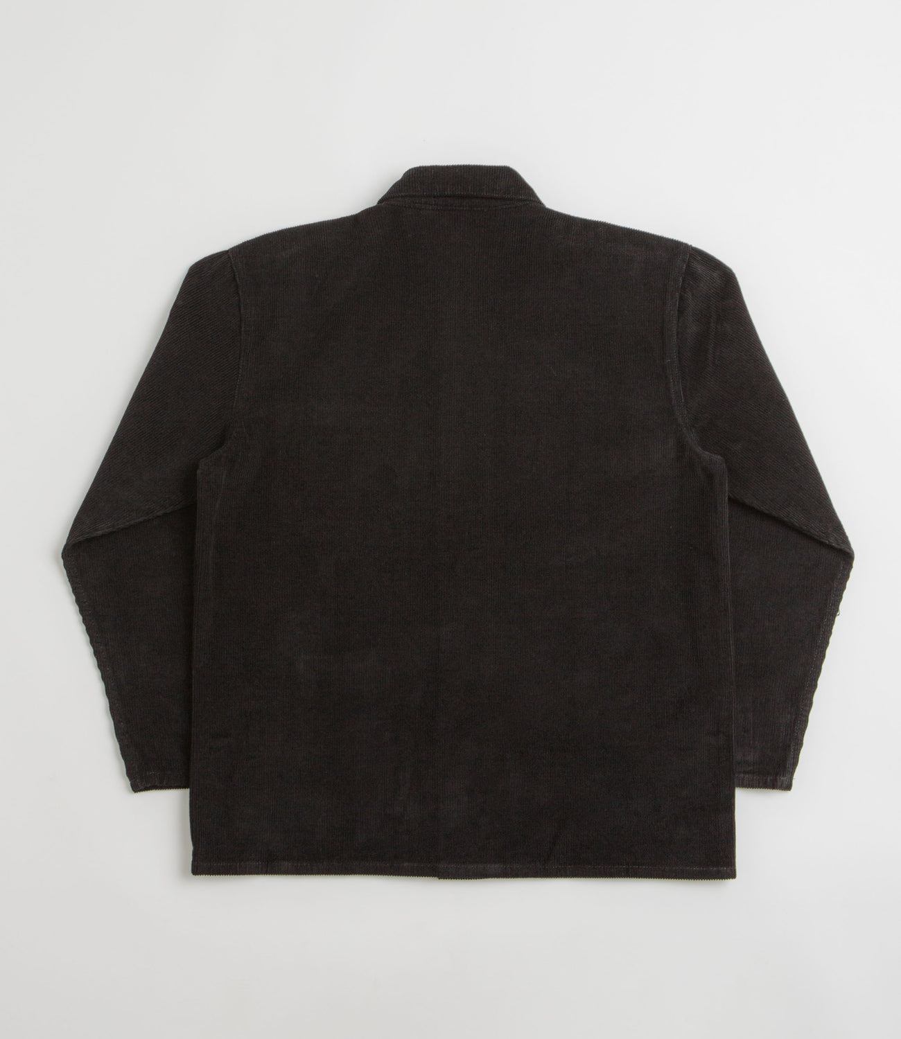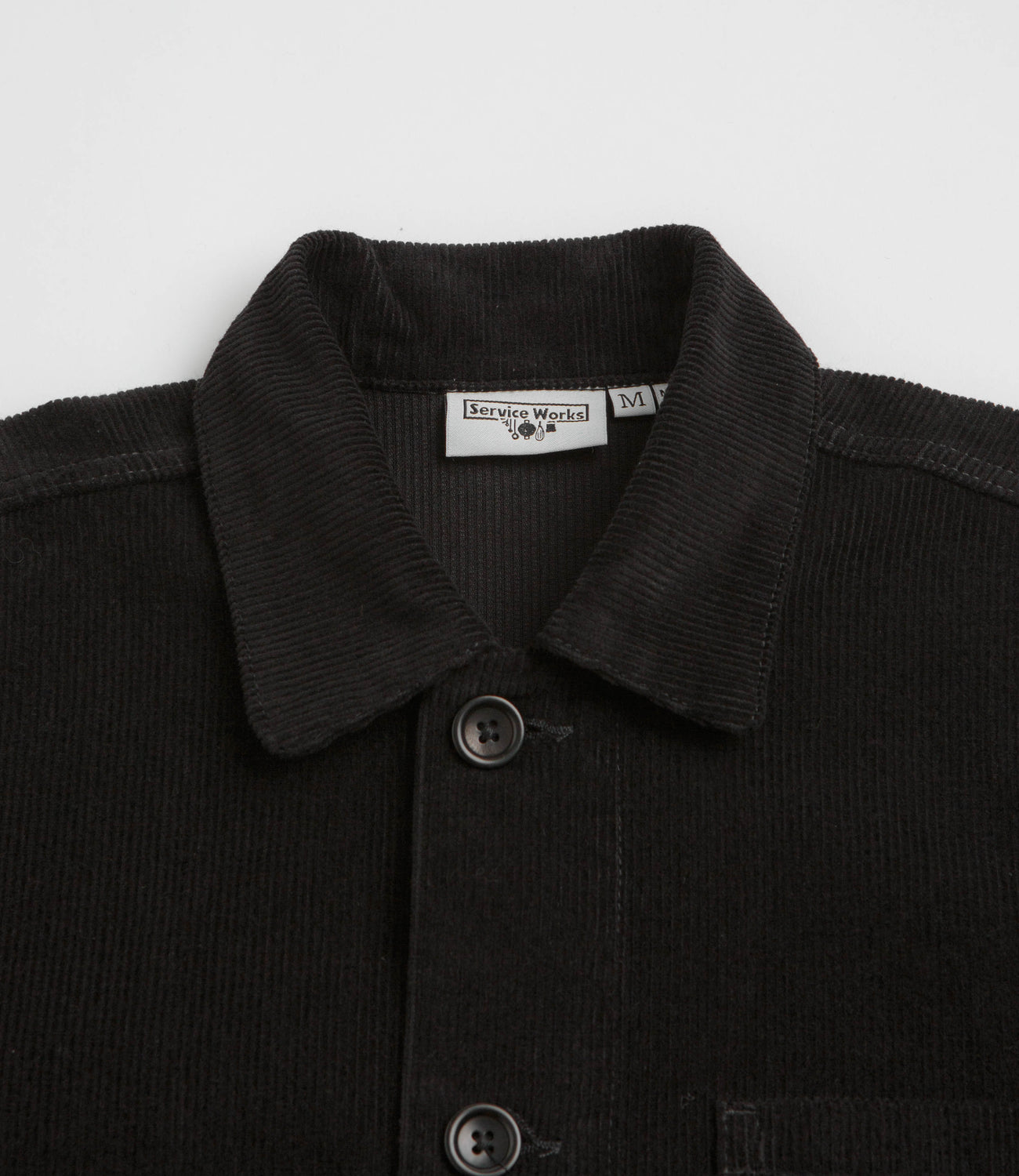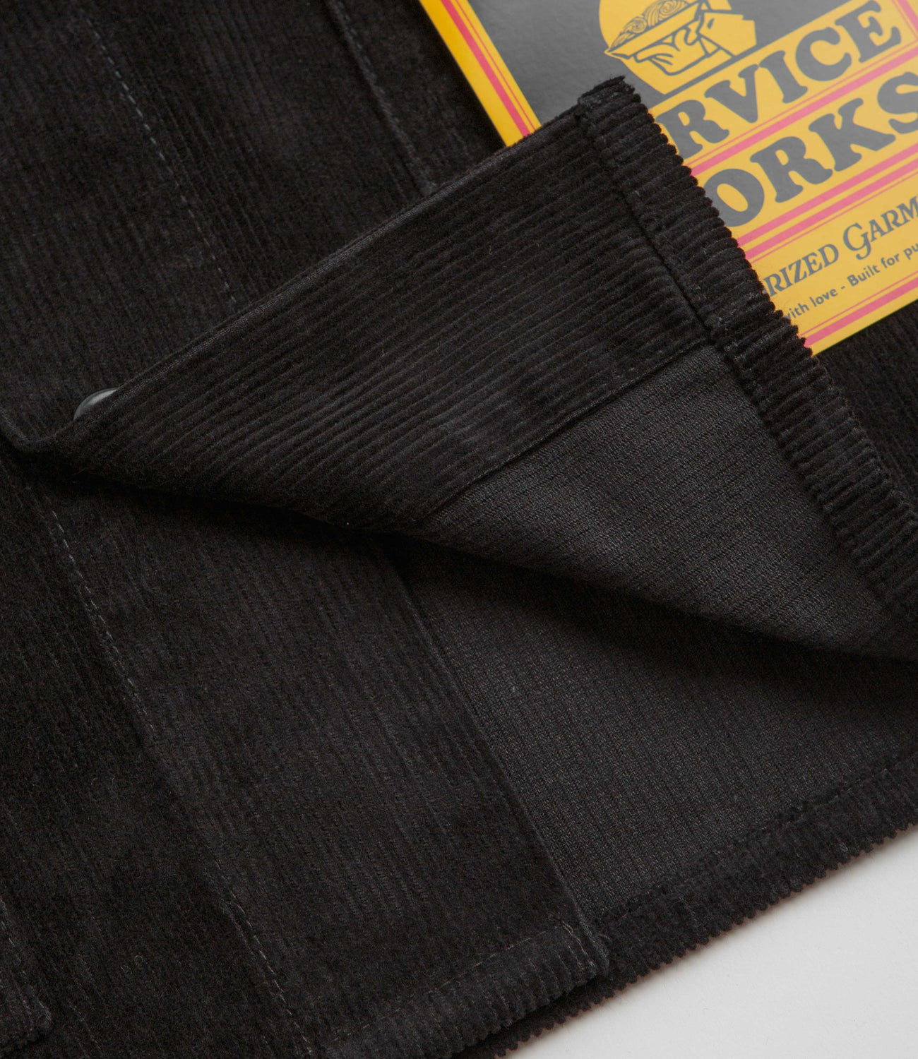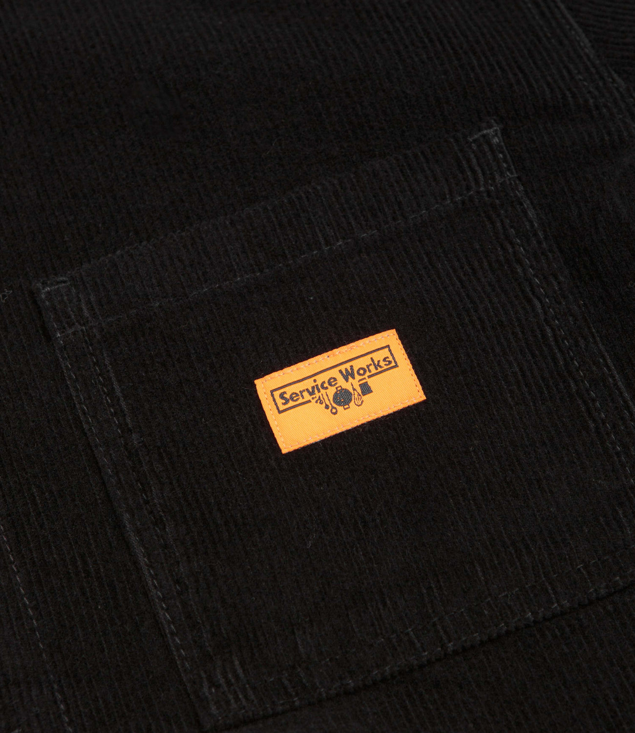 Service Works Corduroy Chore Shirt in Black. Regular fitting, this garment dyed Sercice Works chore shirt is made from 100% organic cotton corduroy with a stand collar and full length button fastening. Finished in black with a single chest pocket, two front pockets, an inner chest pocket and woven flag label branding.