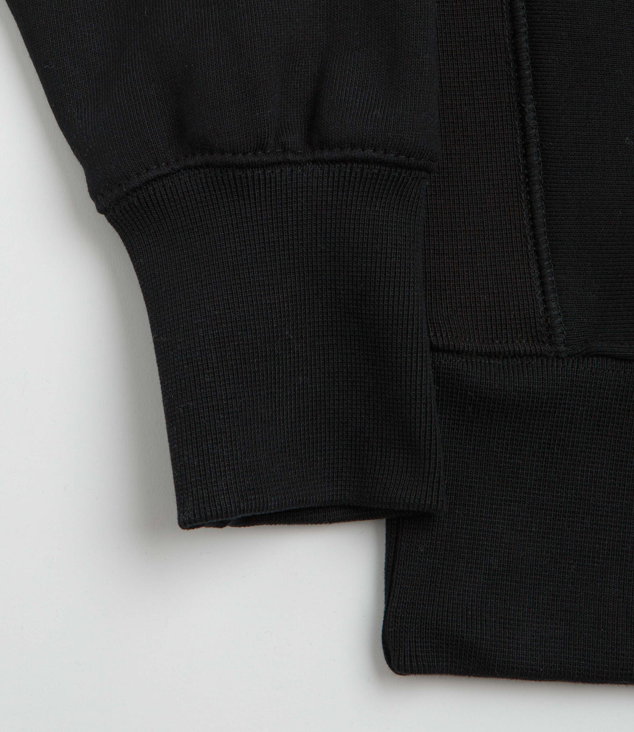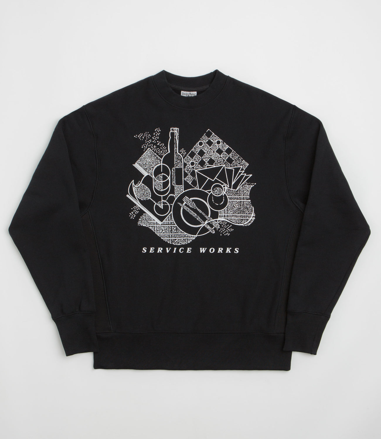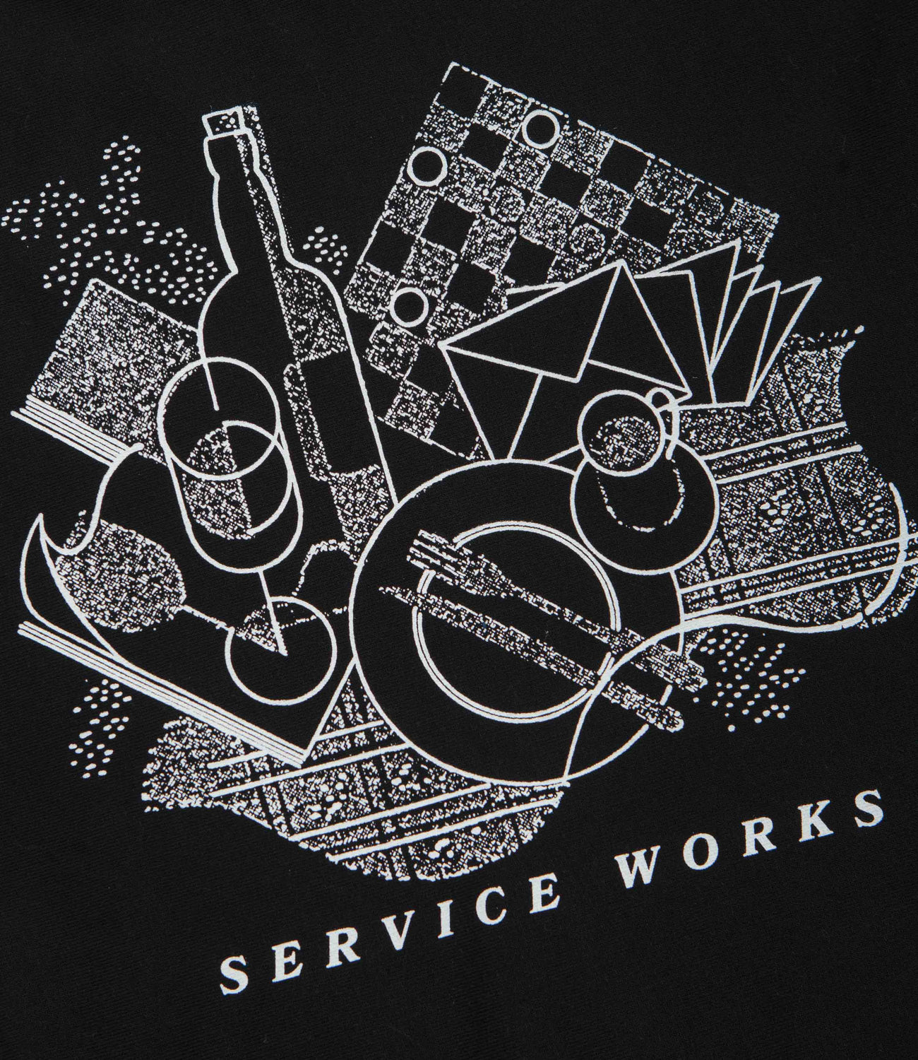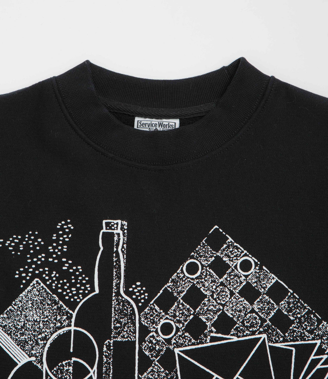 Service Works Frequent Flyer Crewneck Sweatshirt in Black. Regular fitting and made from 100% organic cotton, this garment dyed Service Works sweatshirt is designed with a set-in neckline and ribbed cuffs. Finished in black with a woven elastic hem and a hand screen printed graphic.