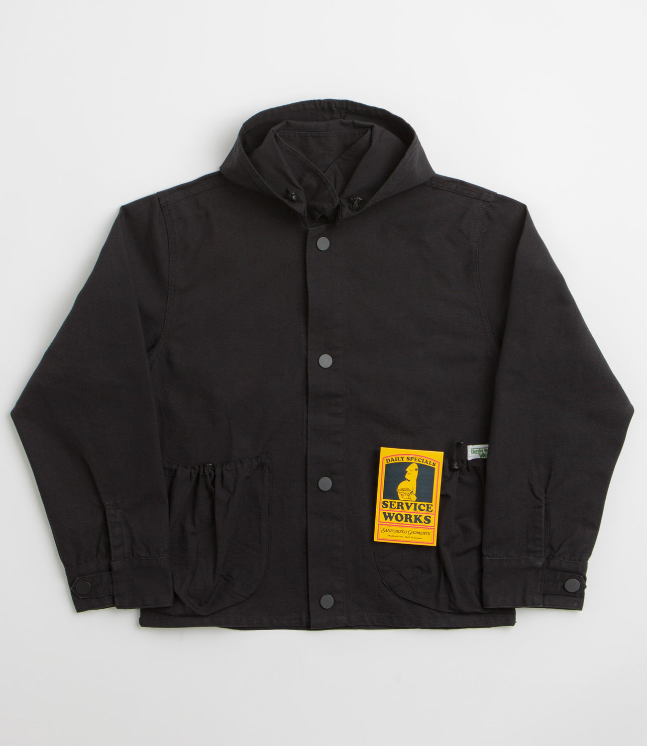 Service Works Gardener Jacket in Black. Made from 100% organic cotton duck canvas, this garment dyed Service Works jacket is designed with a removable hood and a flat collar. Featuring a four button fastening and an adjustable hem, this black Service Works jacket is finished with two adjustable front pockets.