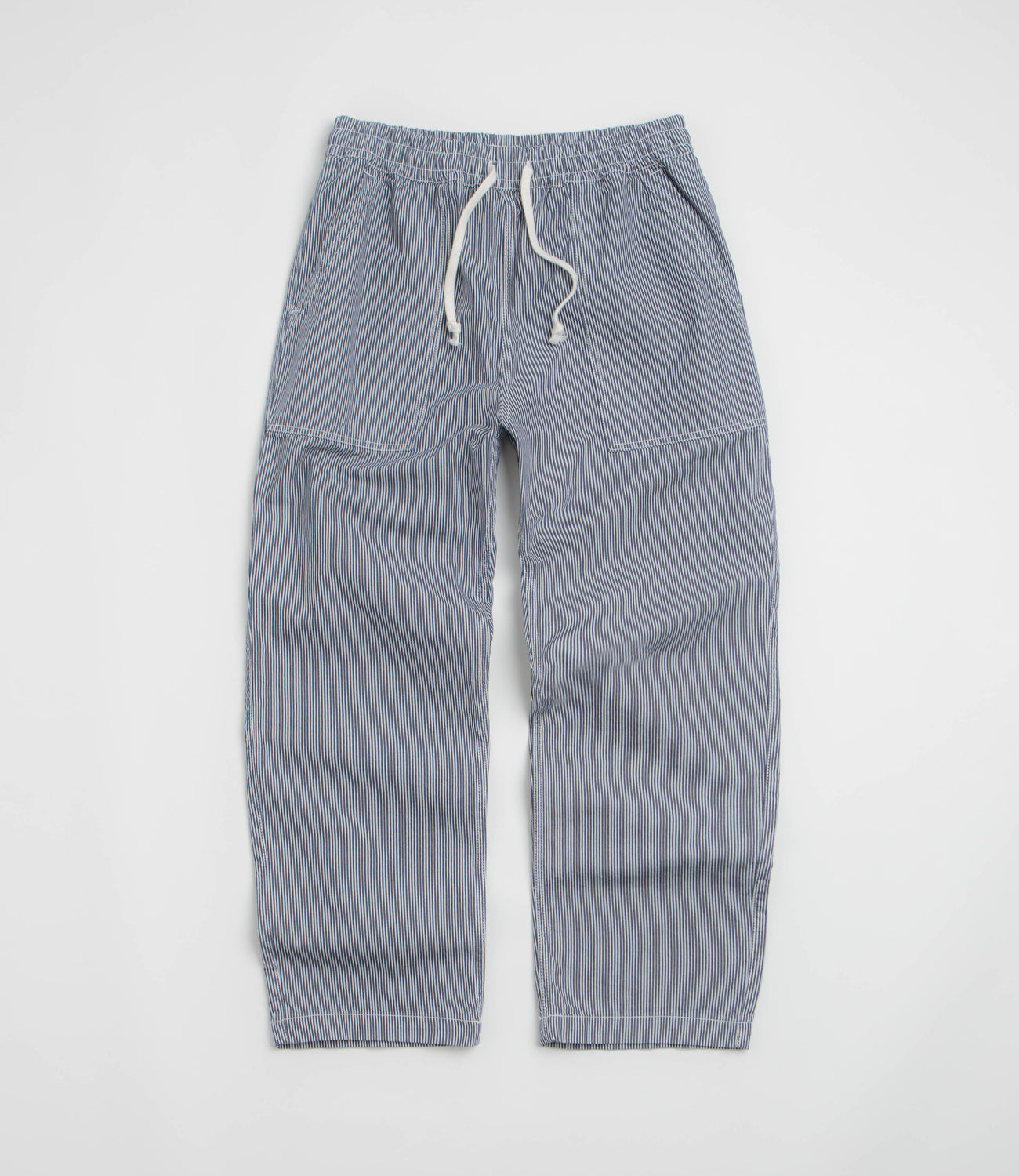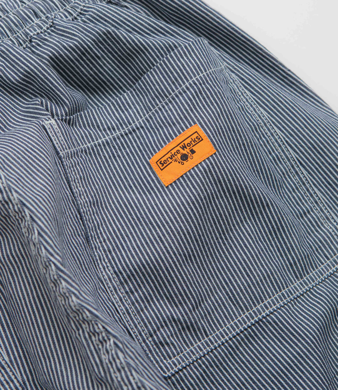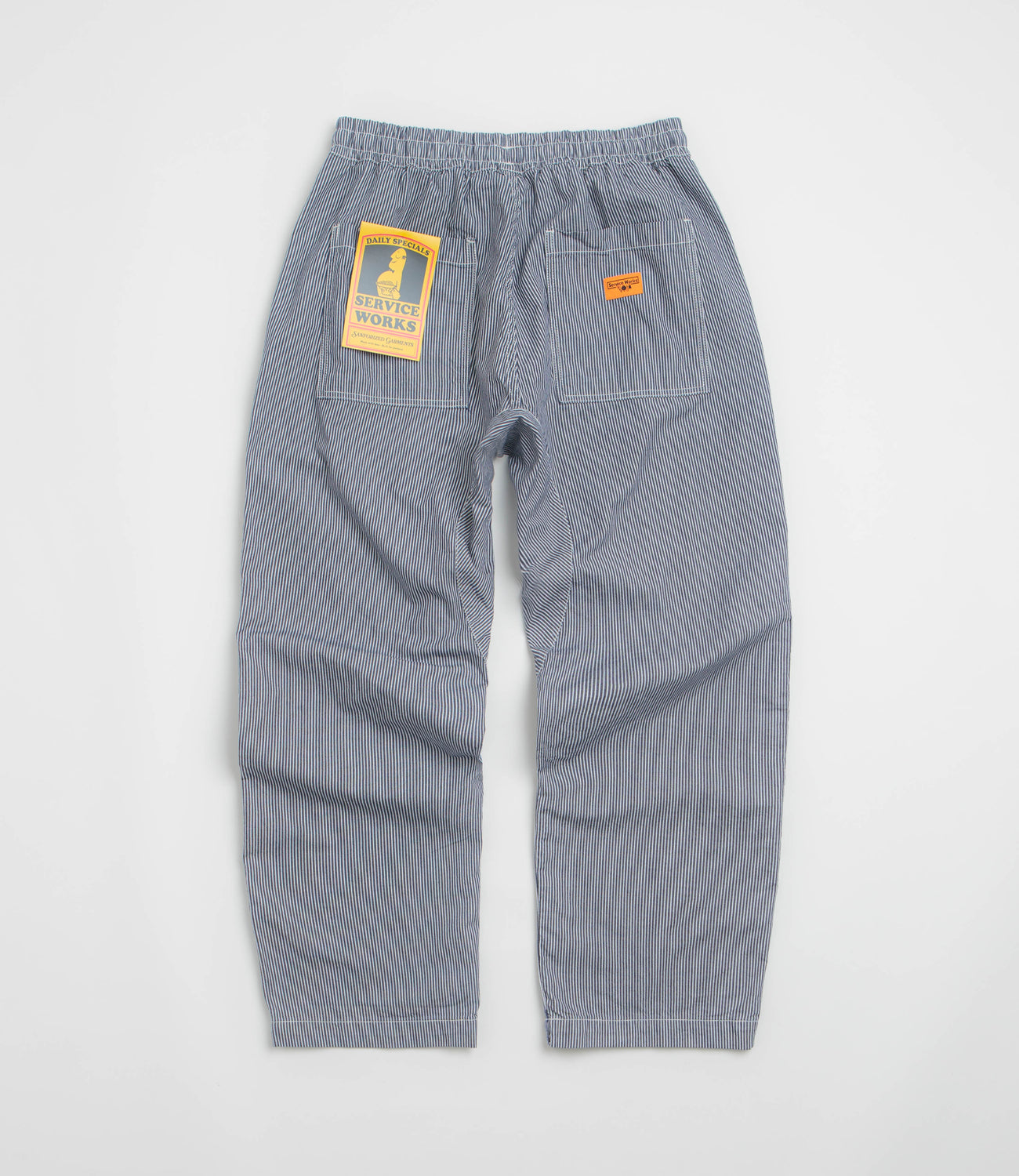 Service Works Hickory Chef Pants in Hickory. GOTS certified and made from 100% cotton, these Service Works pants are designed with an elasticated waistband and a reinforced crotch panel. Featuring raised fatigue pockets and two rear pockets, these hickory striped Service Works pants are finished with woven flag label branding.