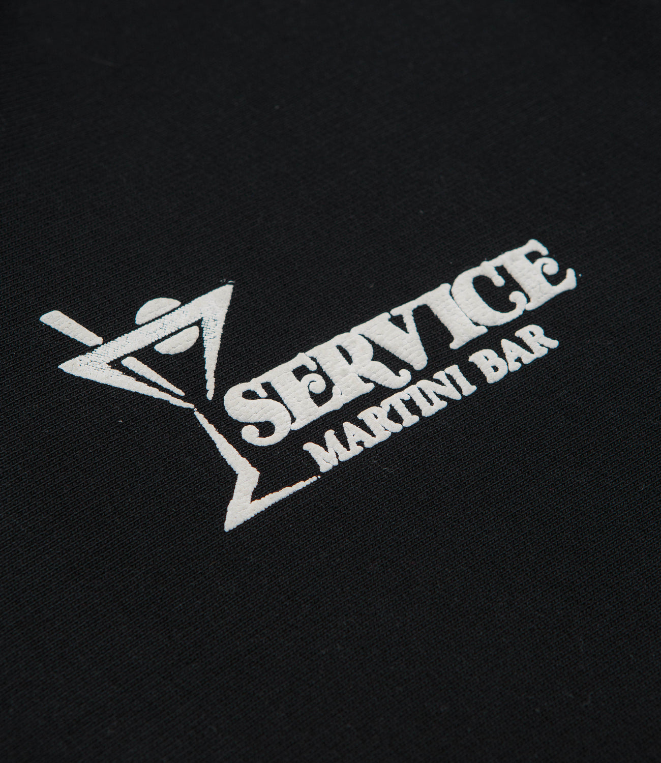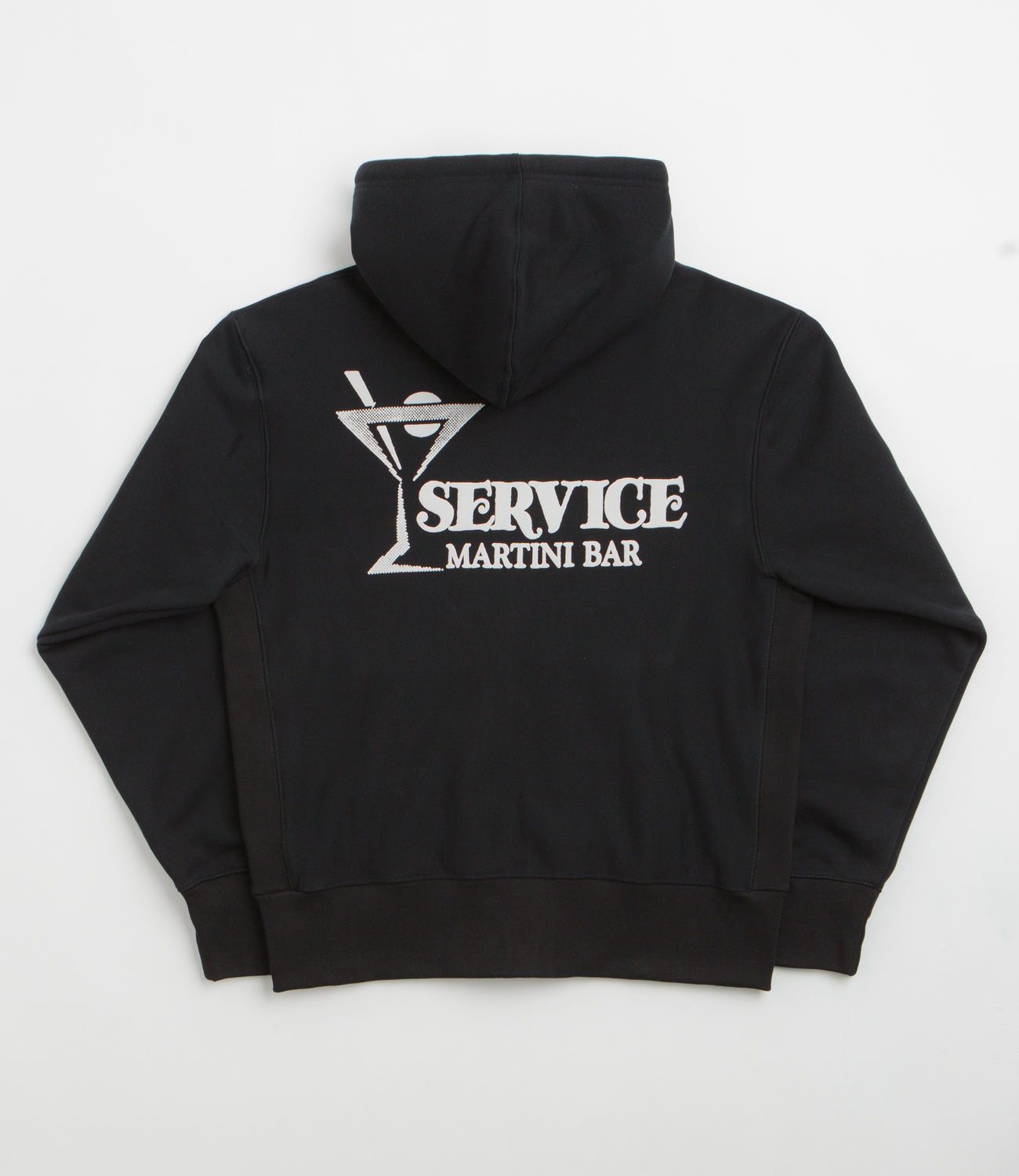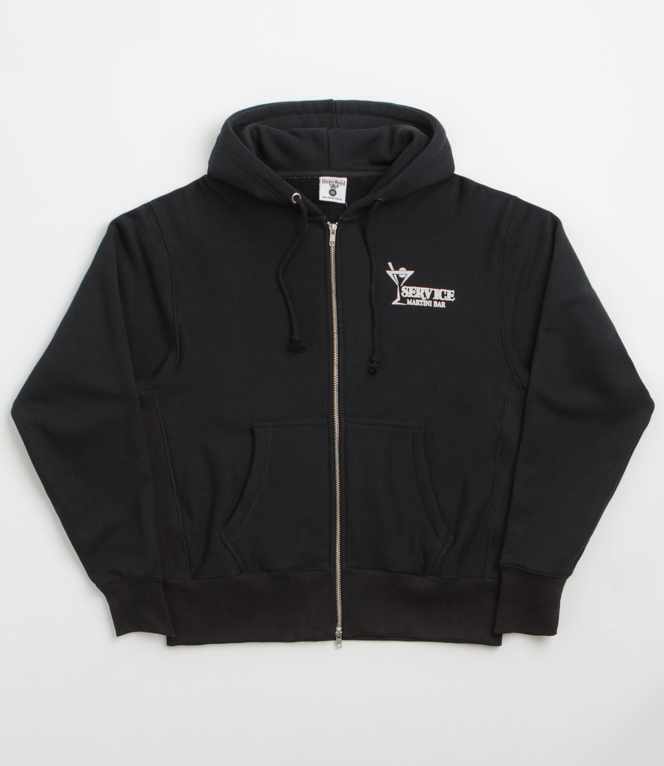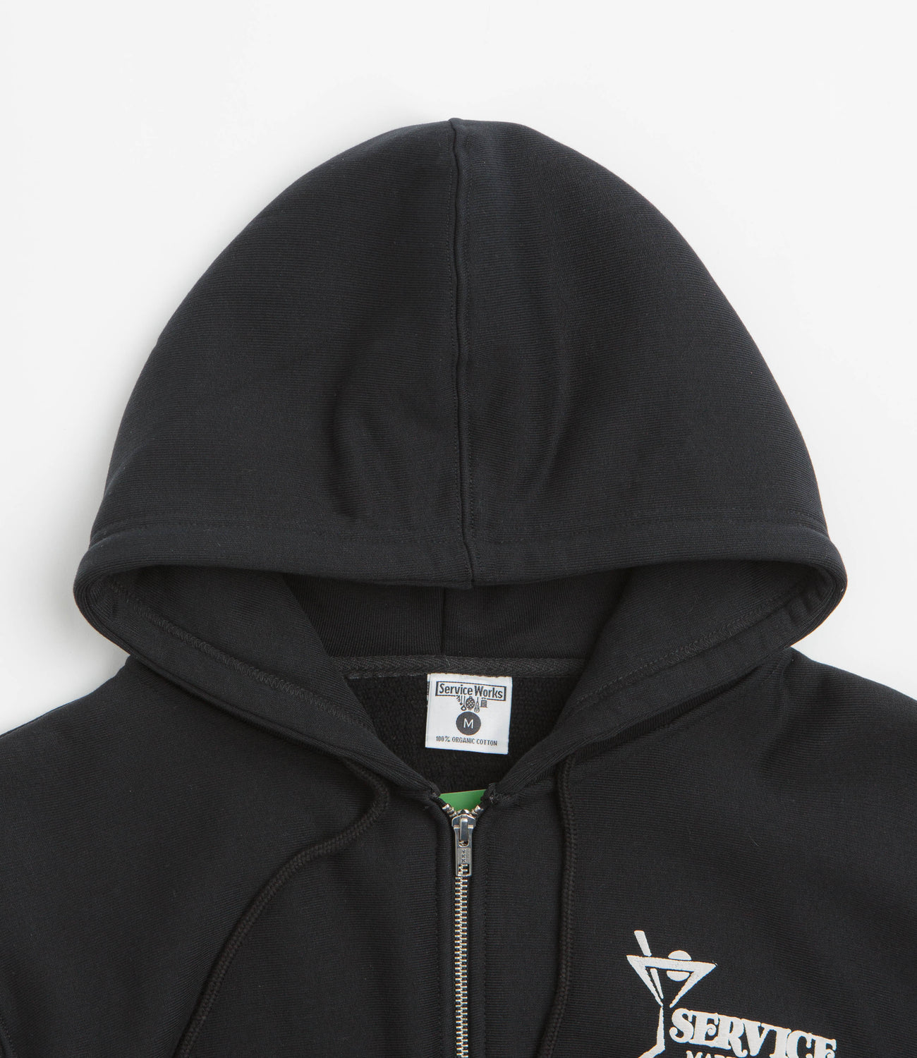 Service Works Martini Zipper Hoodie in Black. Regular fitting and garment dyed, this Service Works hoodie is made from 100% organic cotton with an adjustable drawstring hood. Featuring a full length zipper fastening, two front pockets and ribbed cuffs, this black Service Works hoodie is finished with printed graphics.