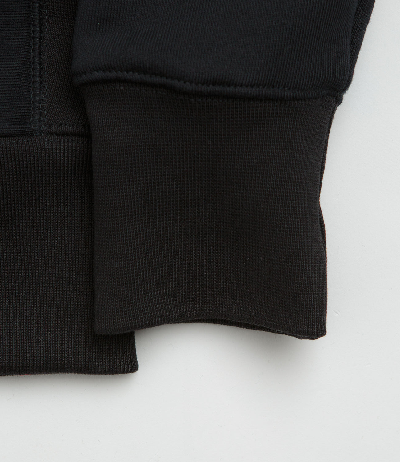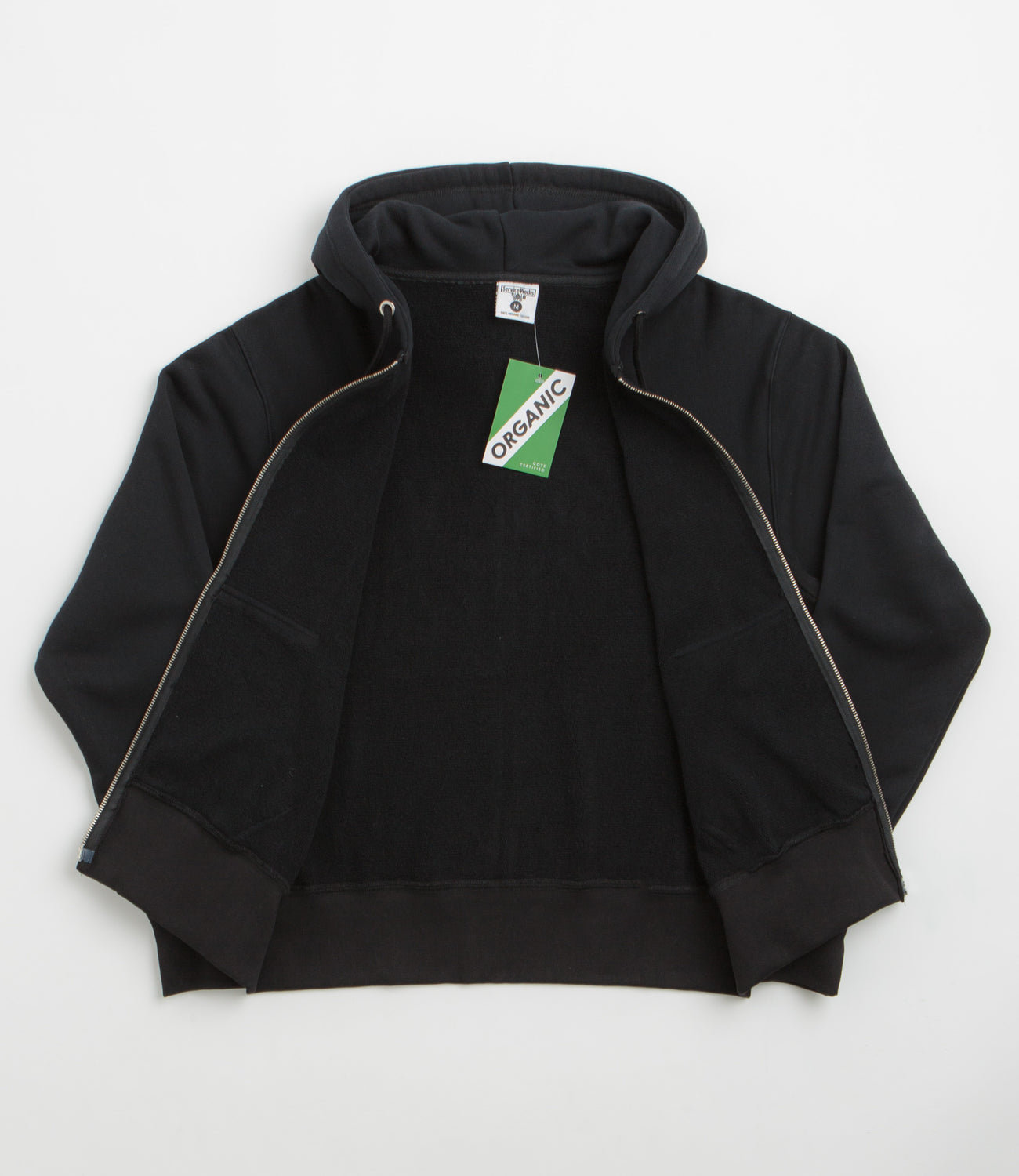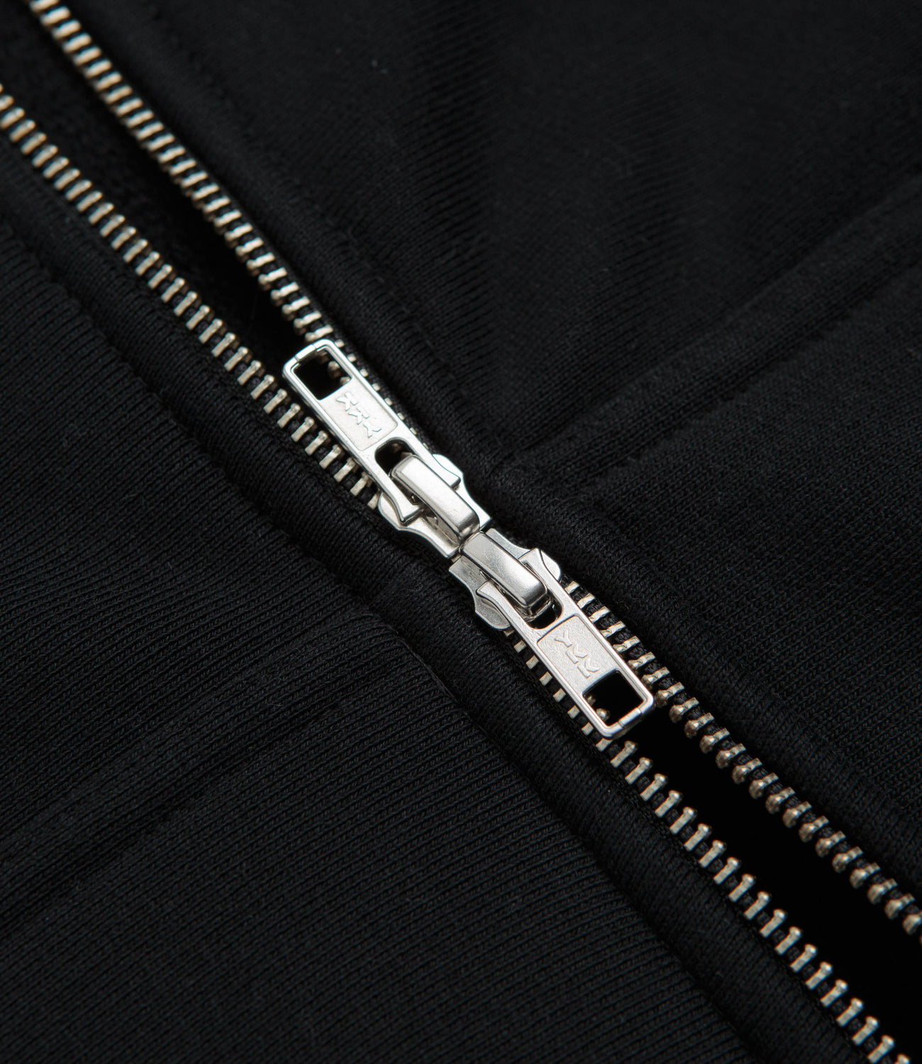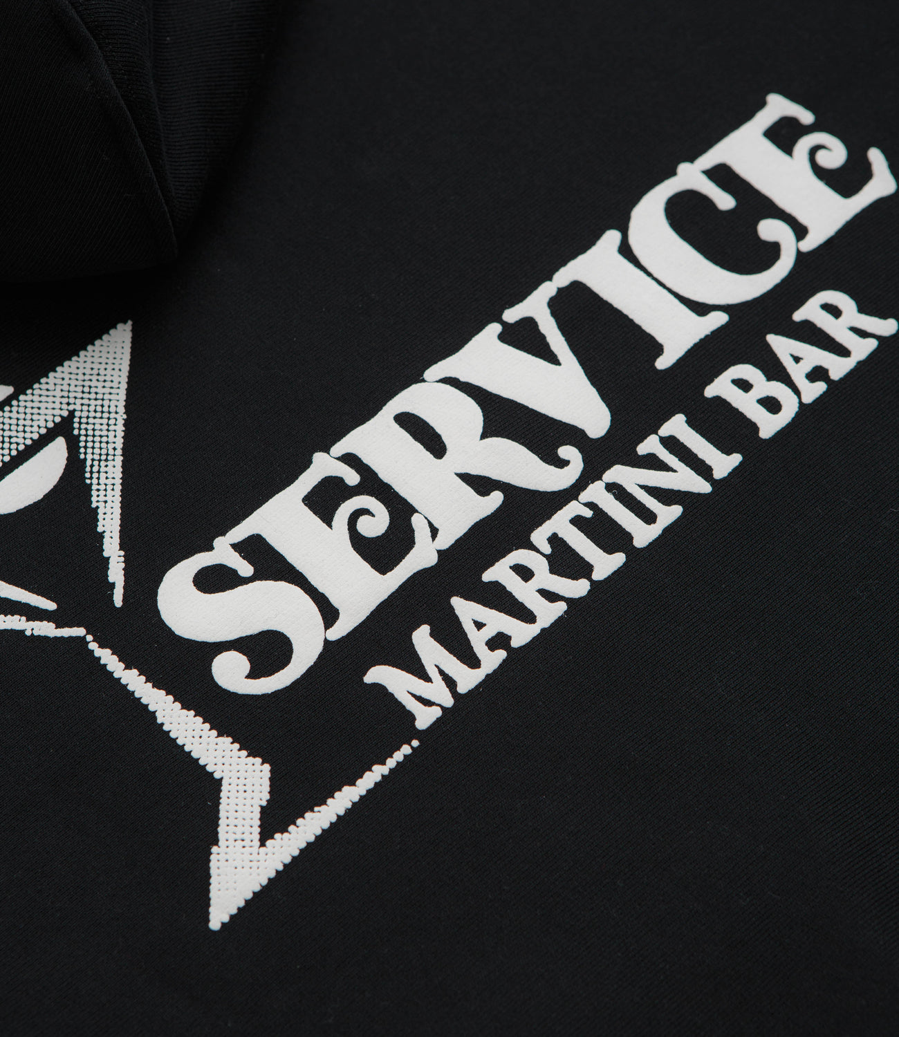 Service Works Martini Zipper Hoodie in Black. Regular fitting and garment dyed, this Service Works hoodie is made from 100% organic cotton with an adjustable drawstring hood. Featuring a full length zipper fastening, two front pockets and ribbed cuffs, this black Service Works hoodie is finished with printed graphics.