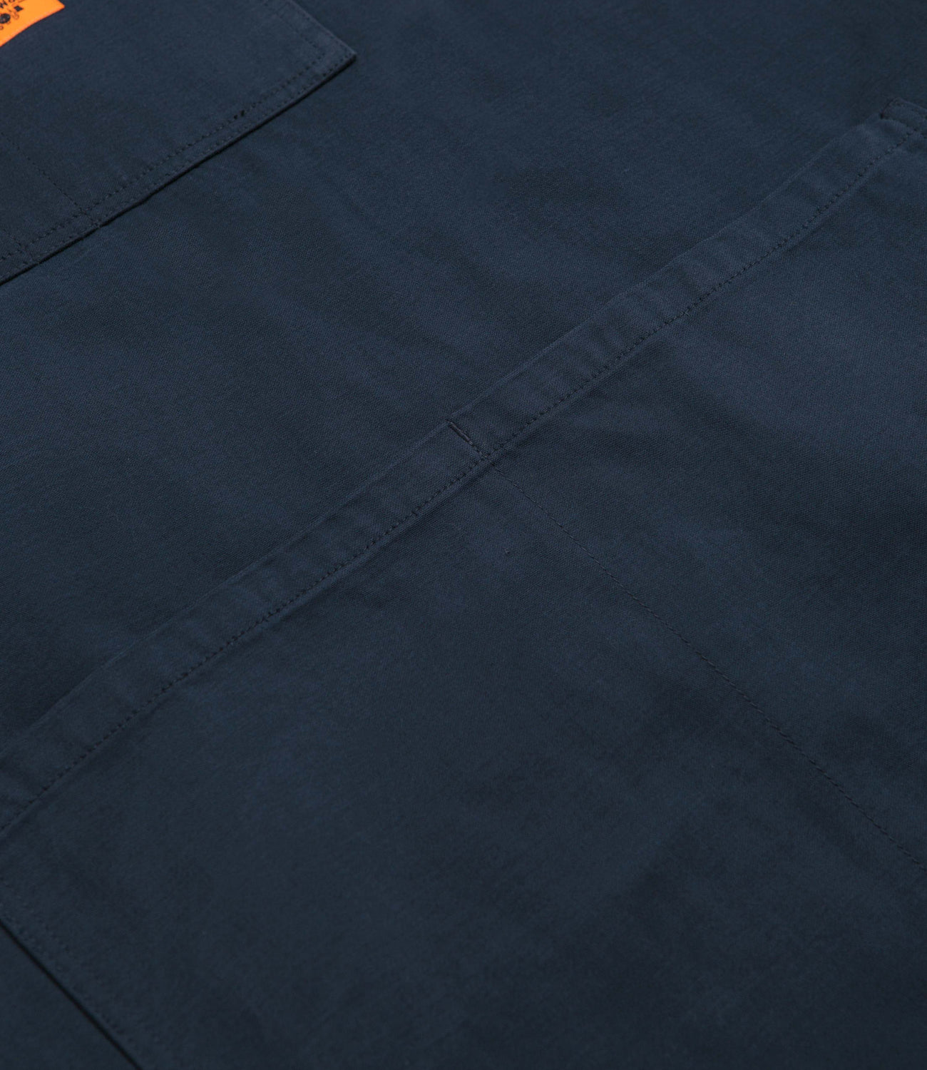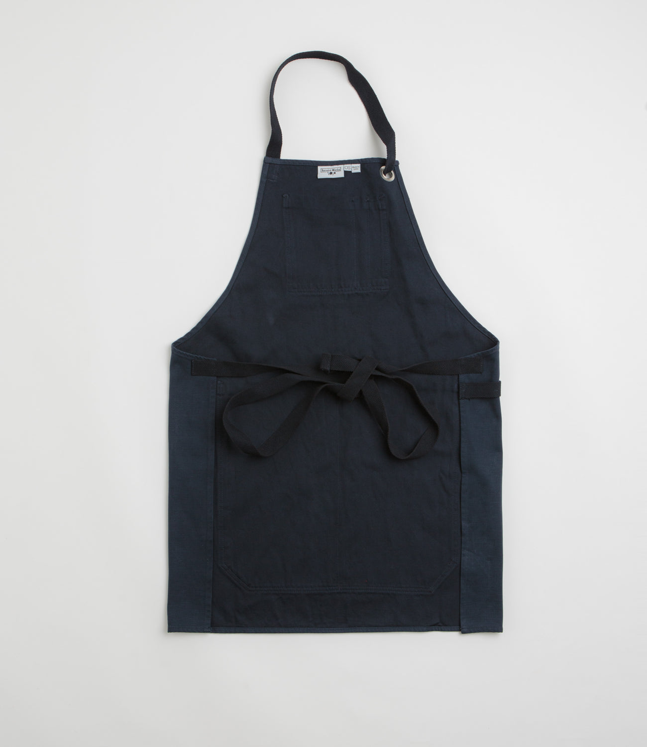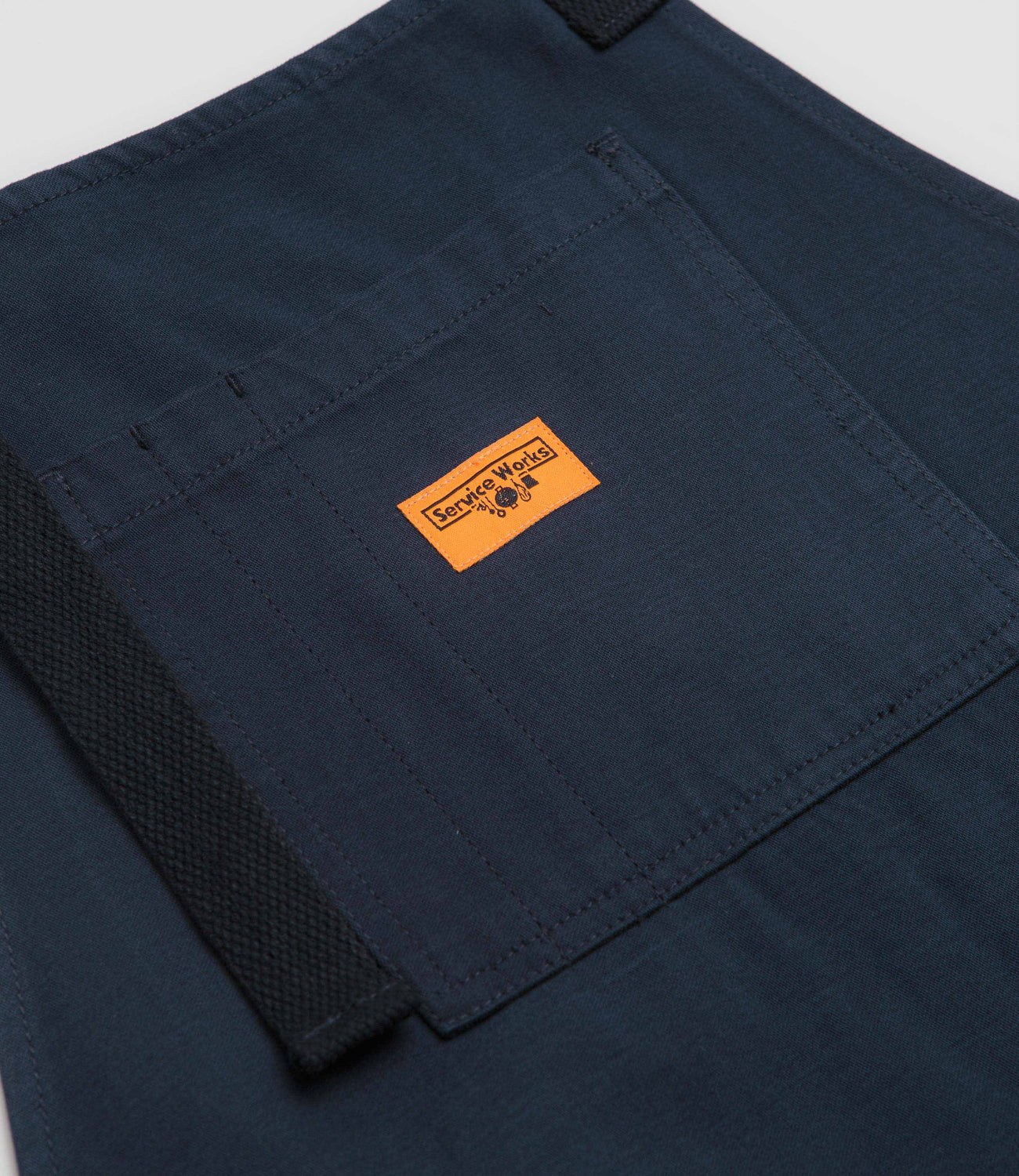 Service Works Moleskin Apron in Dark Navy. Made from 100% organic cotton moleskin, this Service Works apron is single sized with an adjustable neck strap. Featuring a central chest pocket, a double-pen pocket and lower waist pockets, this dark navy Service Works apron is finished with an additional towel strap and woven flag label.