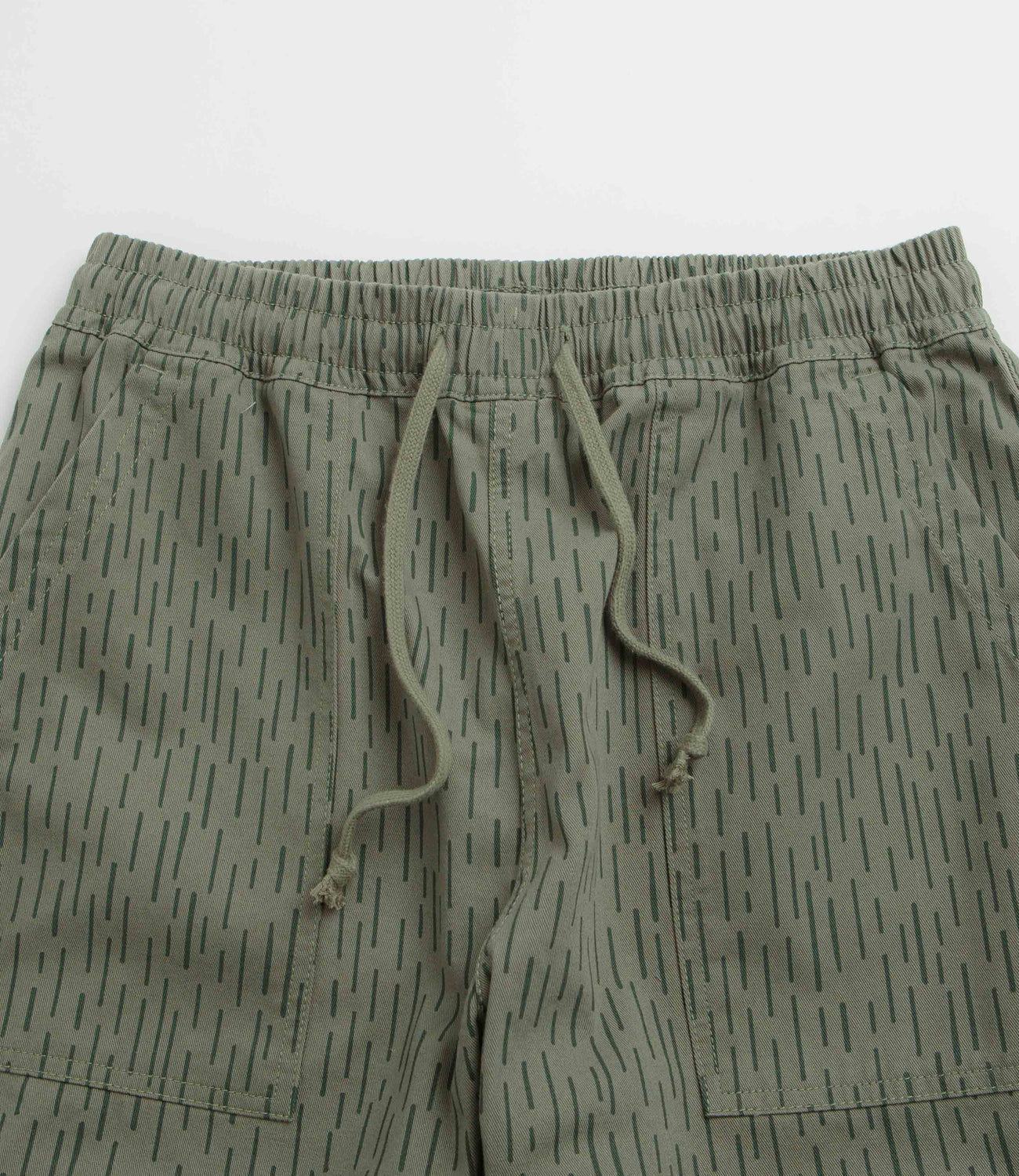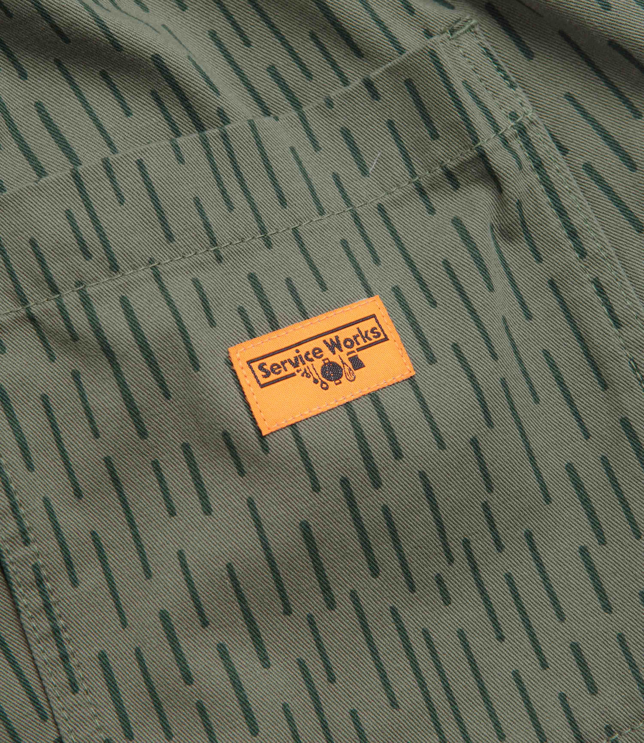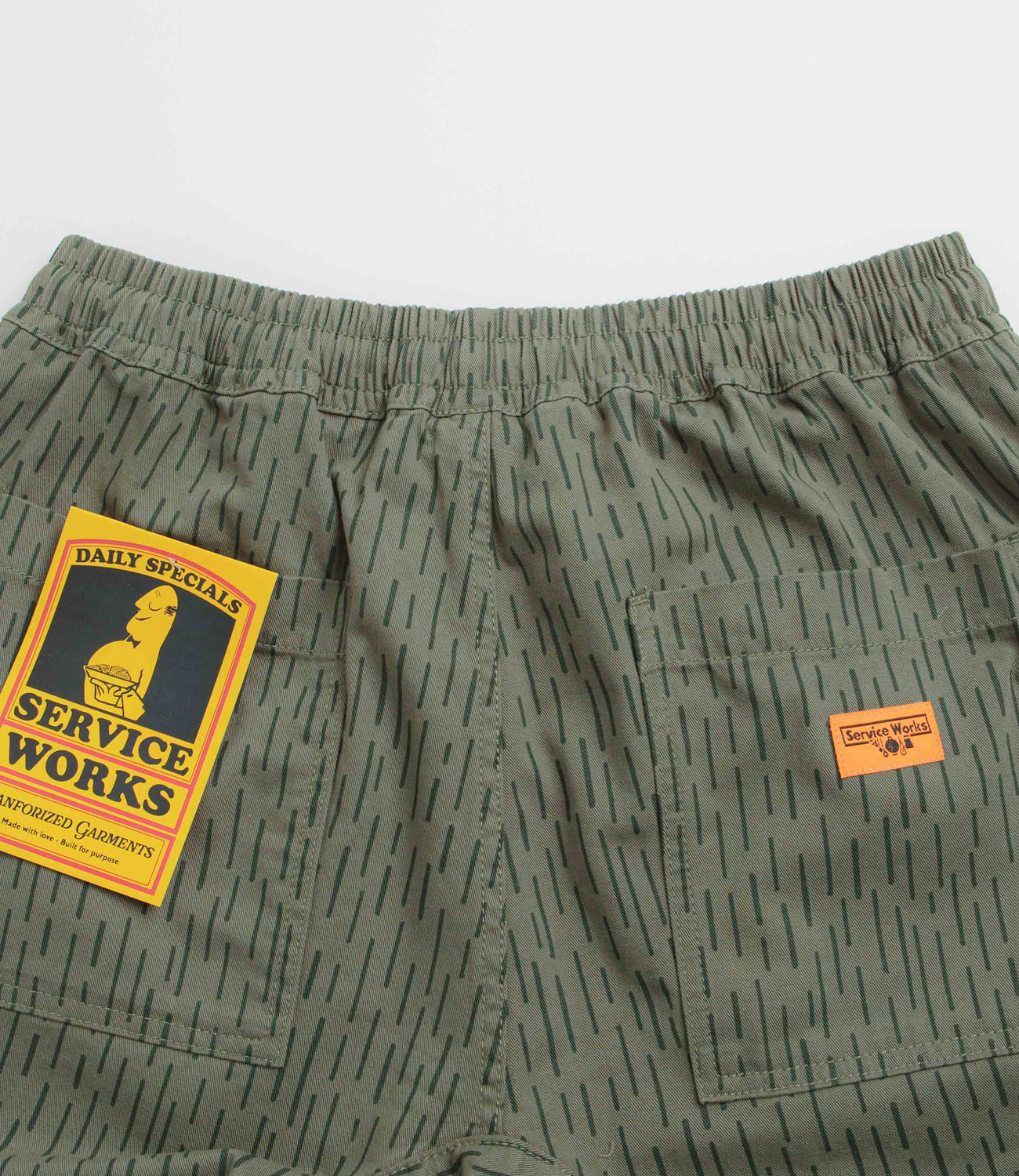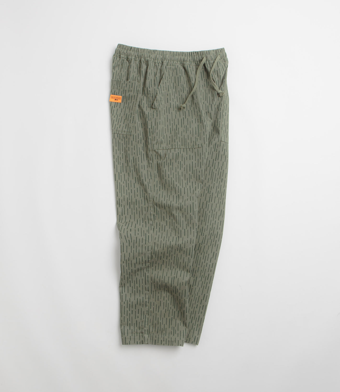 Service Works Raindrop Chef Pants in Green. Detailed with an all-over pattern, these regular fitting Service Works pants are made from 100% cotton drill. Featuring an elasticated waistband and a reinforced crotch panel, these green Service Works pants are finished with two front pockets, two rear pockets and flag label branding.