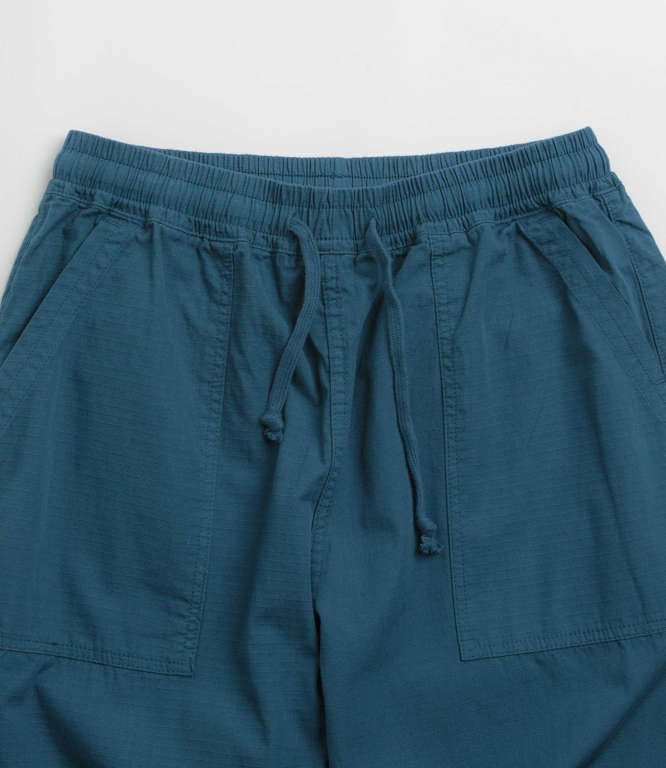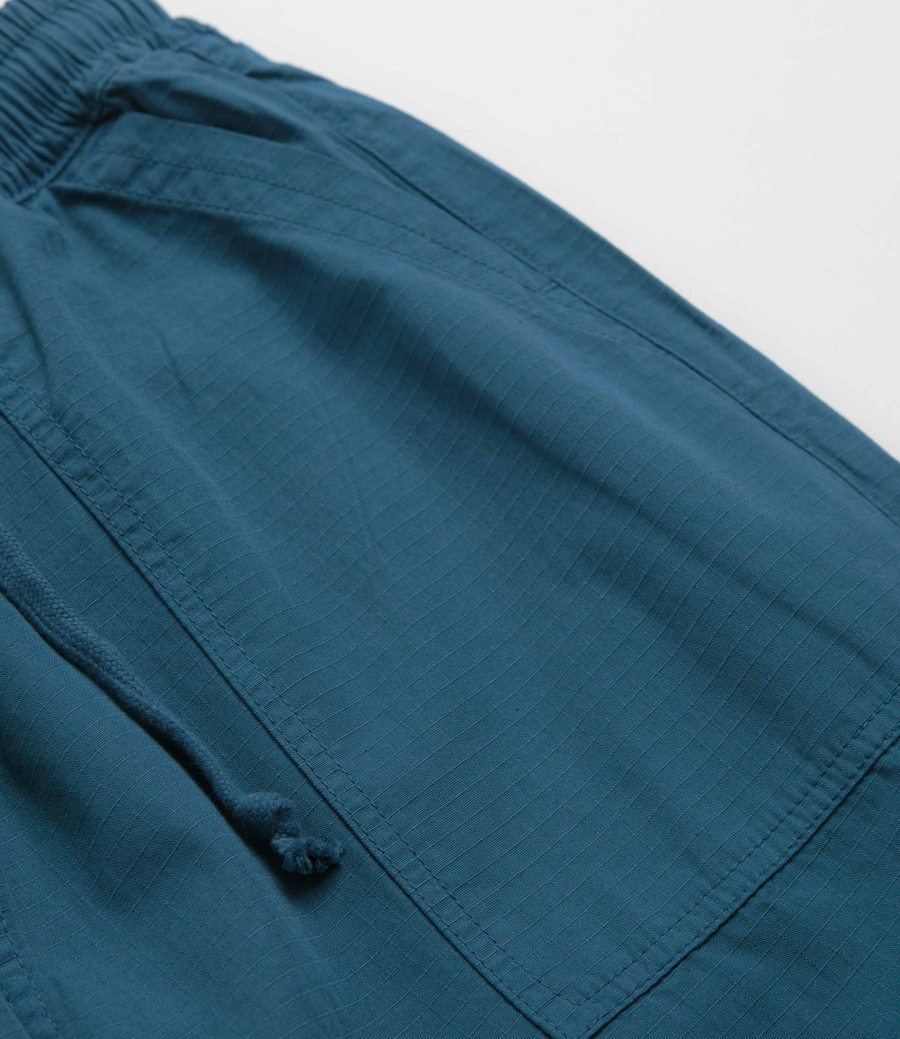 Service Works Ripstop Chef Pants in Ocean. Regular fitting and made from 100% cotton ripstop, these Service Works pants are designed with an elasticated drawstring waist. Garment dyed and finished in teal blue with a reinforced crotch panel, four pockets and flag label branding.