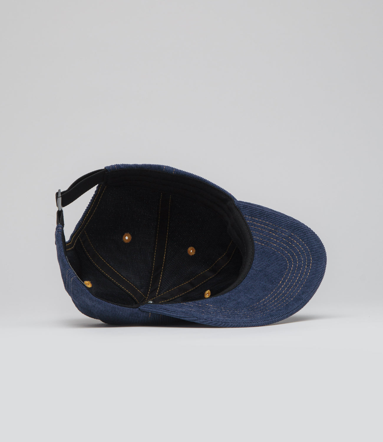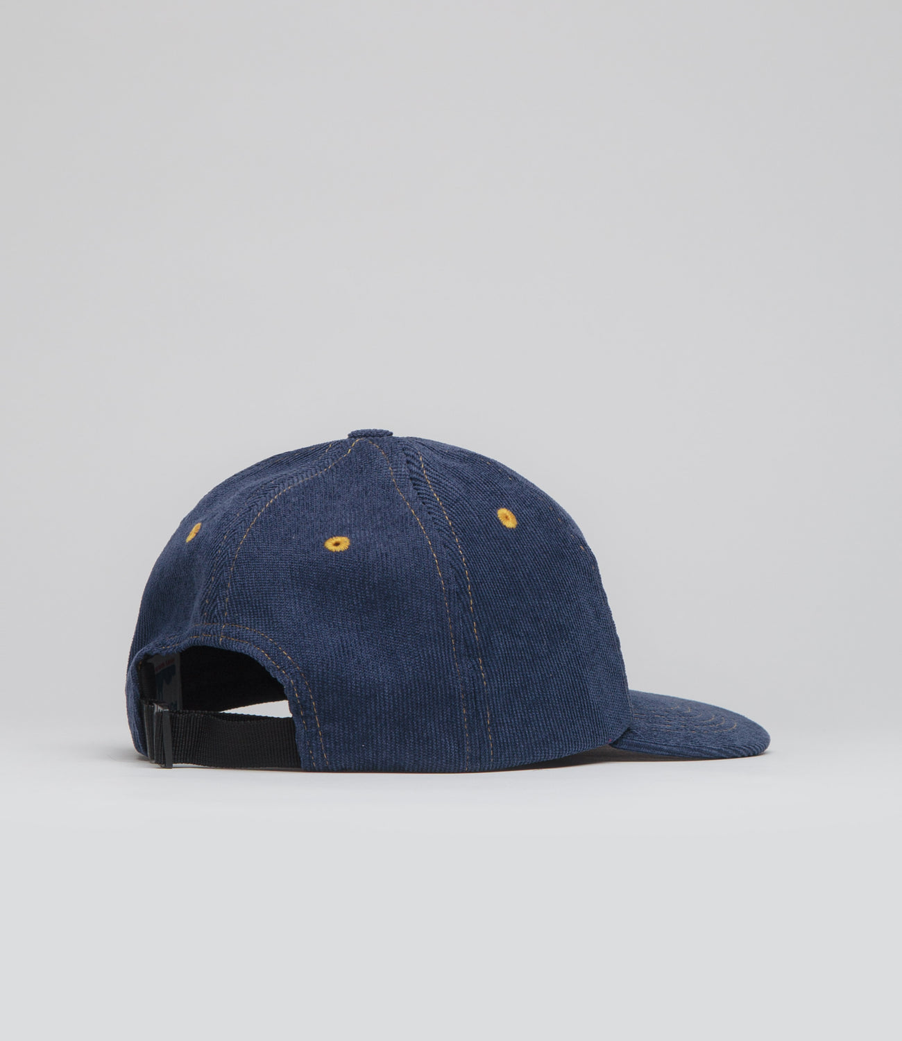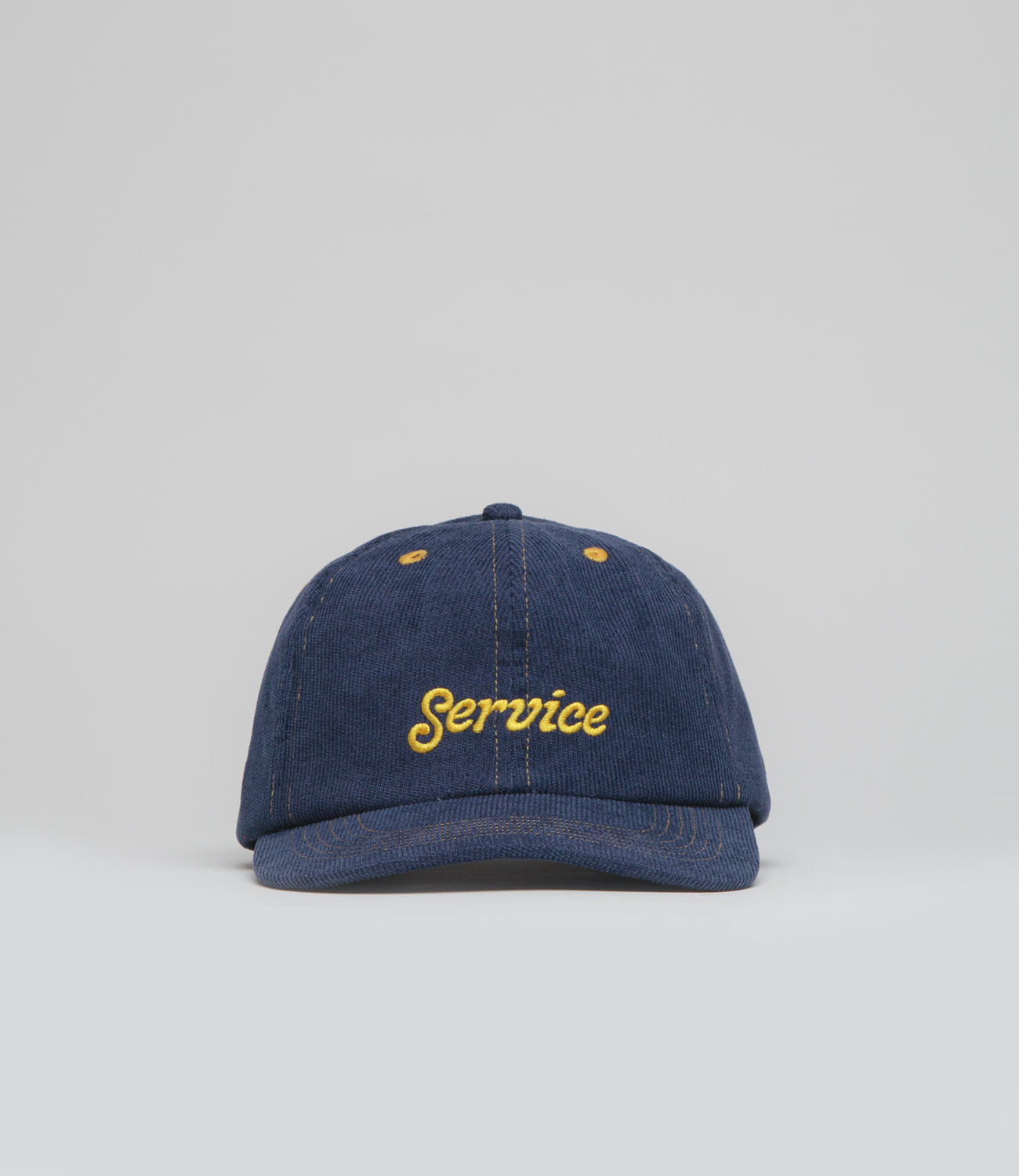 Service Works Script Cord Cap in Navy. Made from 100% cotton corduroy, this six panel Service Works cap is designed with contrast stitching and embroidered eyelets. Featuring a slightly curved peak and an adjustable rear fastening, this navy Service Works cap is finished with embroidered branding.