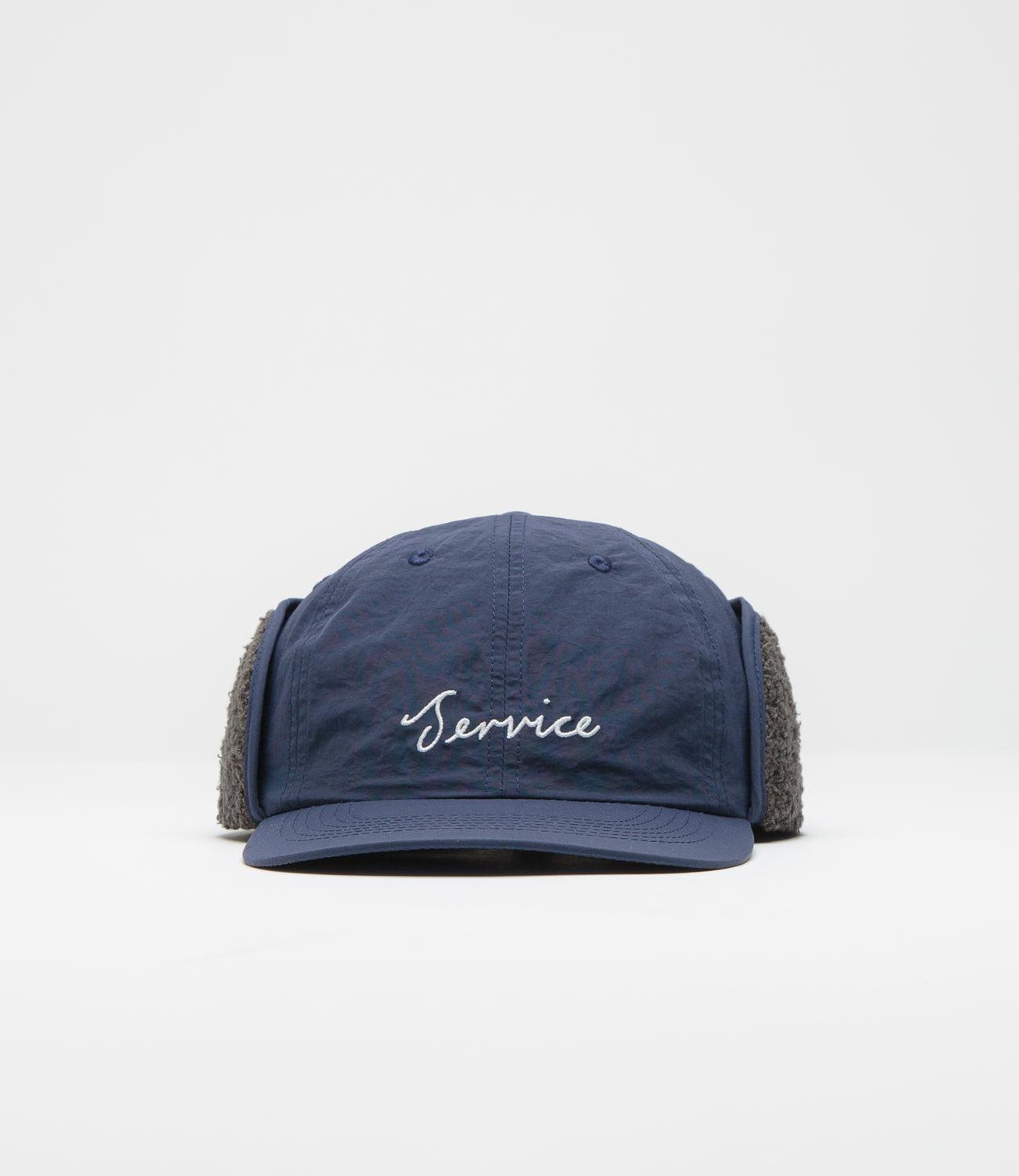Service Works Script Trapper Cap in Navy. Single sized and made from 100% nylon, this Service Works cap is designed with fleece-lined ear flap caps. Featuring a slightly curved peak and embroidered eyelets, this navy Service Works cap is finished with an elasticated rear fastening and embroidered branding.