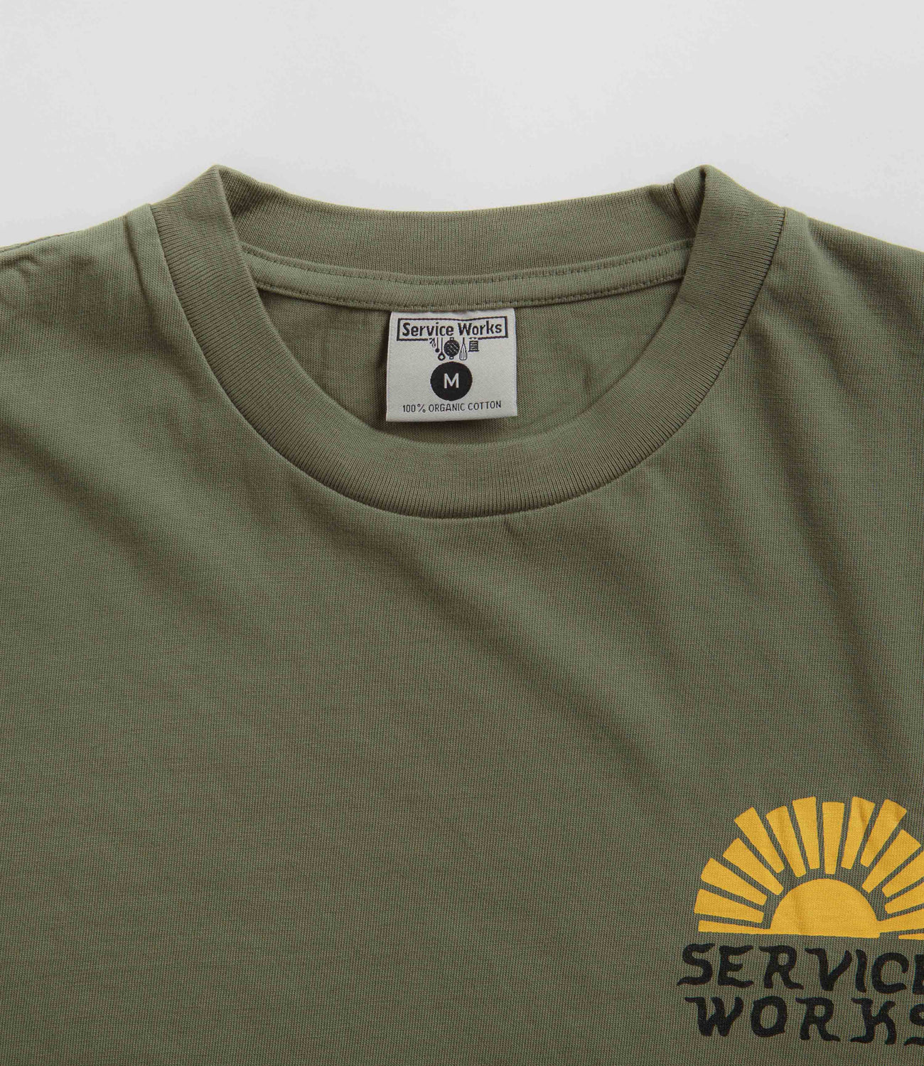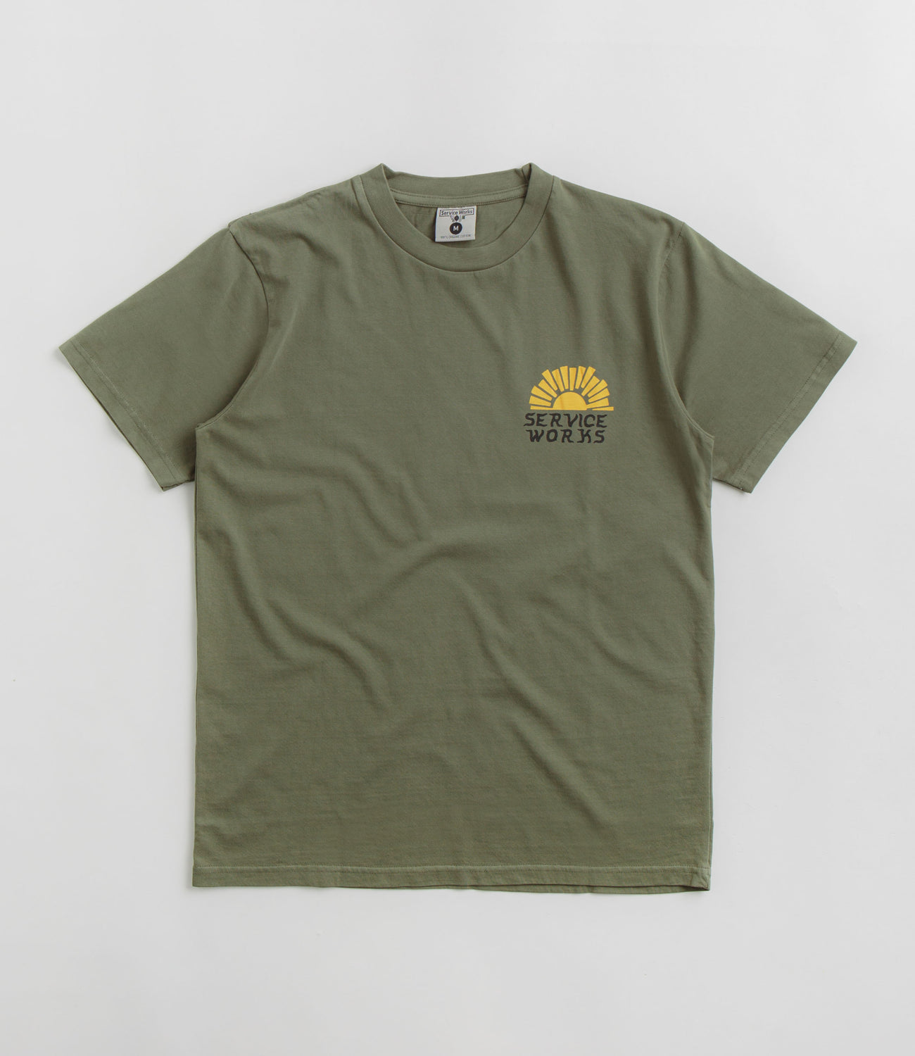 Service Works Sunny Side Up T-Shirt in Olive. Made from 100% organic cotton and garment dyed, this regular fitting Service Works t-shirt is designed with a set-in crew collar and a reinforced hem. Finished in a shade of olive green with a printed left chest graphic.