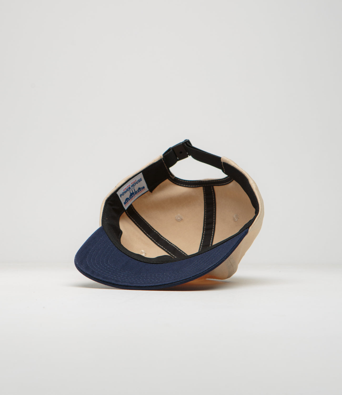Service Works Sunnyside Up Cap in Off-White and Navy. Single sized and made from 100% cotton, this two tone Service Works cap is designed with a custom fit and low profile. Featuring embroidered airflow eyelets and an adjustable nylon fastening, this off-white and navy Service Works cap is finished with embroidered crown detailing.