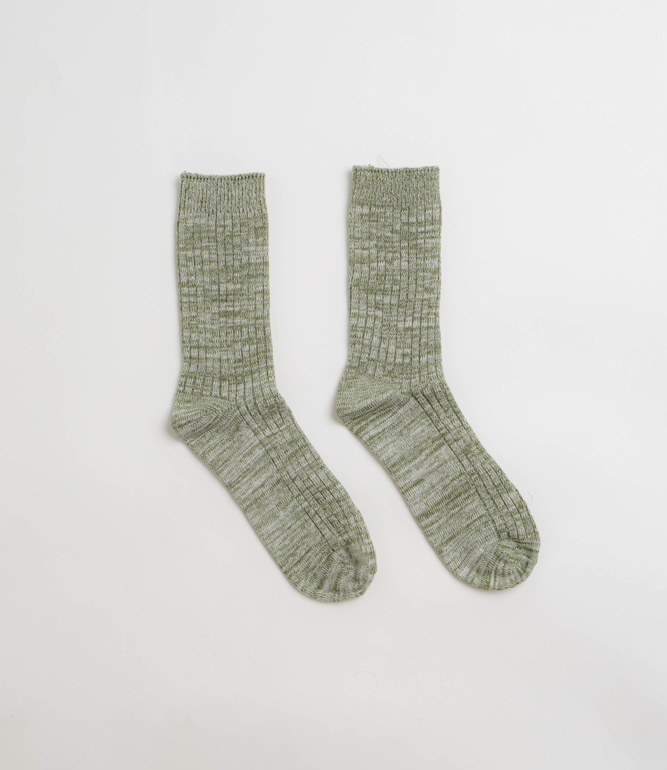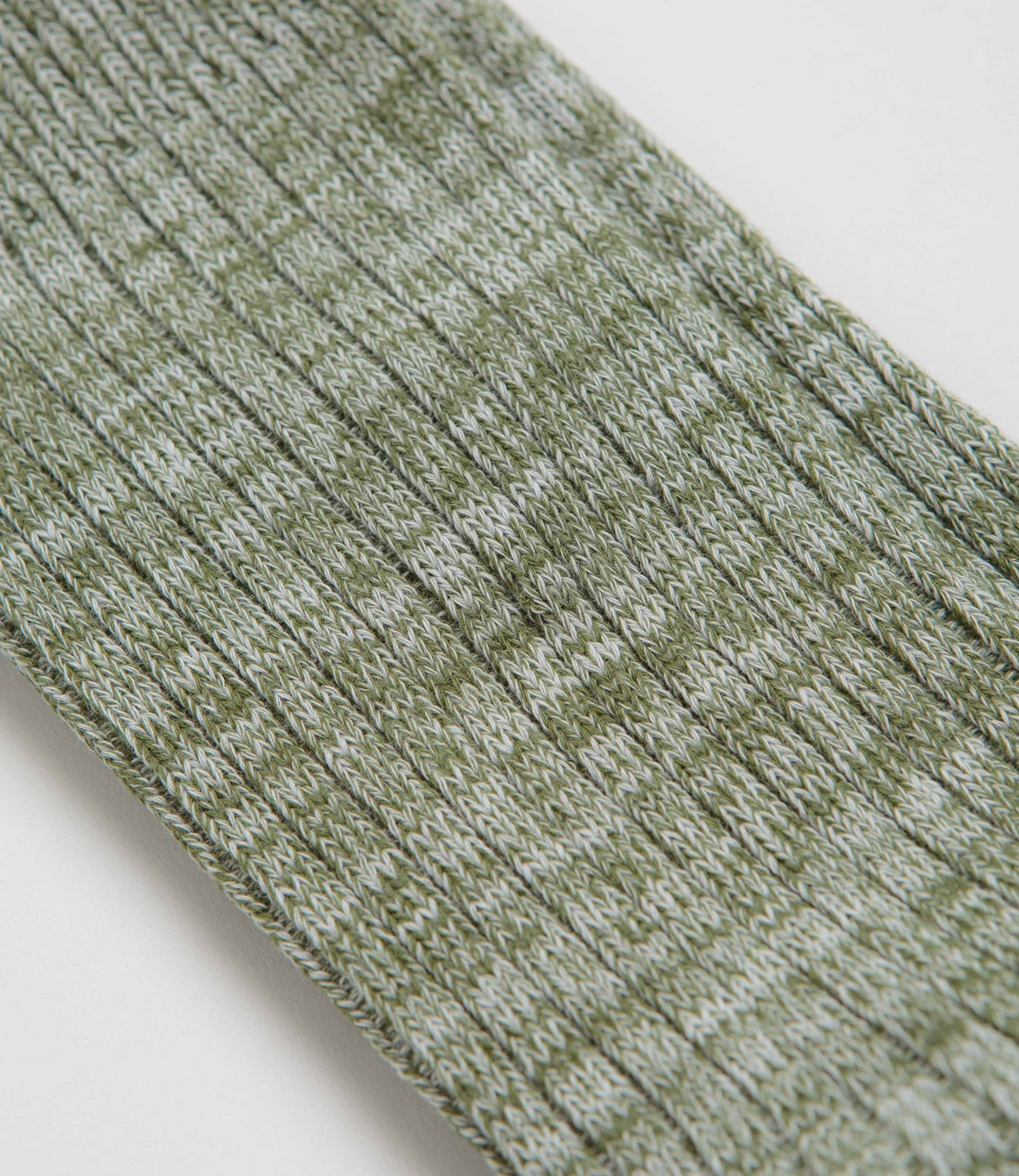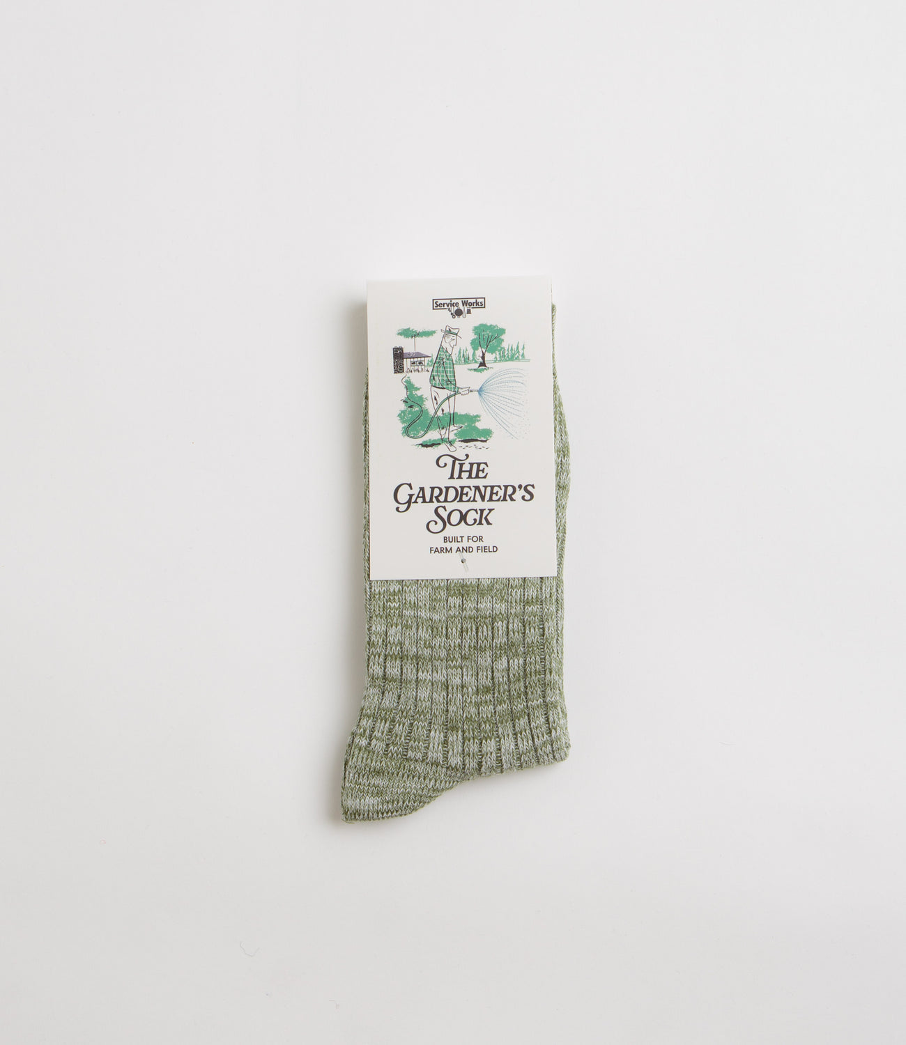 Service Works The Gardener's Socks in Green. Single sized and made from a cotton-lycra blend, these Service Works socks are designed with ribbed cuffs and a flecked pattern. Finished in green with contrast woven detailing.