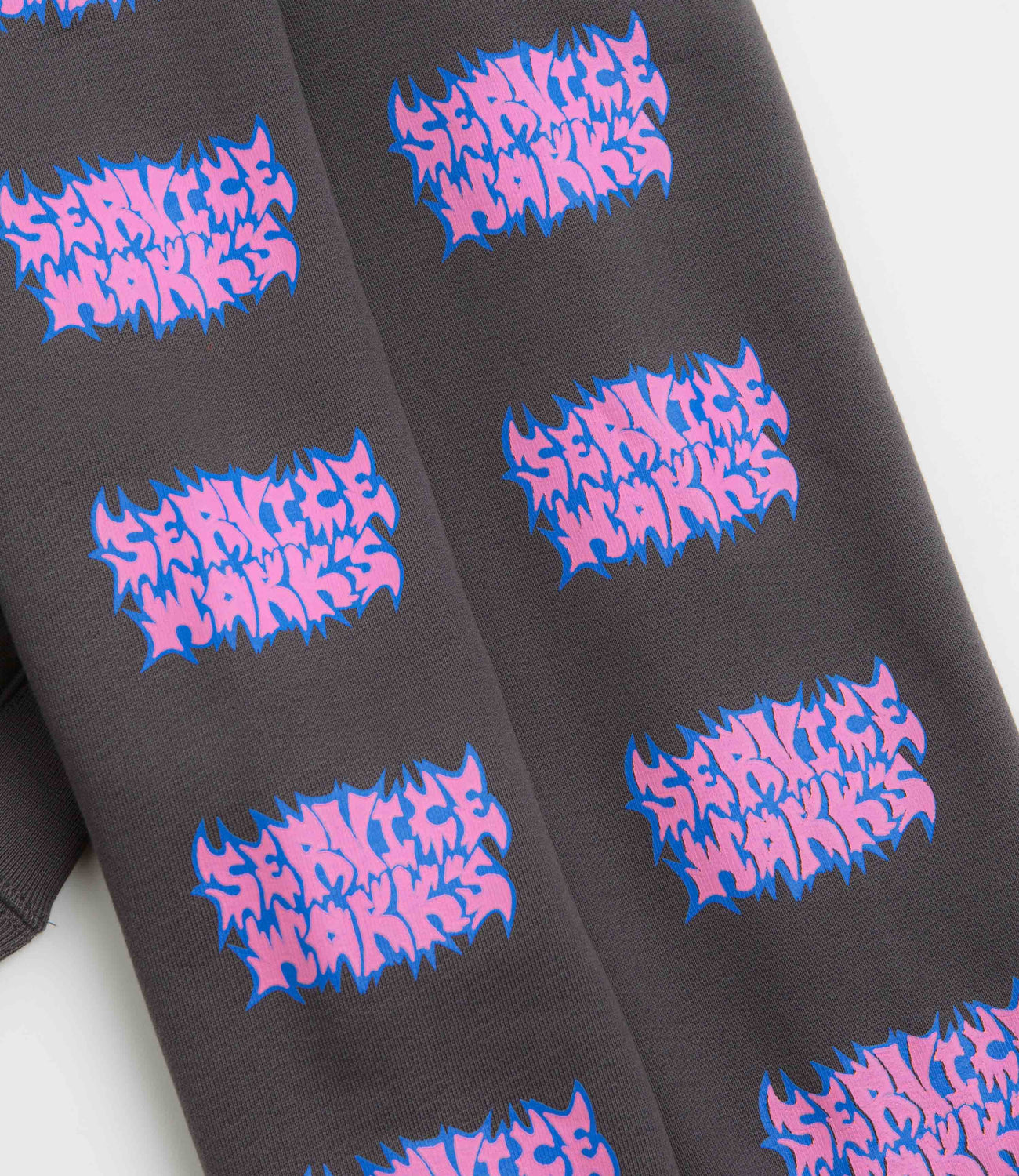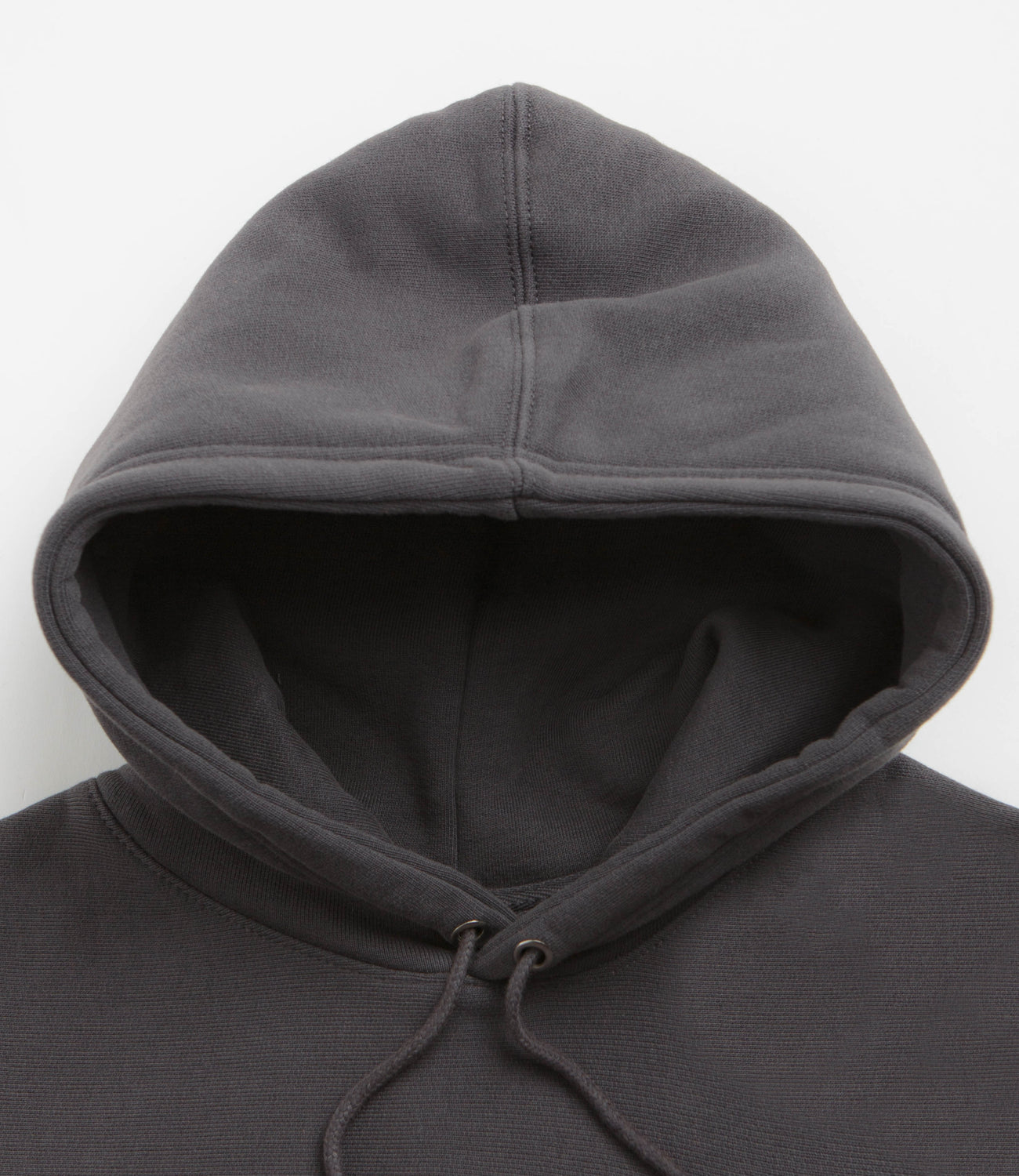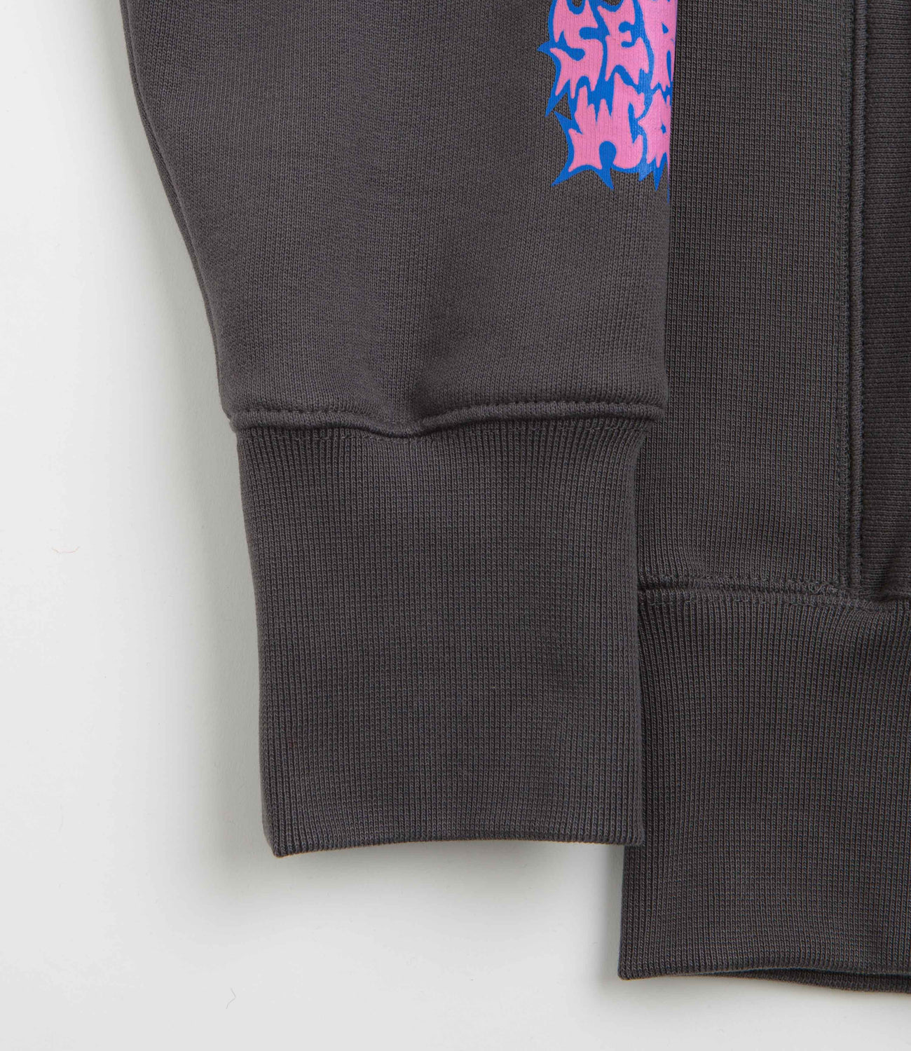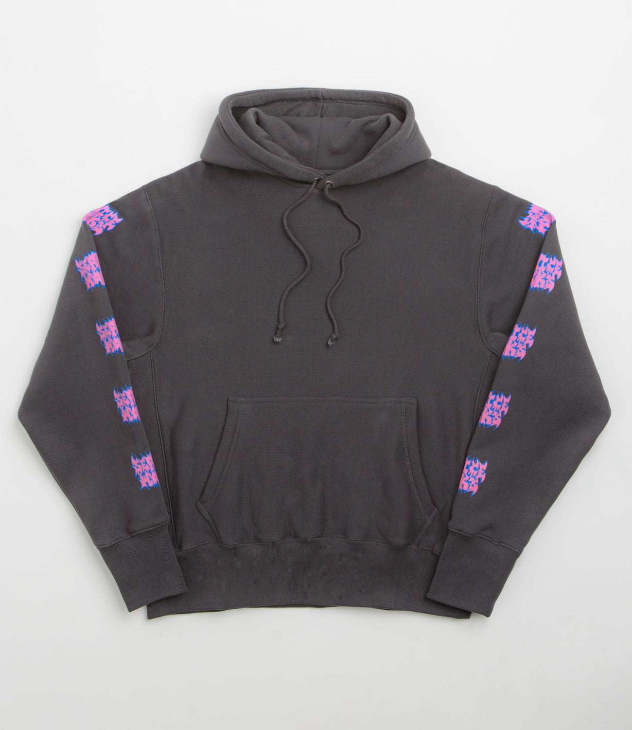 Service Works Thrash Hoodie in Asphalt. Regular fitting, this Service Works hoodie is made from 100% organic cotton with an adjustable drawstring hood. Featuring a garment dye, a kangaroo front pocket and ribbed cuffs, this black grey Service Works hoodie is finished with hand screen printed sleeve graphics.