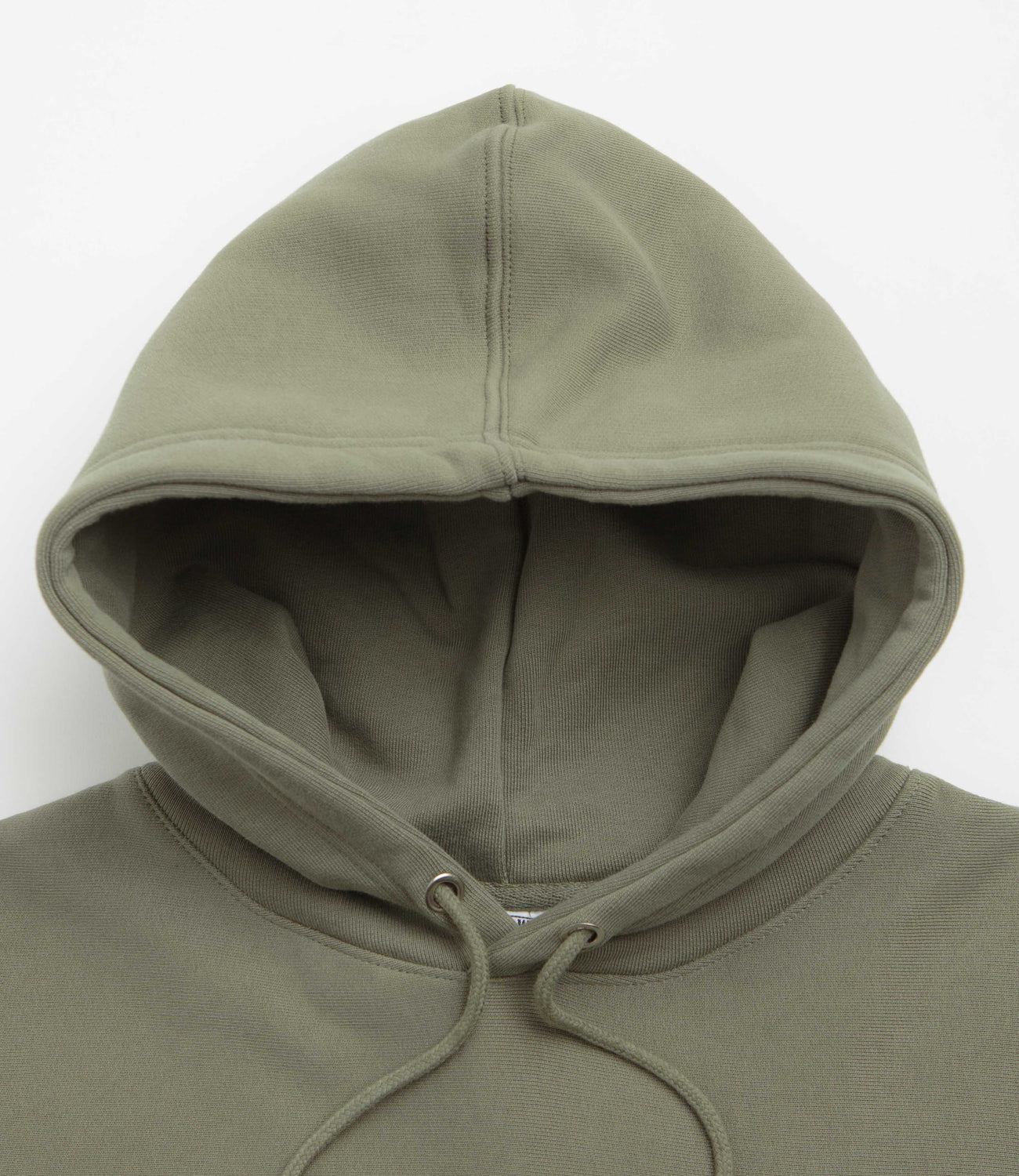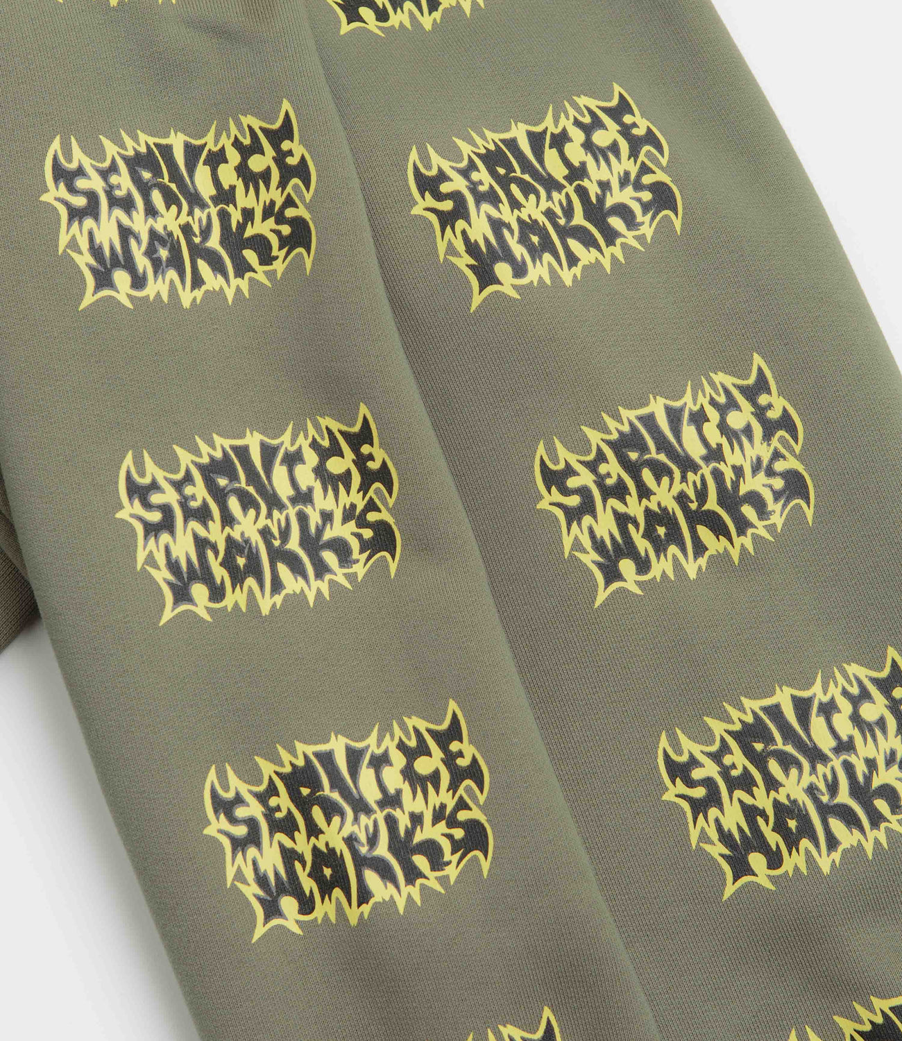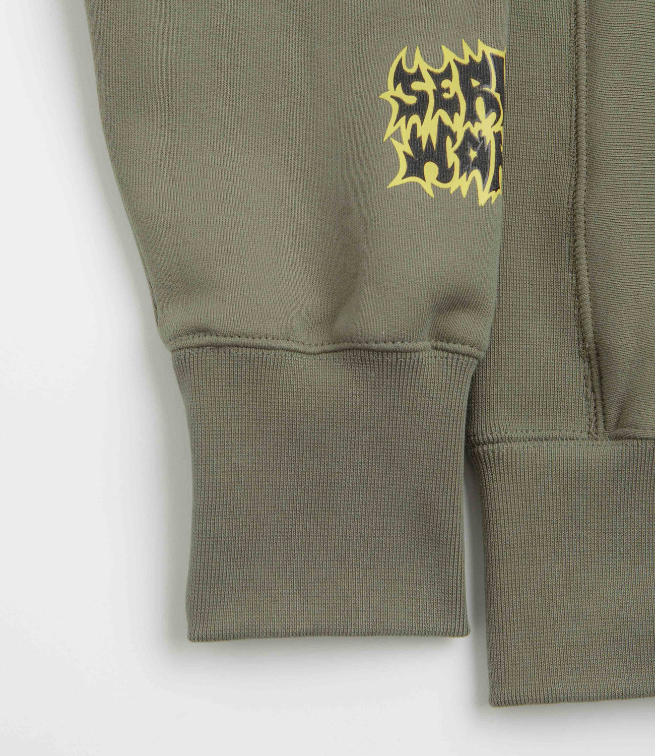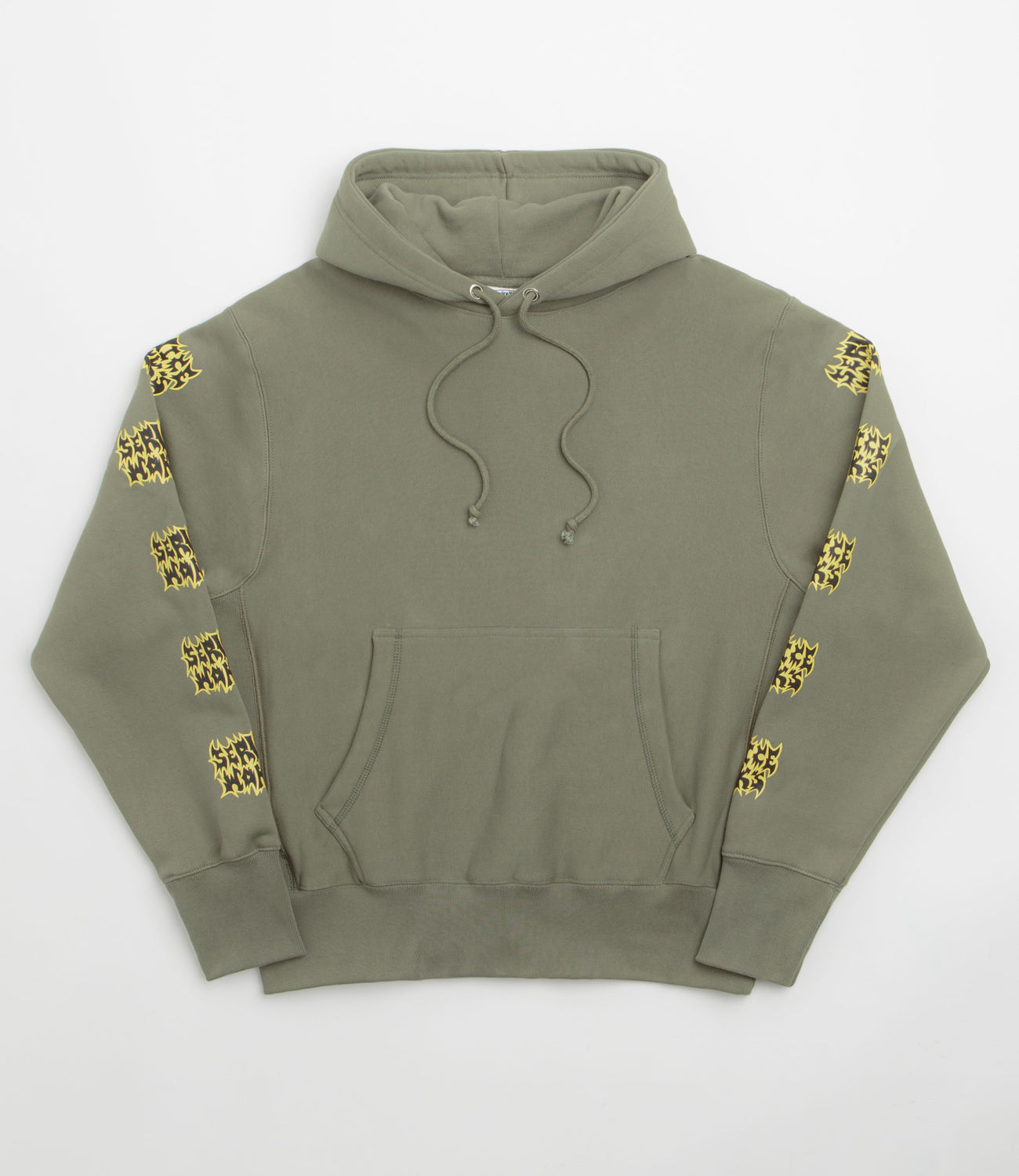 Service Works Thrash Hoodie in Olive. Made from 100% organic cotton, this garment dyed Service Works hoodie is designed with an adjustable drawstring hood. Featuring a kangaroo front pocket and ribbed cuffs, this olive green Service Works hoodie is finished with hand screen printed sleeve graphics.