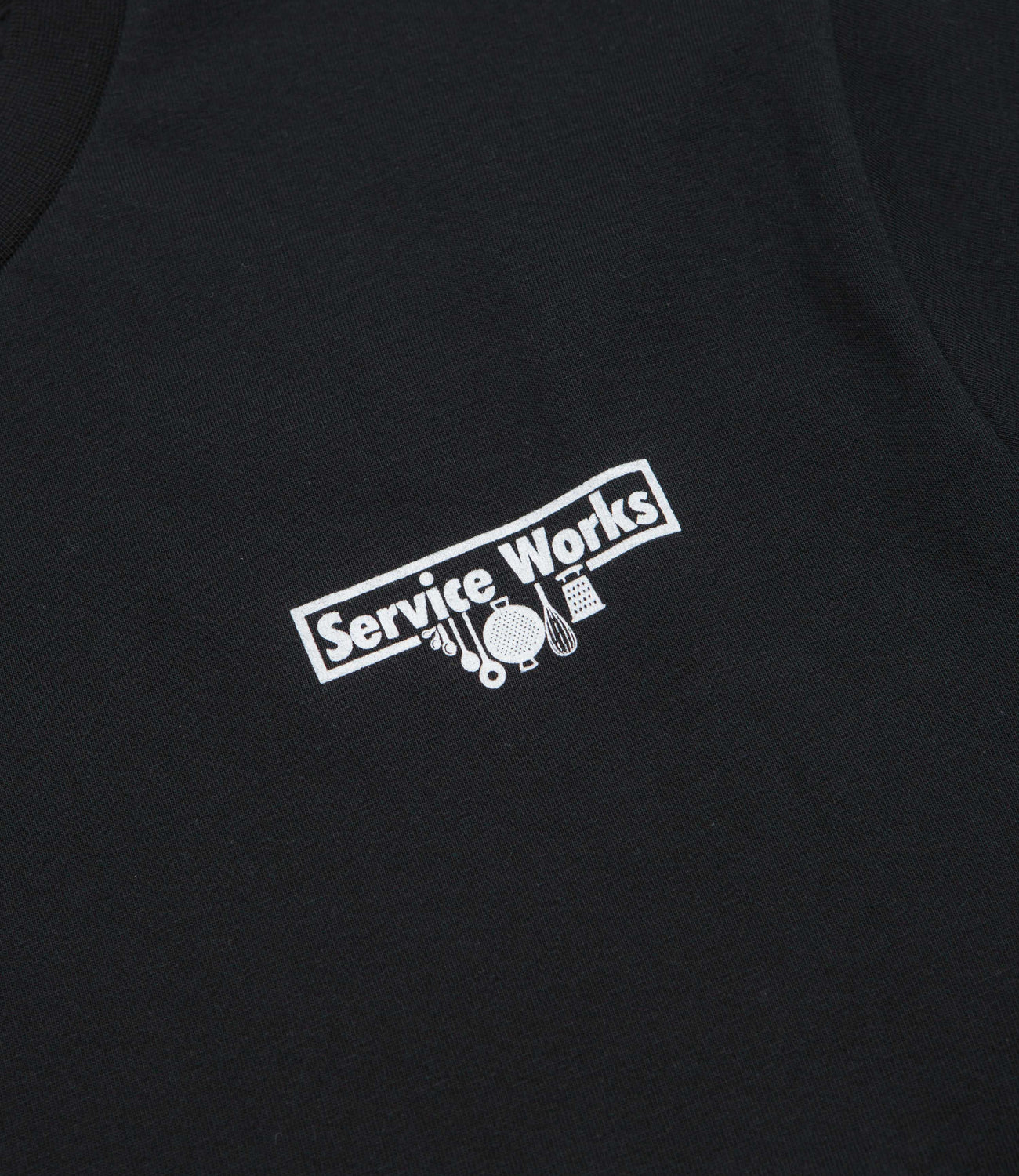 Service Works Trademark T-Shirt in Black. Regular fitting, this block tone Service Works t-shirt is made from 100% cotton. Finished in black with a classic crew collar, a straight hem and a screen printed graphic.