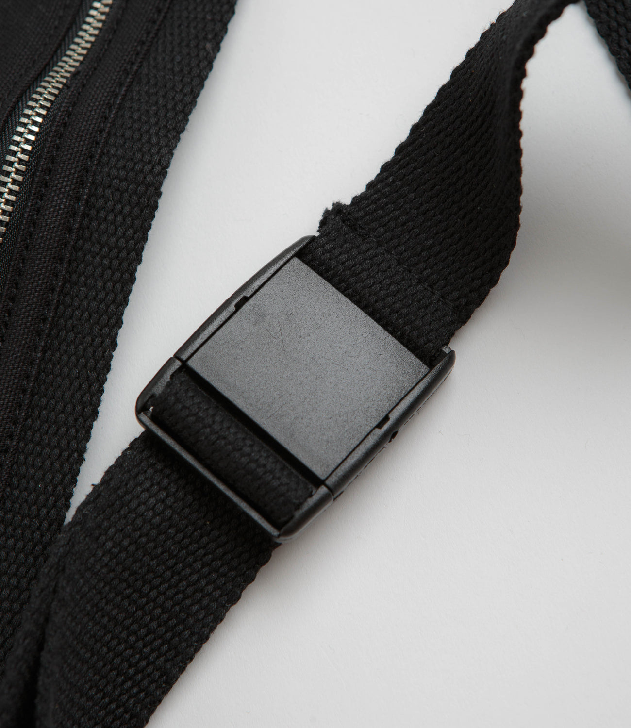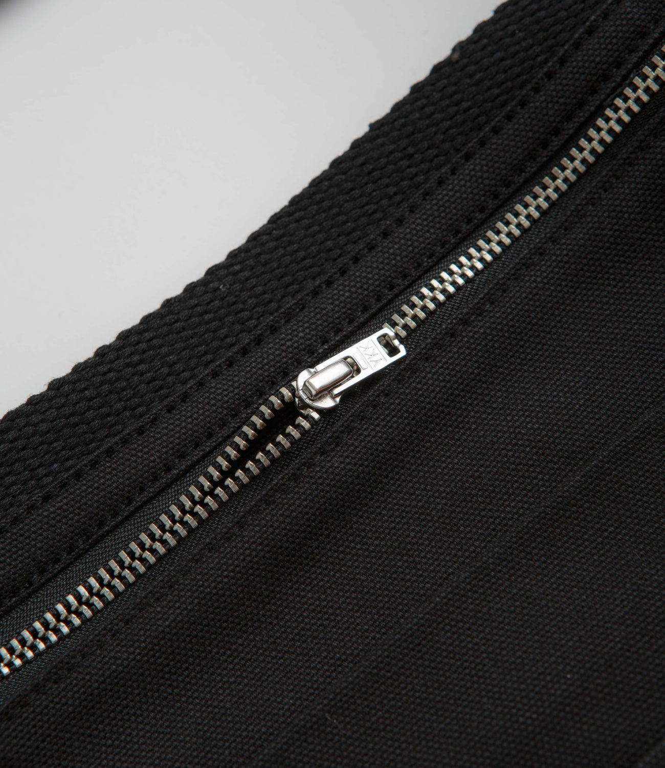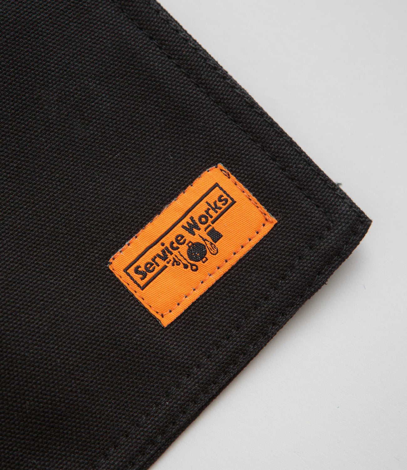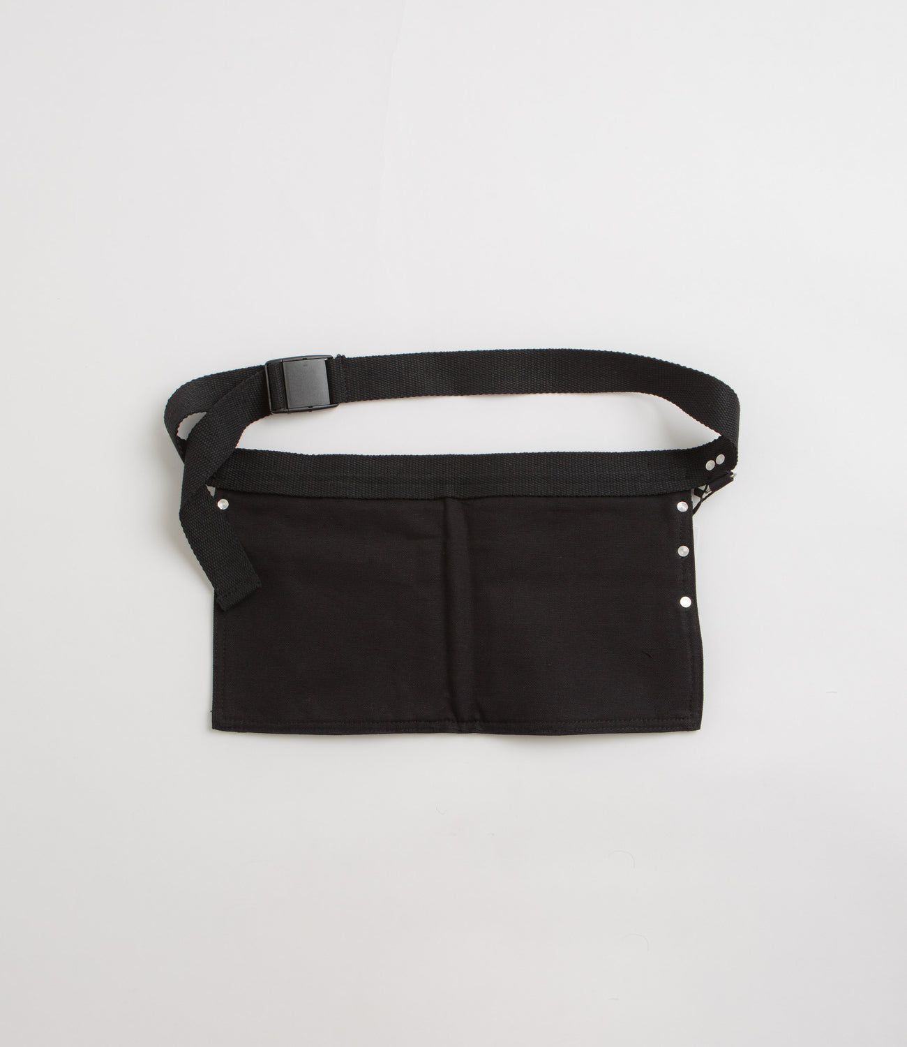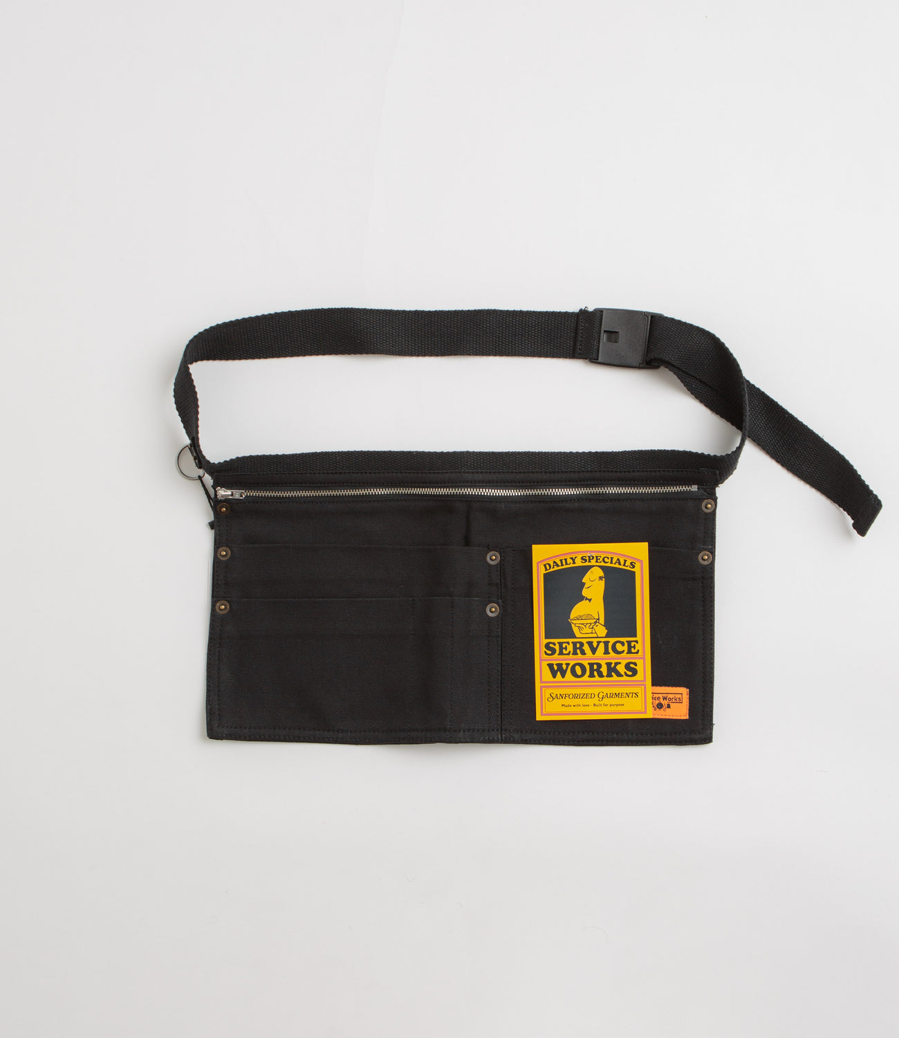 Service Works Utility Belt in Black. Made from 100% organic cotton duck canvas, this heavyweight Service Works utility belt is designed with rivet details and a zipper fastening. Finished in black with an adjustable strap, additional front pockets and woven flag label branding.