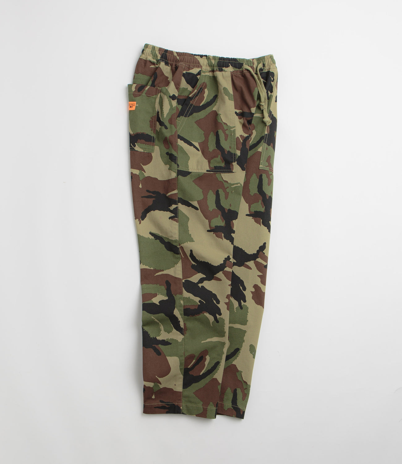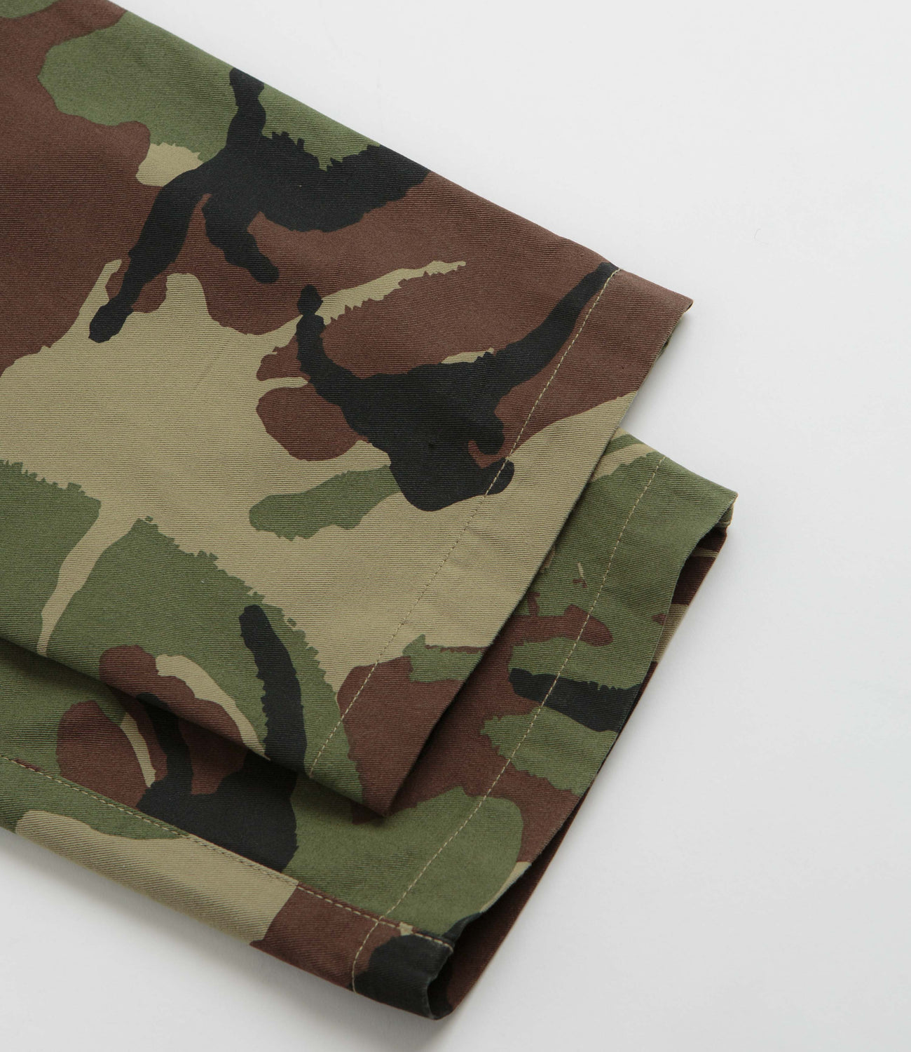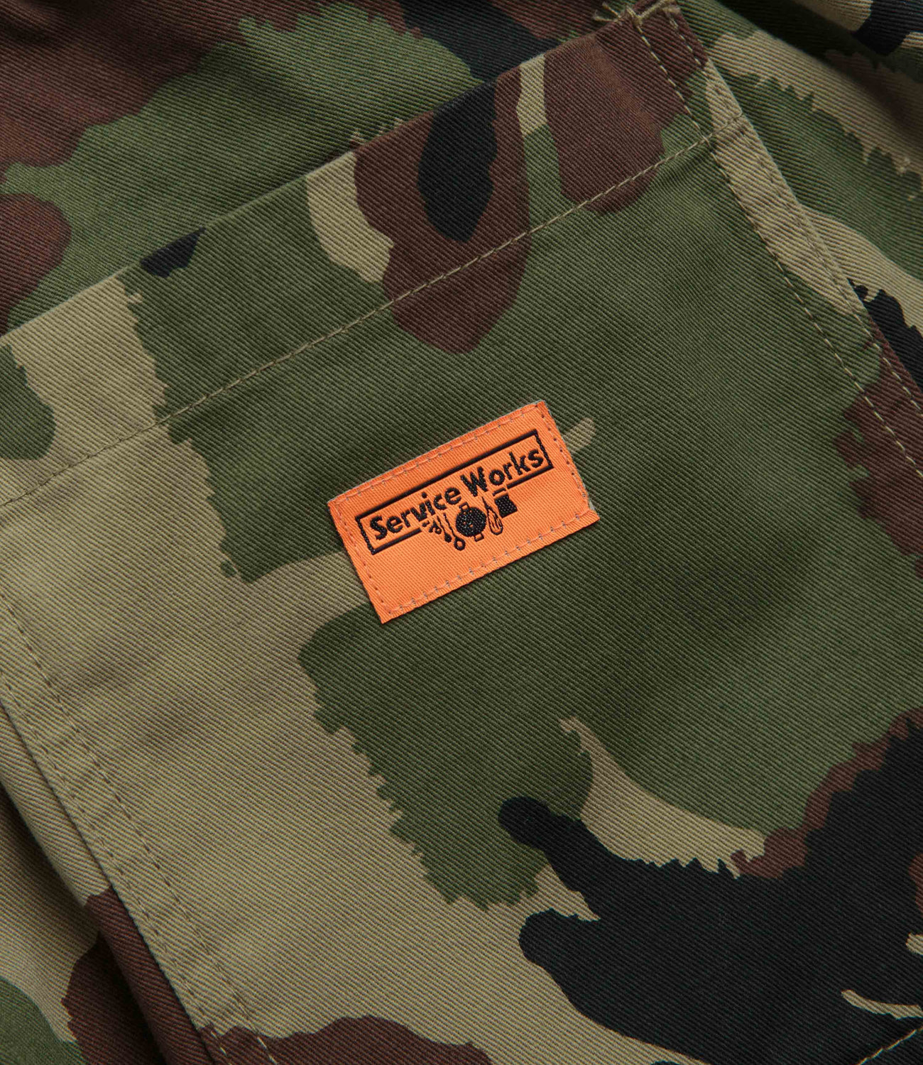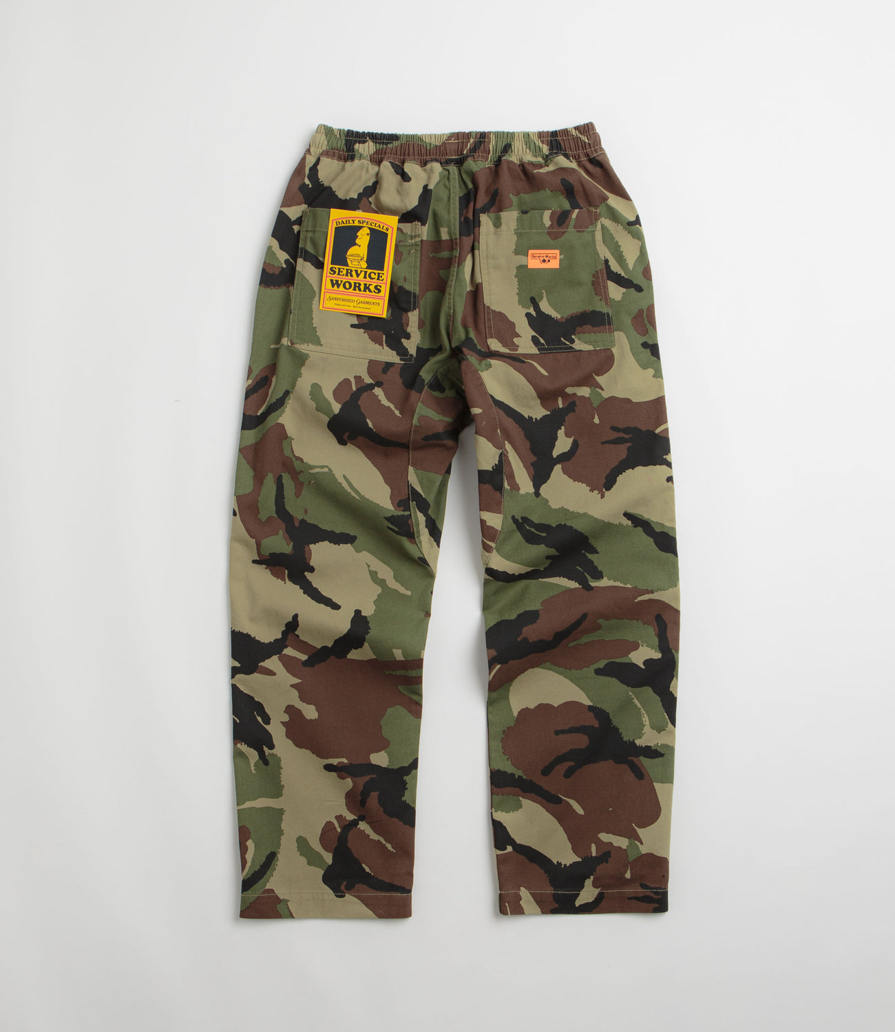 Service Works Woodland Chef Pants in Woodland. Detailed with an all-over camouflage pattern, these regular fitting Service Works pants are made from 100% cotton drill. Featuring an elasticated waistband and a reinforced crotch panel, these woodland green Service Works pants are finished with two front pockets, two rear pockets and flag label branding.