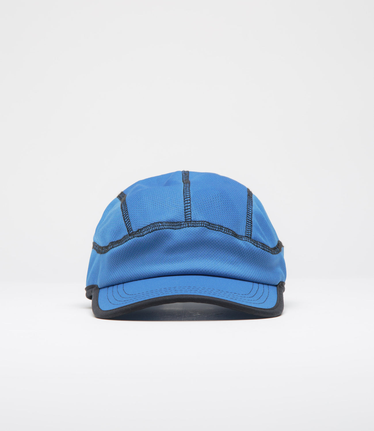 Sexhippies Trail Wind Cap in Azure Blue and Black. Made from micro-mesh fabric with contrast stitched seams, this Sexhippies cap is designed with a curved peak. Featuring an adjustable rear strap fastening, this blue Sexhippies cap is finished with an embroidered rear logo.