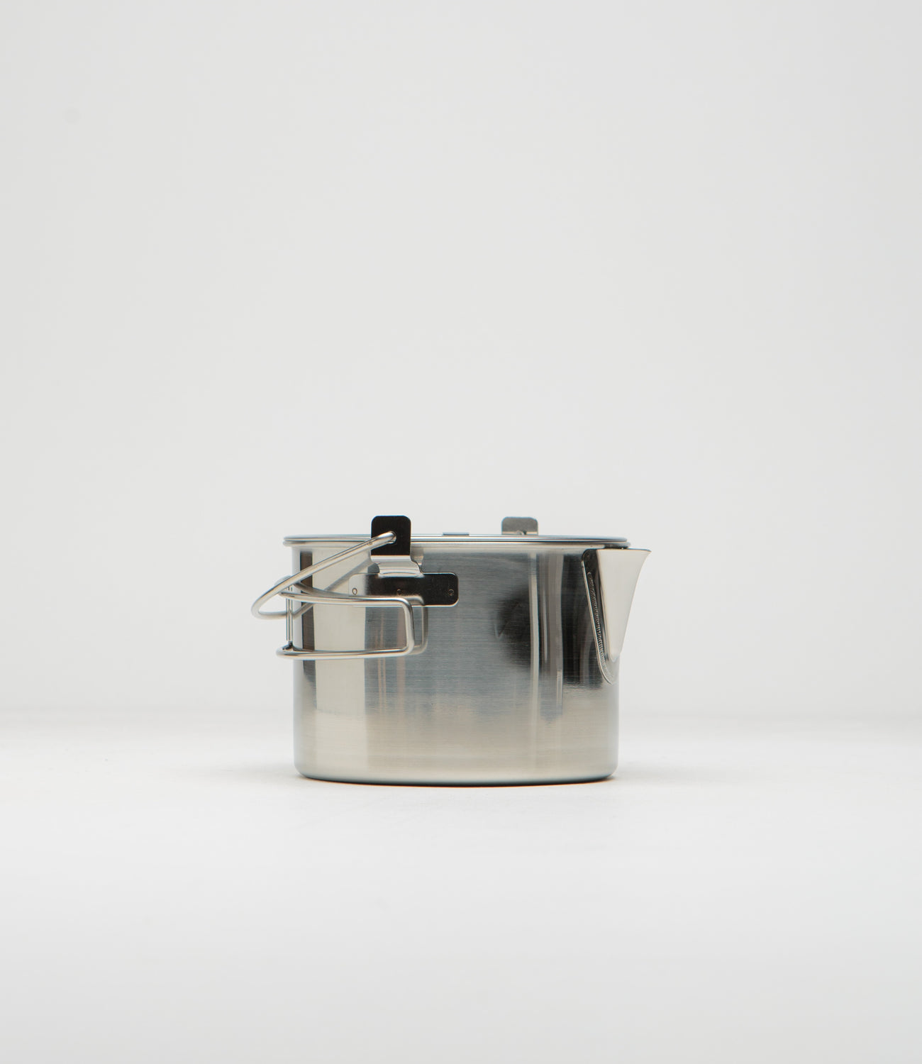 Snow Peak Kettle No.1 in Stainless Steel. Suitable for camping and travel use, this Snow Peak kettle is made from 100% stainless steel. Featuring foldable handles and a practical hanger loop, this steel Snow Peak kettle is finished with minimalist branding and with a corrosion-resistant construction.