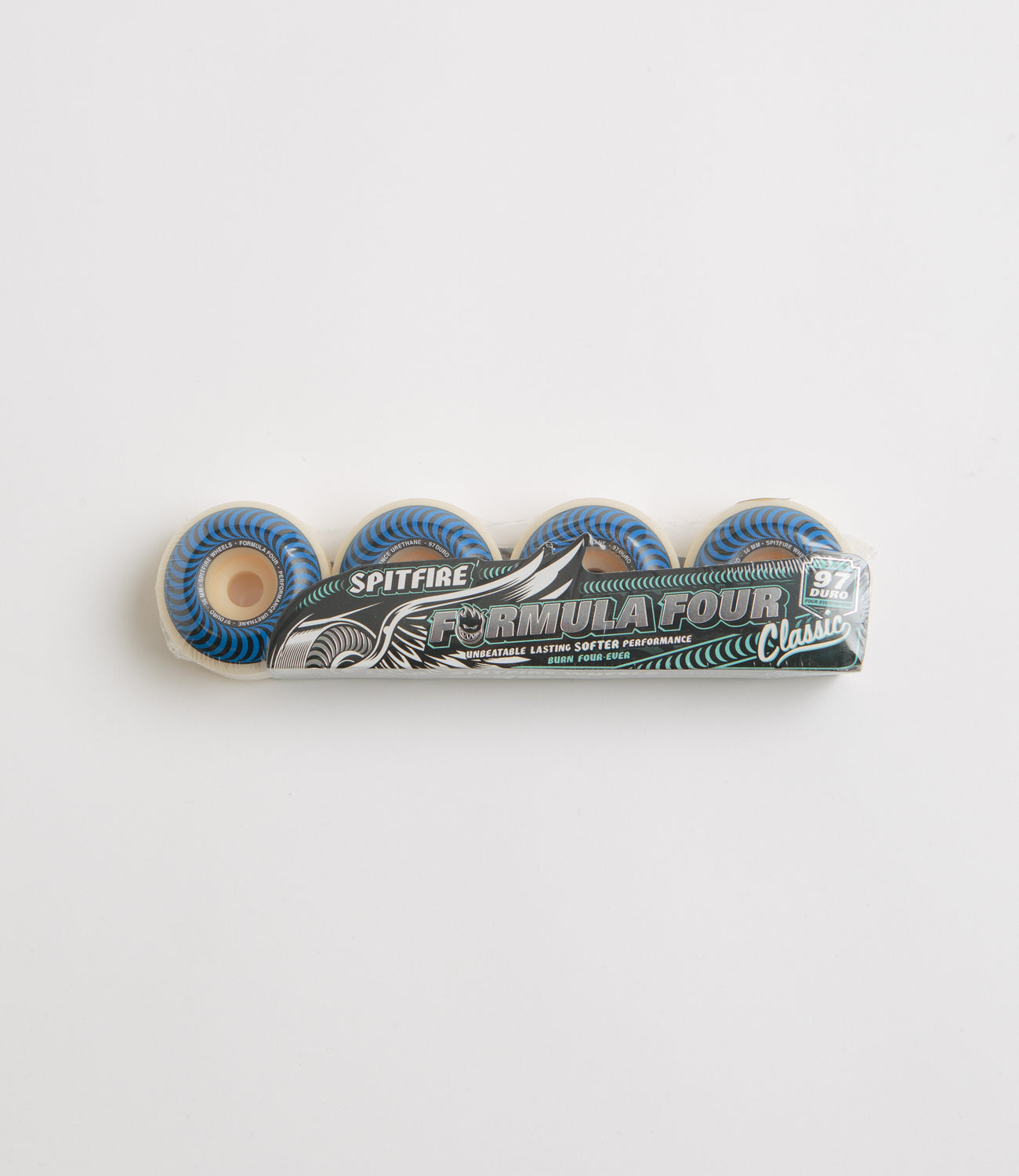 Spitfire Formula Four Classic 97DU Wheels in Natural and 56mm. Offering grip and slide where you need it, these Spitfire Formula Four wheels measure to 56mm and are made from 100% true performance urethane. Finished with a 97 durometer and with classic Spitfire lettering in black, curved around the centre.