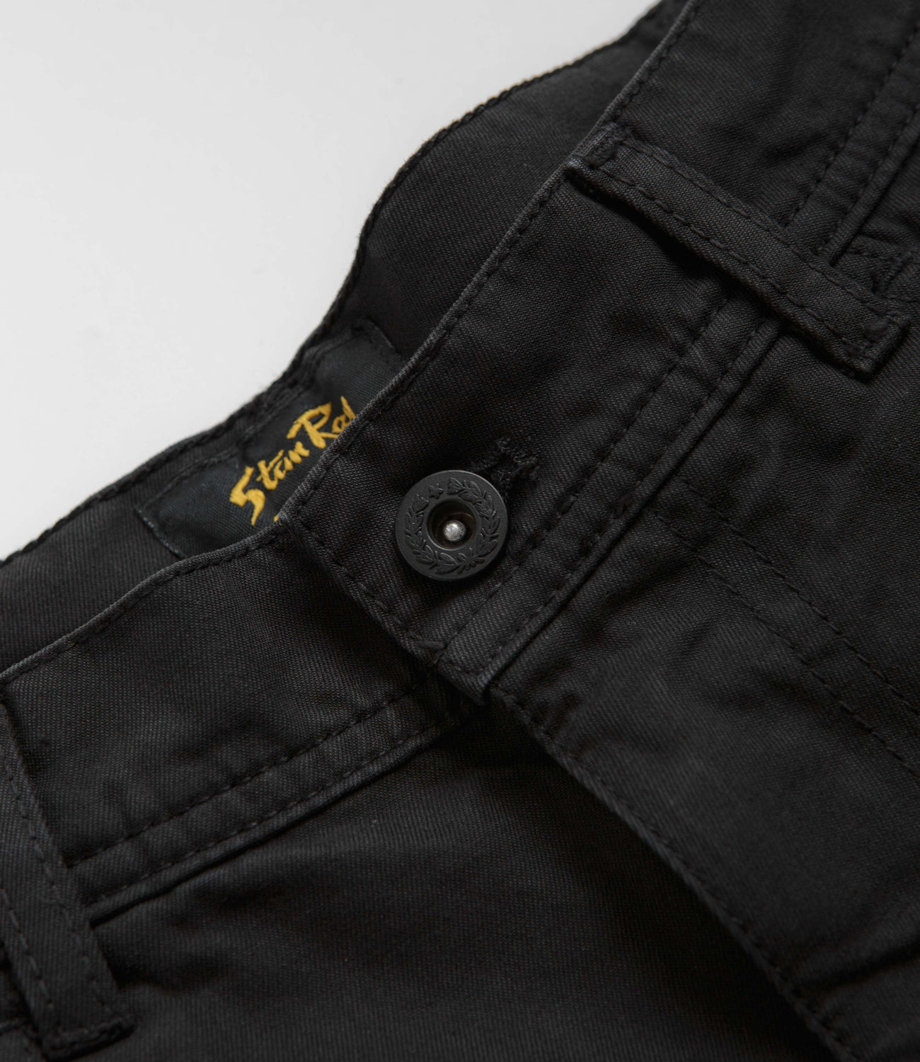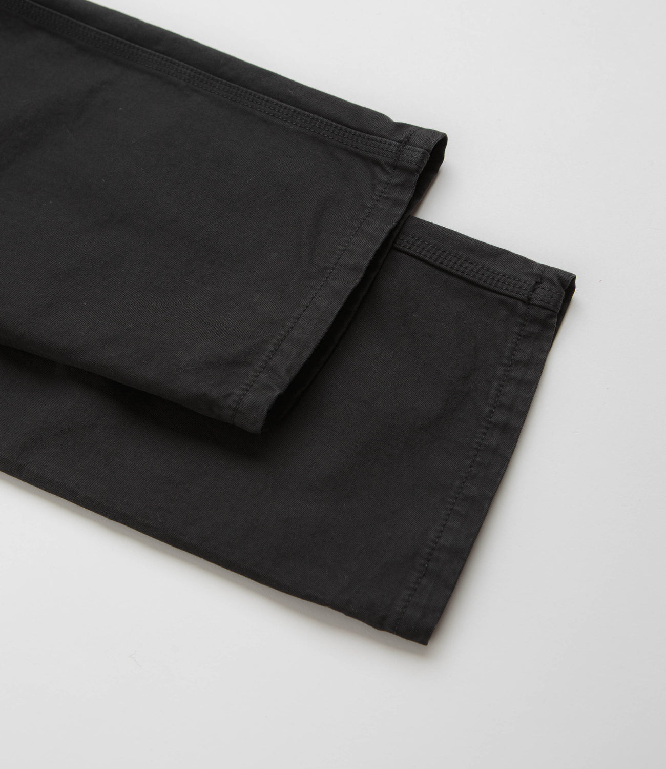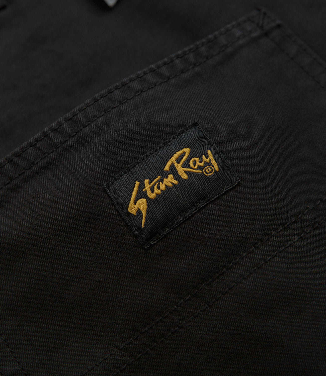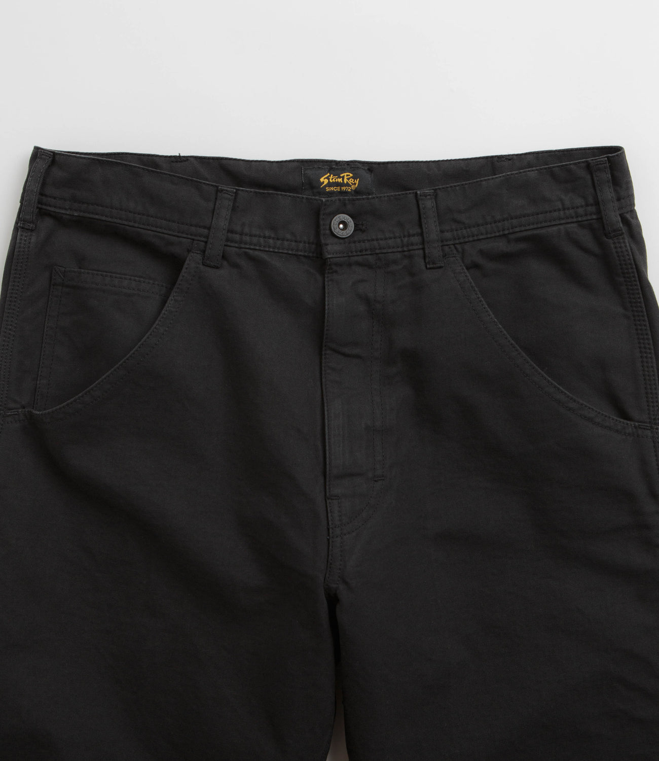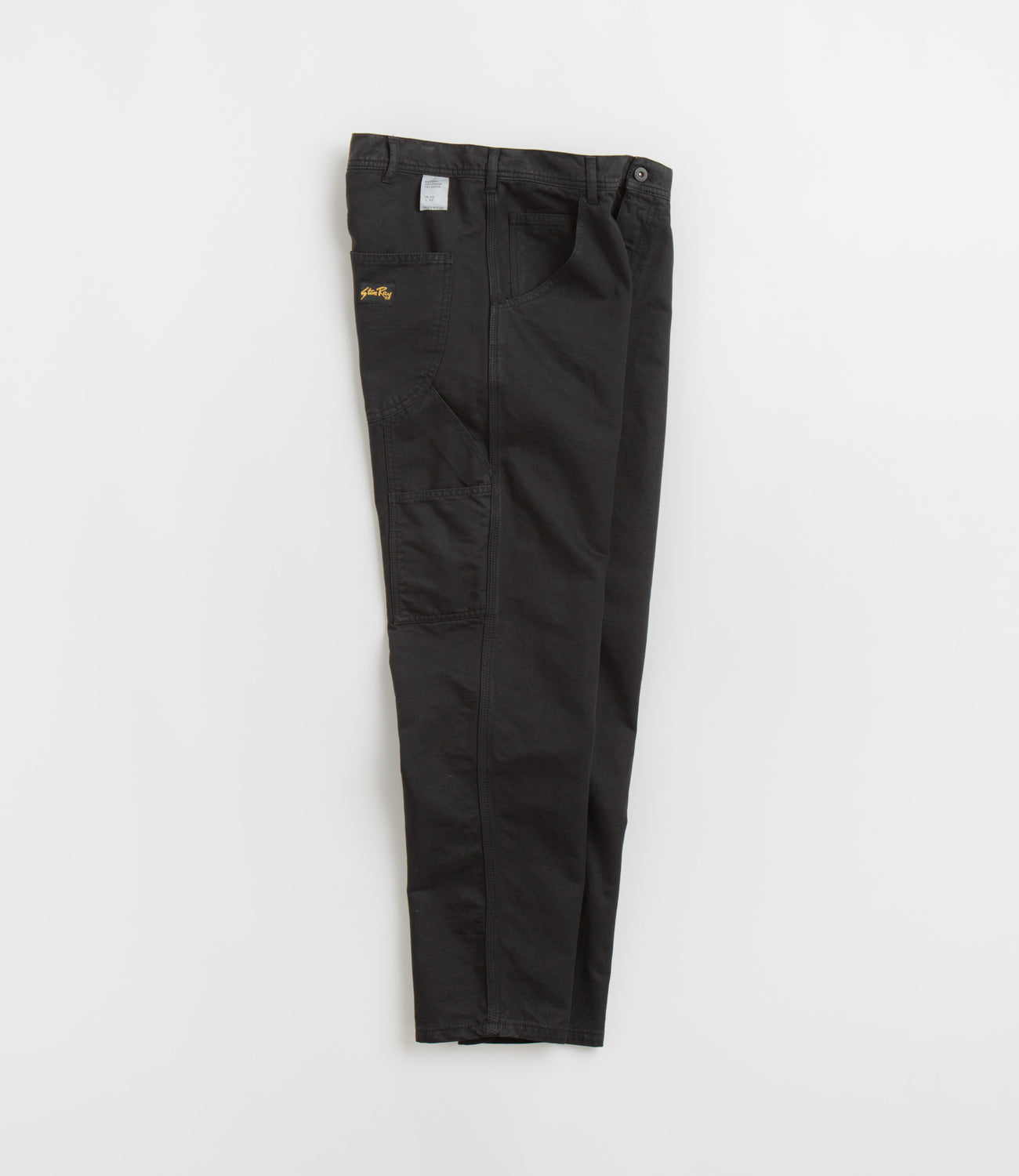 Stan Ray 80’s Painter Pants in Black Twill. An updated variant of the brand’s classic design to feature a slightly tapered leg and rounded back pockets, these bold black Stan Ray pants arrive as a staple workwear inspired silhouette from the brand’s latest release. Crafted from 100% premium cotton for a resilient day-on-day wear, these regular fitting pants feature a woven belt loop waistband, a single button secured YKK zipper fly and triple chain stitched flat felled seams for increased structural support throughout. Two side entry pockets are asymmetrically mirrored by a single right side coin stash, whilst a left leg hammer loop is complemented by additional utility pockets to honour its utilitarian design. Signed off with bar-tacked stress points and with embroidered ‘Stan Ray’ tab label detailing sewn across the rear right pocket for added textured depth.