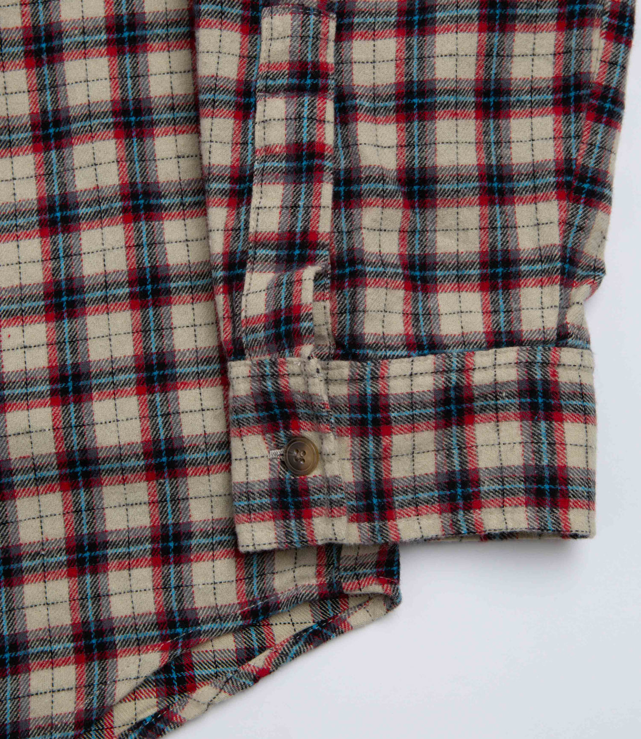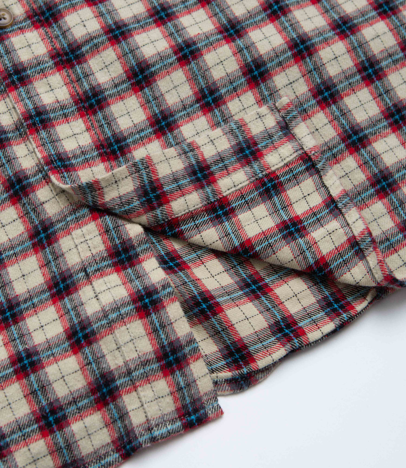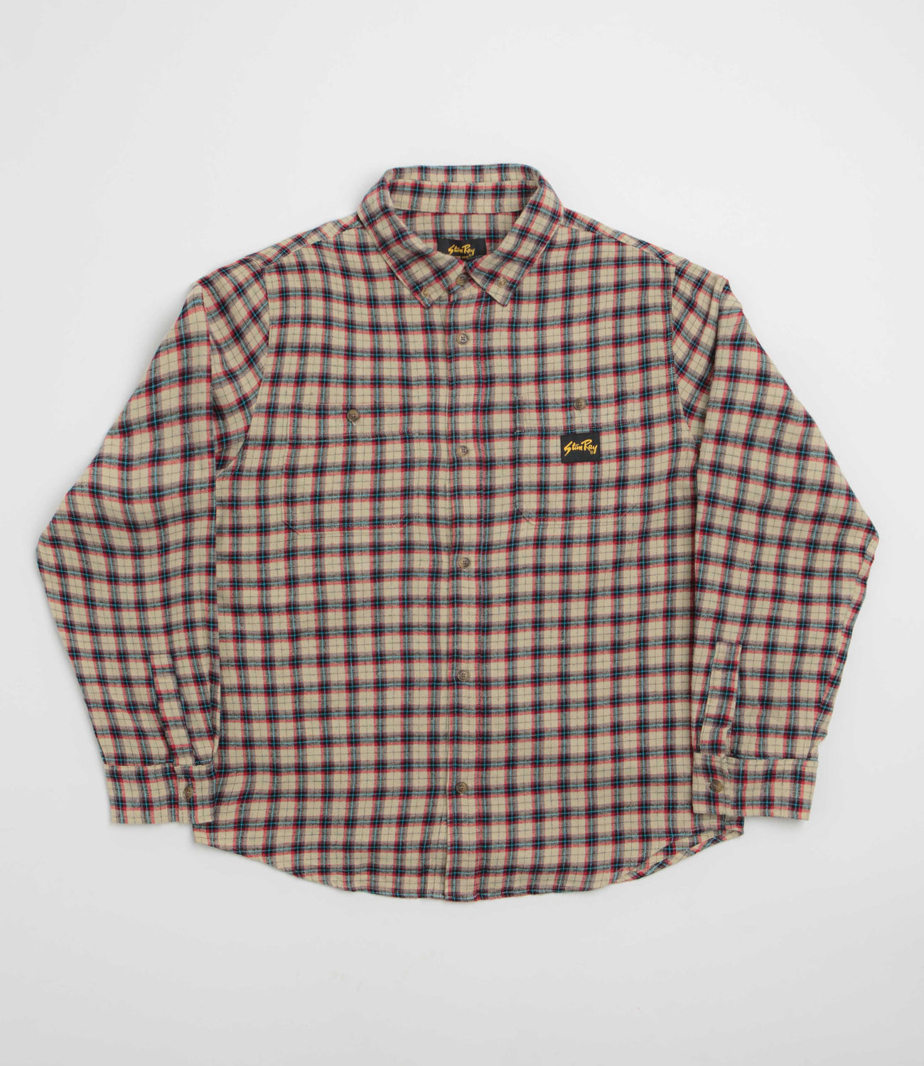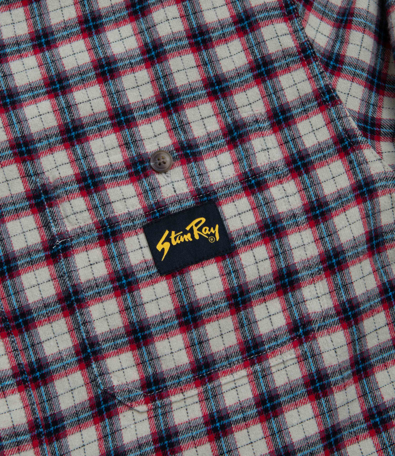 Stan Ray Flannel Shirt in Easy Natural Plaid. Relaxed fitting with an all-over plaid pattern, this Stan Ray shirt is made from 100% cotton. Featuring a button-down collar, a full length button fastening and two chest pockets, this burgundy beige Stan Ray shirt is finished with buttoned cuffs, a curved hem and flag label branding.