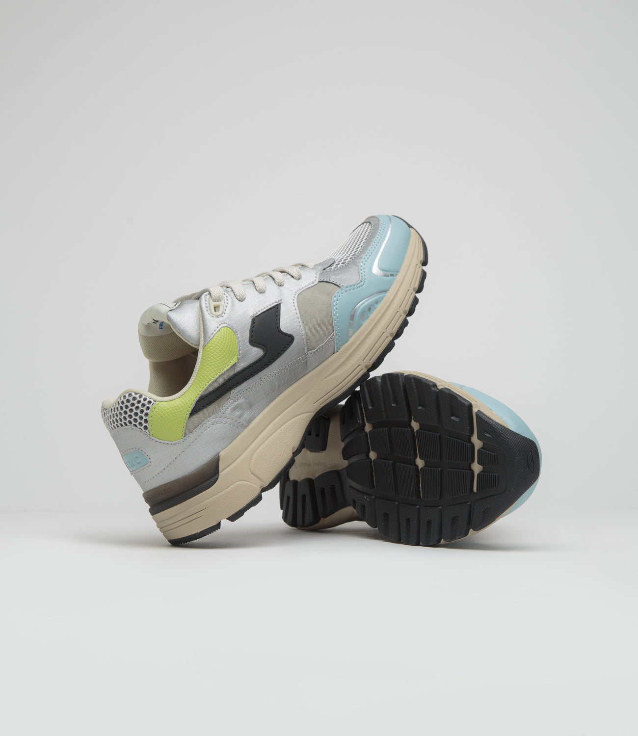 - Suede, mesh and nylon uppers with light blue panels and padded collar