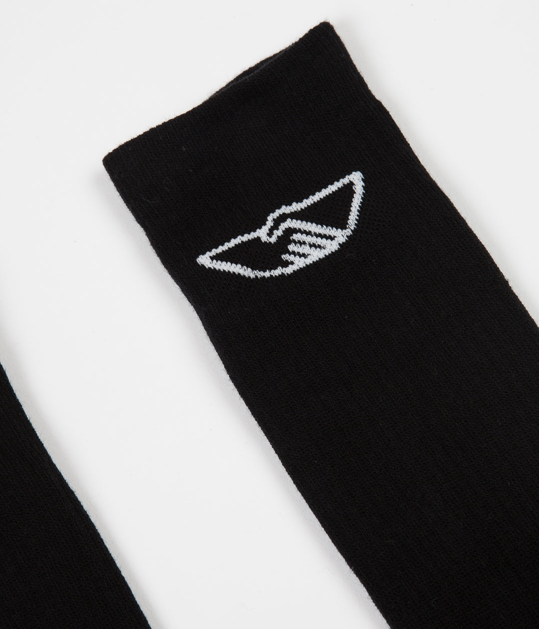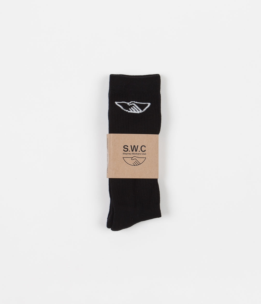 Stepney Workers Club Handshake Socks in Black. Knitted from a soft cotton blend, these monochrome Stepney Workers Club socks have been designed in London and made in Portugal to a high standard which makes them a staple style for everyday wear. The wide rib construction gives these socks a subtle texture and a white outlined version of the brands S.W.C. handshake logo can be seen on the ankle for distinctive branding. Underfoot the Stepney Workers Club motto of ‘Freedom Of Sport, Freedom Of Thought’ has also been added for further character.