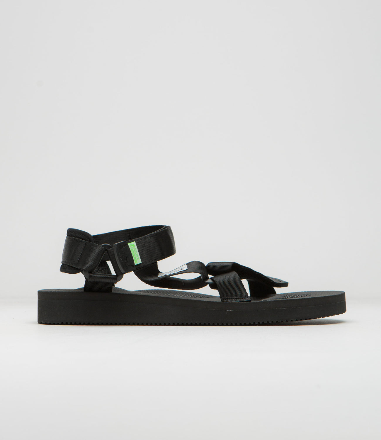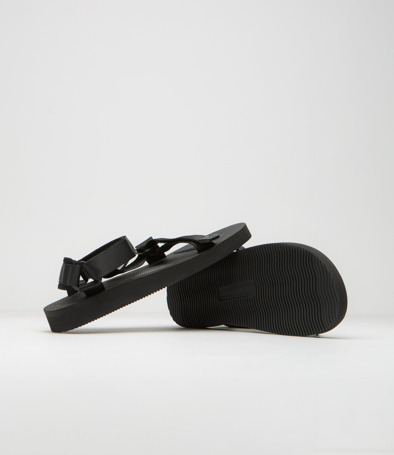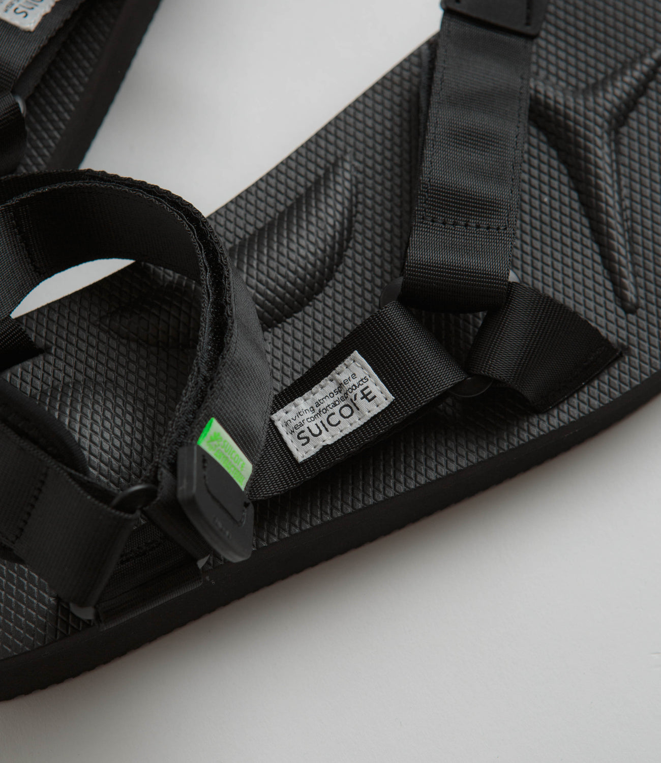 Suicoke Depa-Cab Shoes in Black. Designed with a sculpted and antibacterial EVA footbed, these Suicoke sandals are styled with a nylon strap upper. Featuring a padded heel brace and an adjustable strap fastening, this black Suicoke Depa-Cab sandal is finished with woven flag labels and a wedge-type outsole.