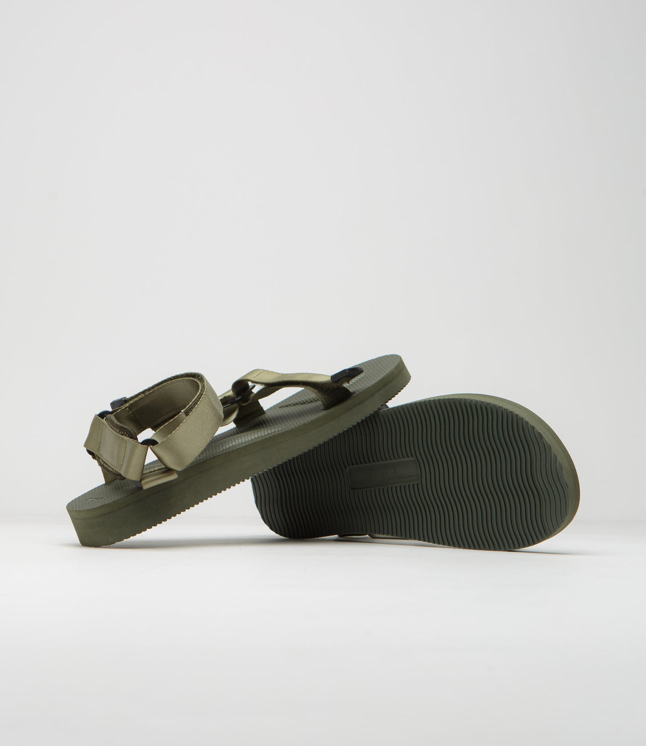 Suicoke Depa-Cab Shoes in Olive. Designed with a nylon strap construction, these Suicoke sandals are styled with a sculpted antibacterial EVA footbed and with a padded heel brace. Featuring an adjustable strap fastening, this olive green Suicoke Depa-Cab is finished with woven flag labels and with a rubber, wedge-type outsole.