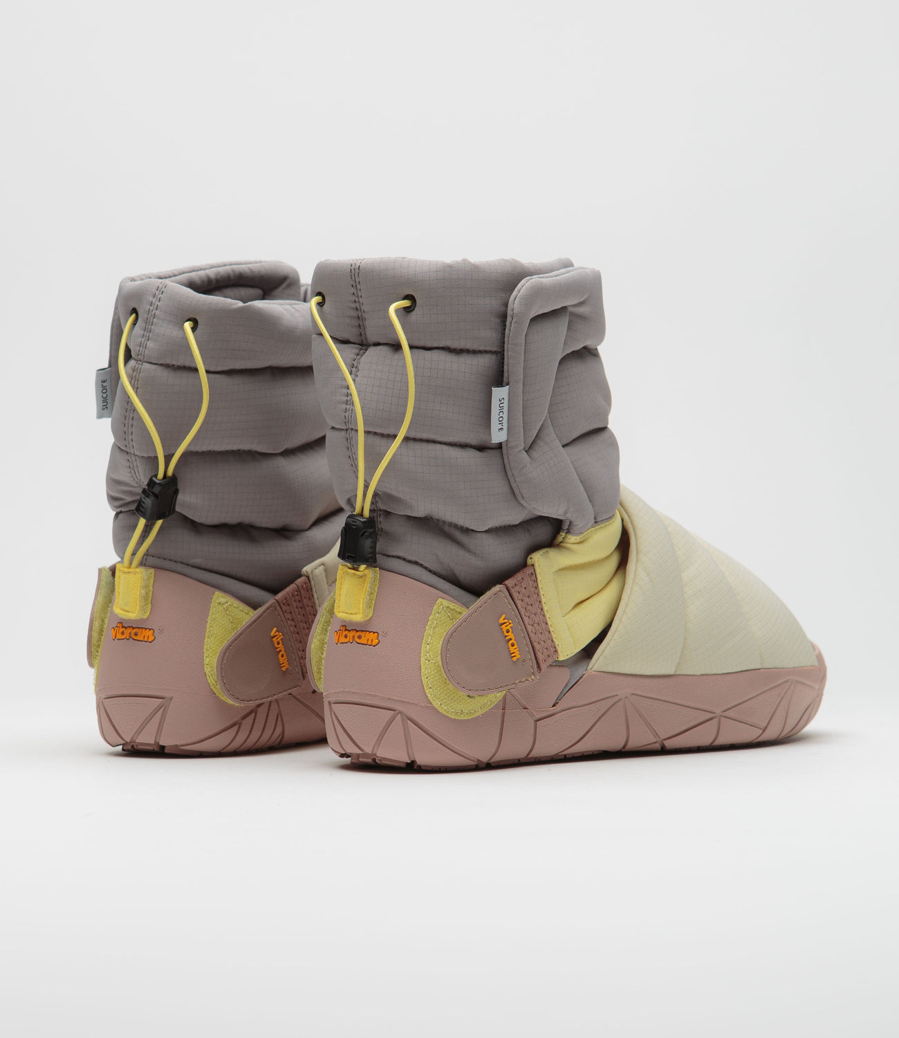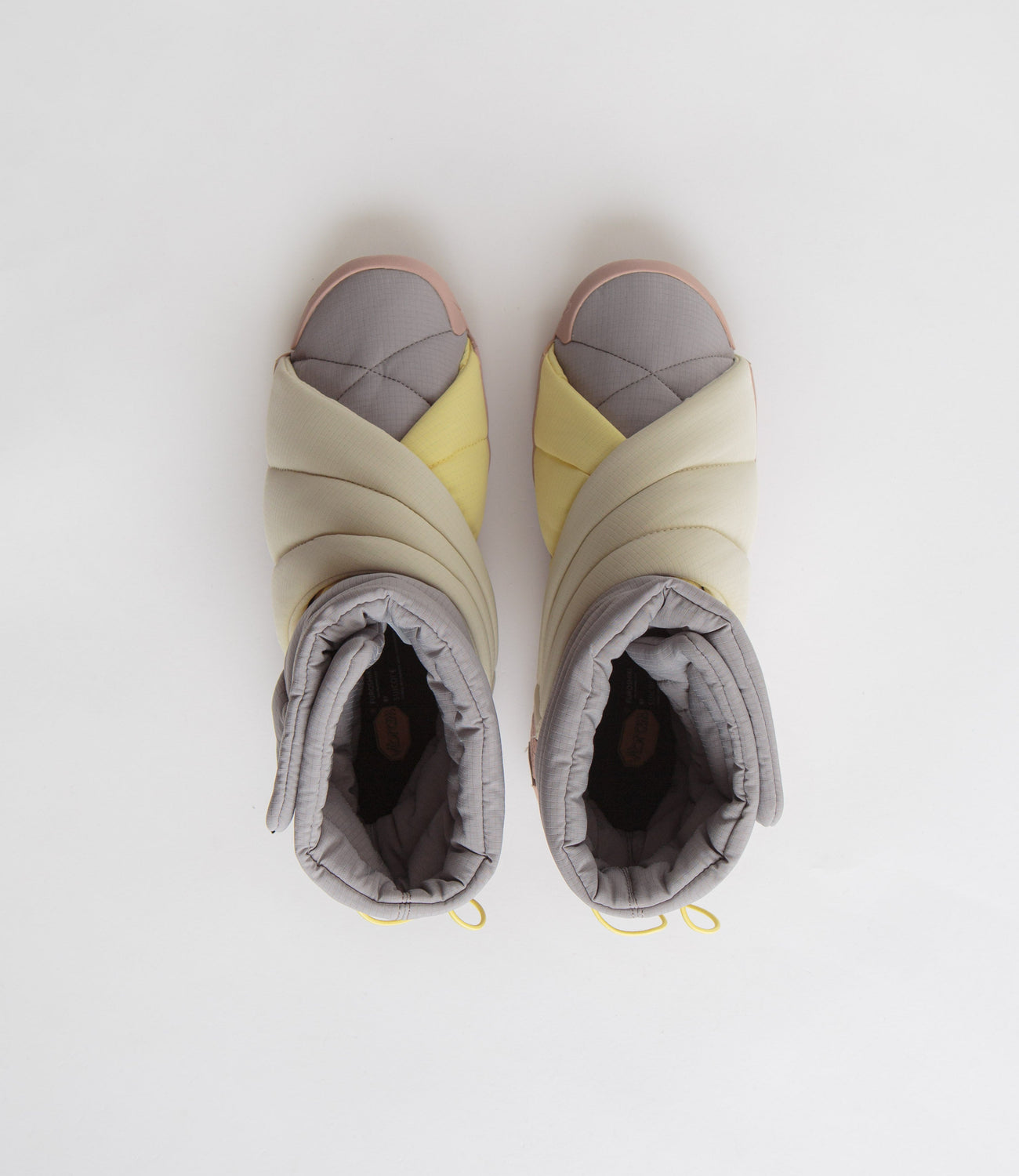 Suicoke Futon Hi Shoes in Grey Lemon. Designed with a quilted Vibram® Furoshiki construction, this high-top Suicoke Futon features a synthetic fibre upper and a contemporary cross-over strap fastening. Styled with a toggle-cord cuff adjuster and a resilient Vibram® Arctic Grip outsole, this grey yellow Suicoke boot is finished with woven flag labels and custom insoles.
