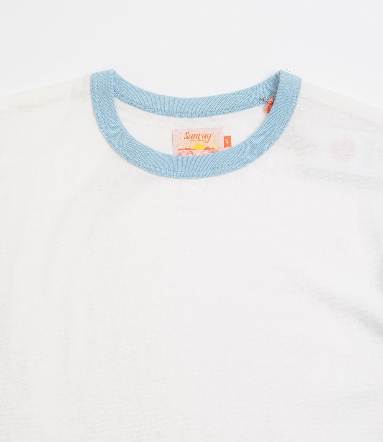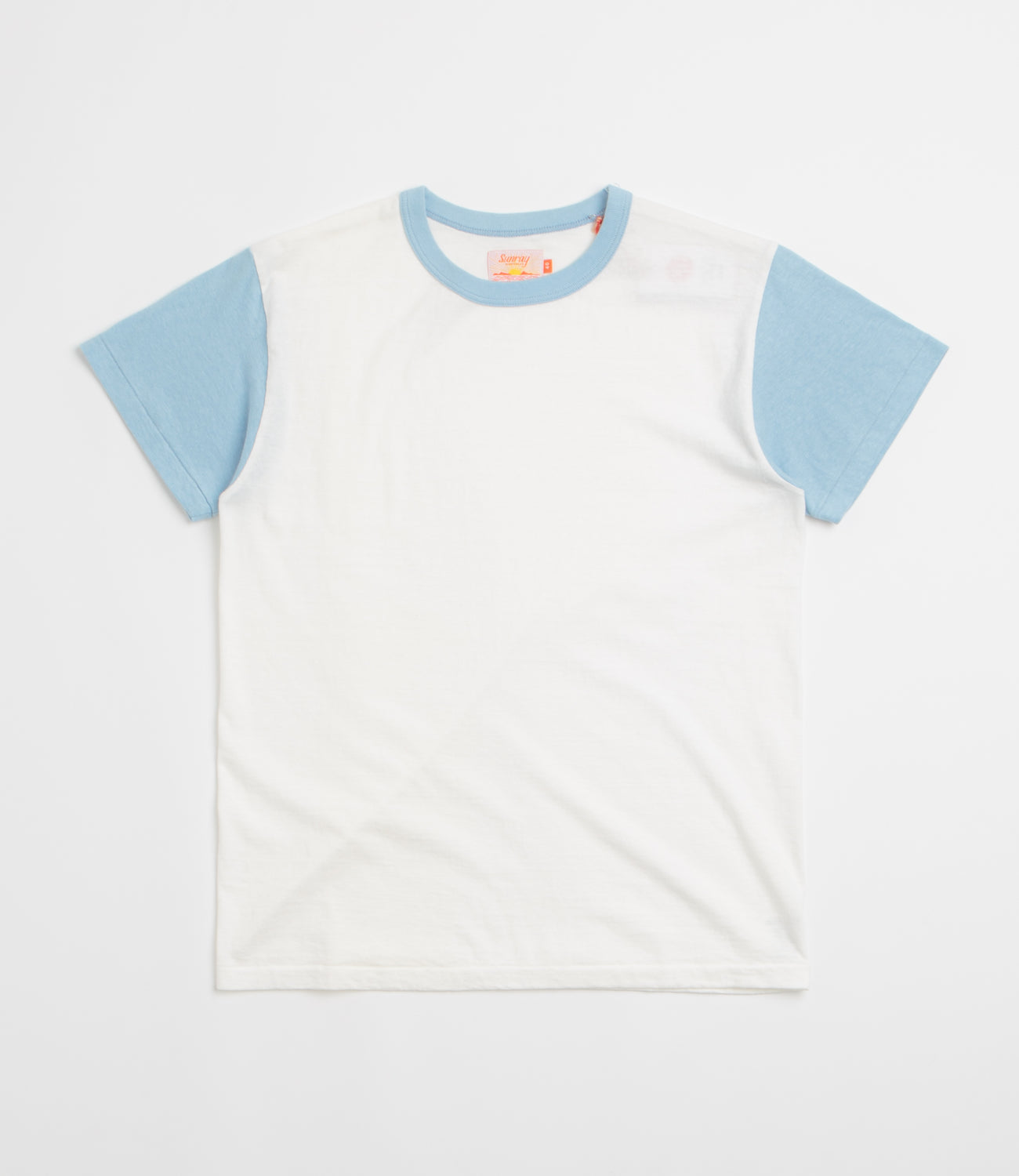Sunray La'ie T-Shirt in Off White and Duck Egg. Consciously crafted from 100% recycled cotton and made in Japan, this cut-and-sew Sunray t-shirt is tailored to a regular fitting and is inspired by both the classic Haleiwa t-shirt as well as vintage collegiate designs. Featuring block tone accents across the sleeves and rib knit collar, a reinforced hemline and a 260gsm composure, this two tone t-shirt is finished with a 100% recycled polyester flag label sewn across the inner neckline.