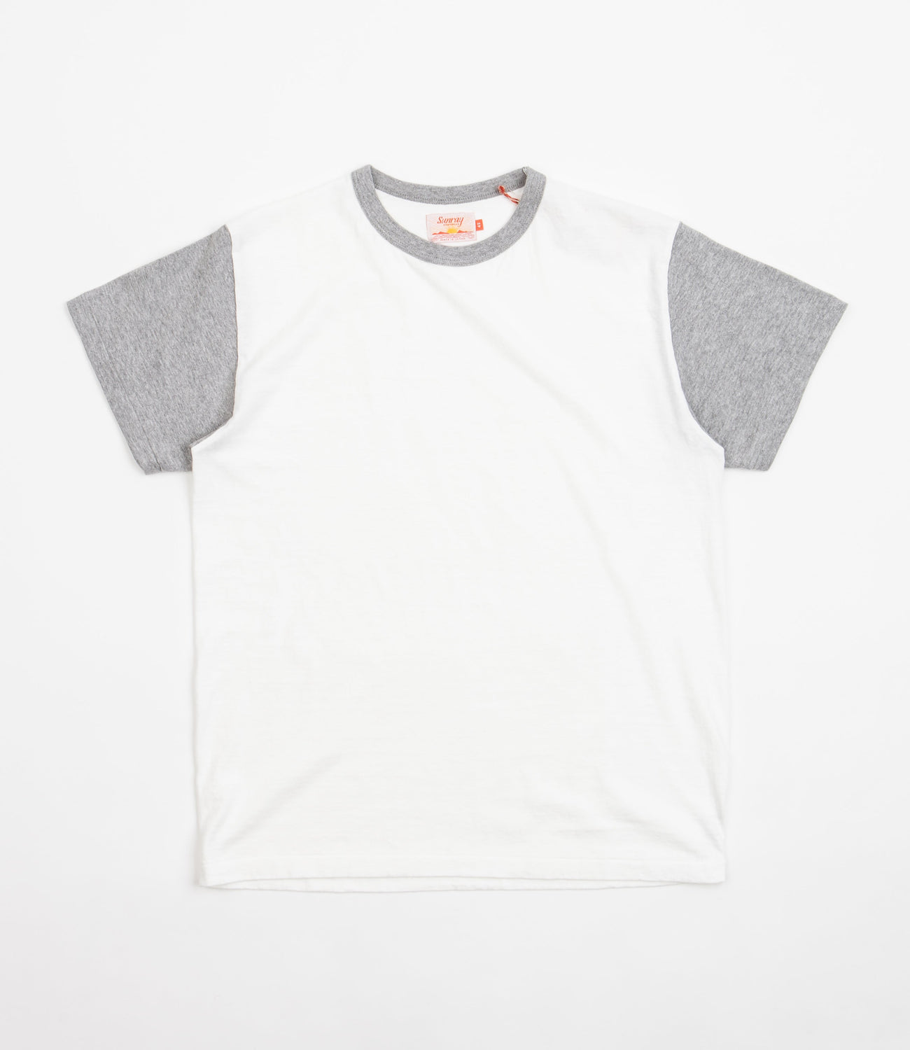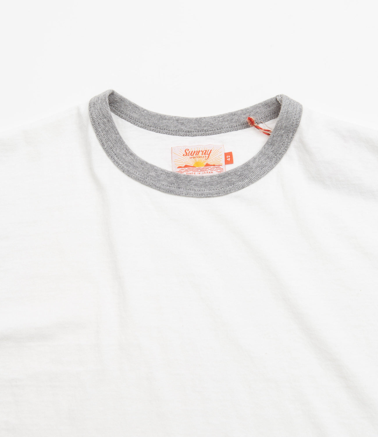Sunray La'ie T-Shirt in Off White and Hambledon Grey. Two tone and made in Japan utilising traditional techniques, this cut-and-sew Sunray t-shirt arrives as part of the brand’s SS22 collection. Inspired by the classic Haleiwa and vintage collegiate aesthetics, this two tone t-shirt is crafted from 100% recycled cotton, tailored to a regular fitting and featuring a reinforced hemline and colour block accents across the sleeves and crew collar. Finished with a 260gsm construction and with an embroidered 100% recycled polyester flag label sewn across the nape.