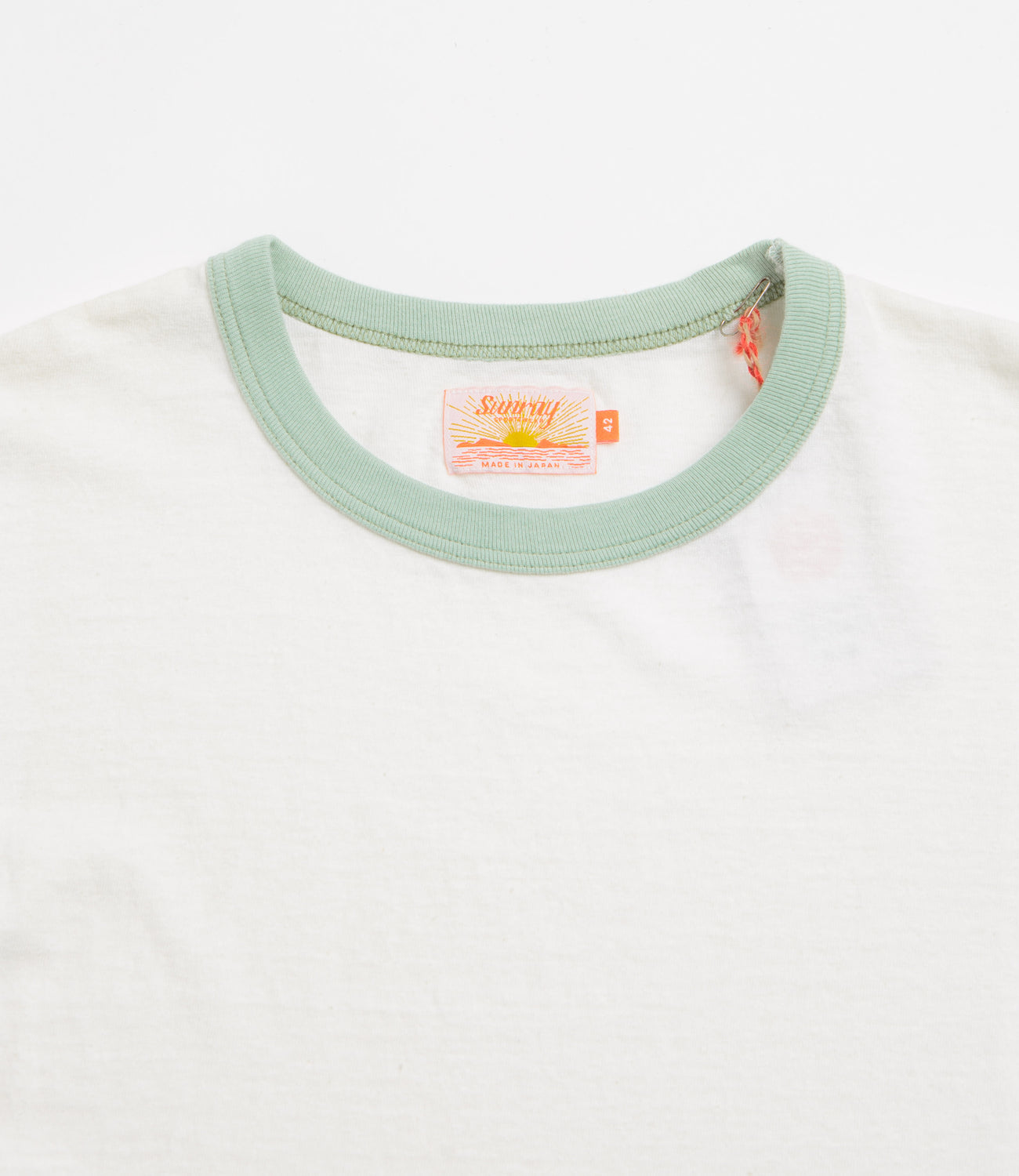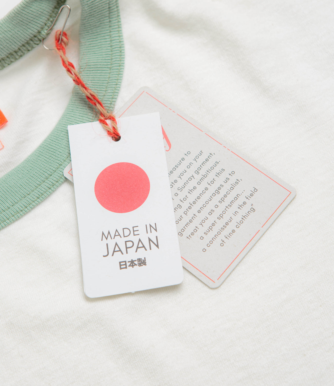 Sunray La'ie T-Shirt in Off White and Sage. Inspired by vintage sportswear and the brand’s classic Haleiwa profile, this new season Sunray t-shirt is tailored to a regular fitting from 100% recycled cotton. Styled with colour block accents across the sleeves and rib knit collar, a reinforced hemline and a resilient 260gsm composure, this two tone t-shirt is finished with tonal stitched seams and with an embroidered 100% recycled polyester flag label sewn across the inner neckline.’