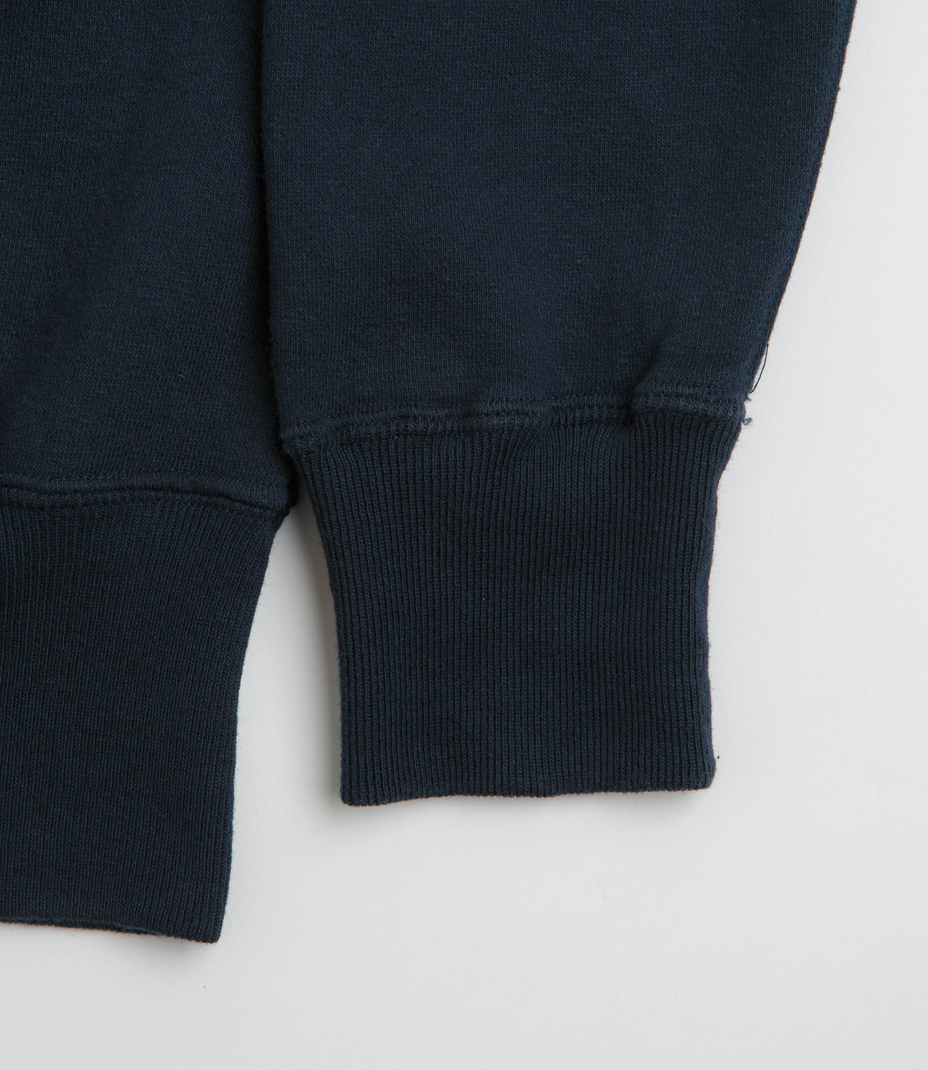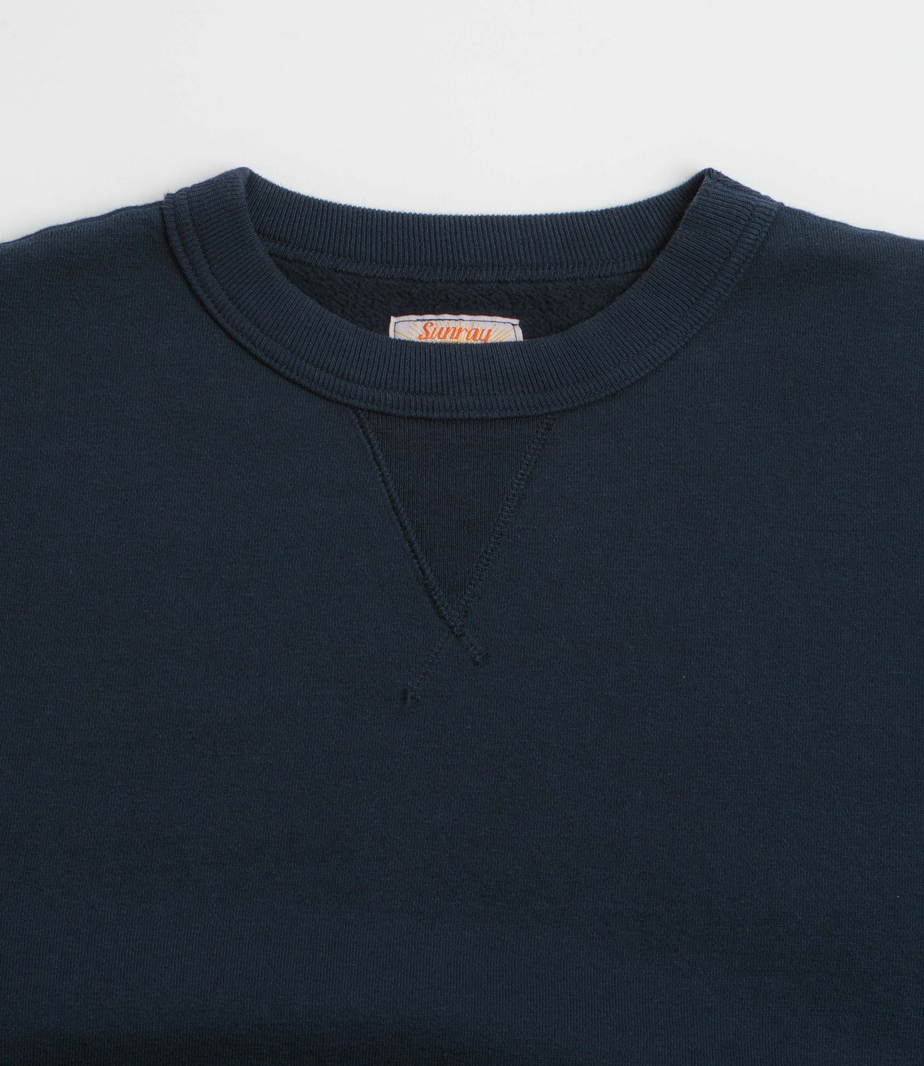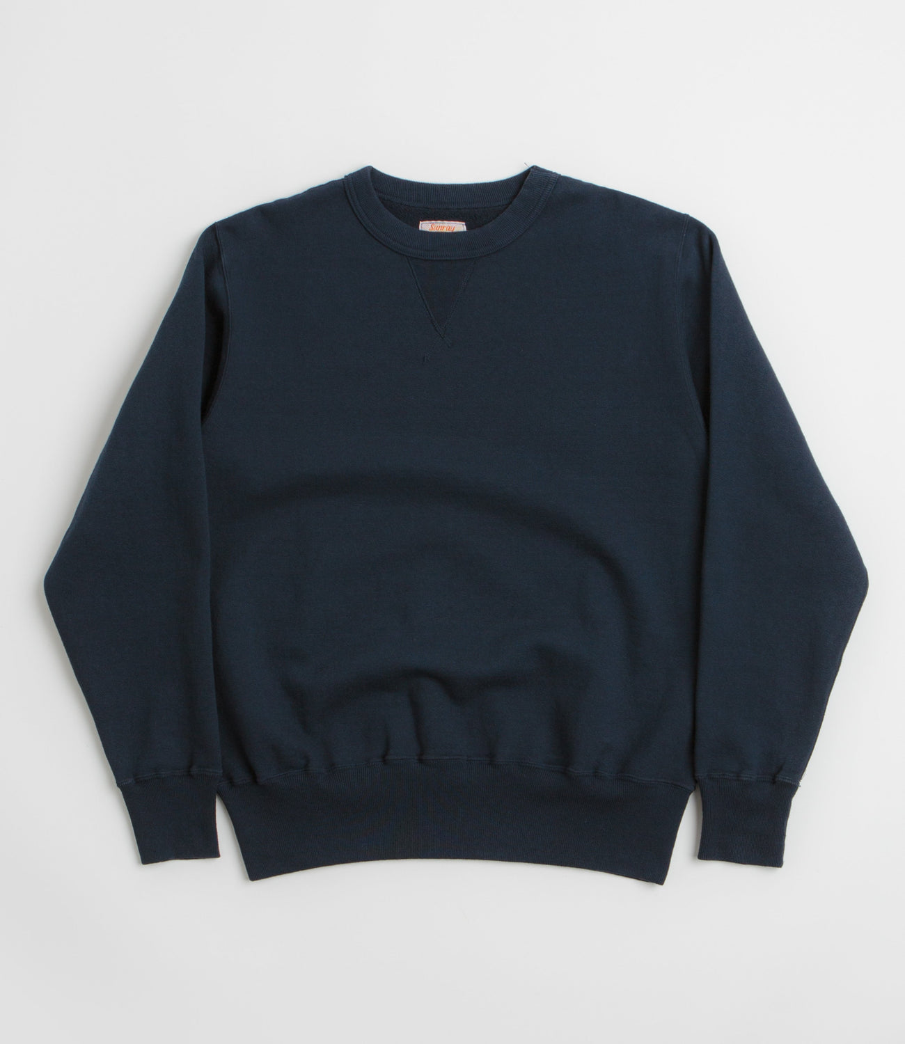 Sunray Sportswear Laniakea Crewneck Sweatshirt in Dark Navy. Made in Japan from 100% cotton, this Sunray Sportswear sweatshirt is designed with a brushed fleece construction. Featuring a V-insert rib knit collar and ribbed cuffs, this navy Sunray Sportswear sweater is finished with a woven elastic hem and tonal stitched seams.