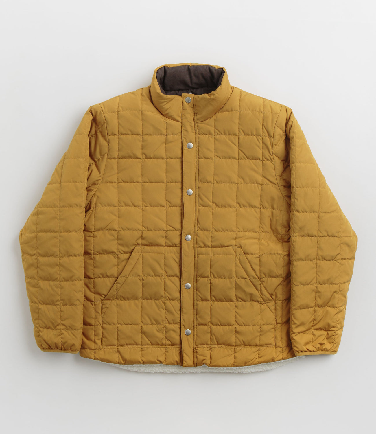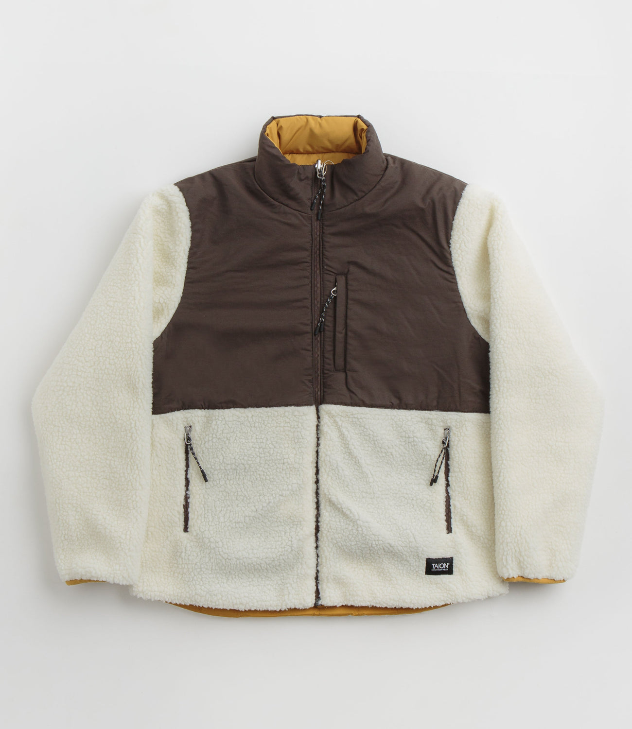 Taion Reversible Down Jacket in Camel, Dark Chocolate and Ivory. Reversible and tailored to a unisex fitting, this Taion jacket is designed with two polyester sides, one with a quilted down insulation. Featuring a full length fastening, an extended collar, elasticated cuffs and a woven elastic hem, this brown beige Taion jacket is finished with two waist pockets, a zippered chest pocket across the panelled side and with woven flag label branding.