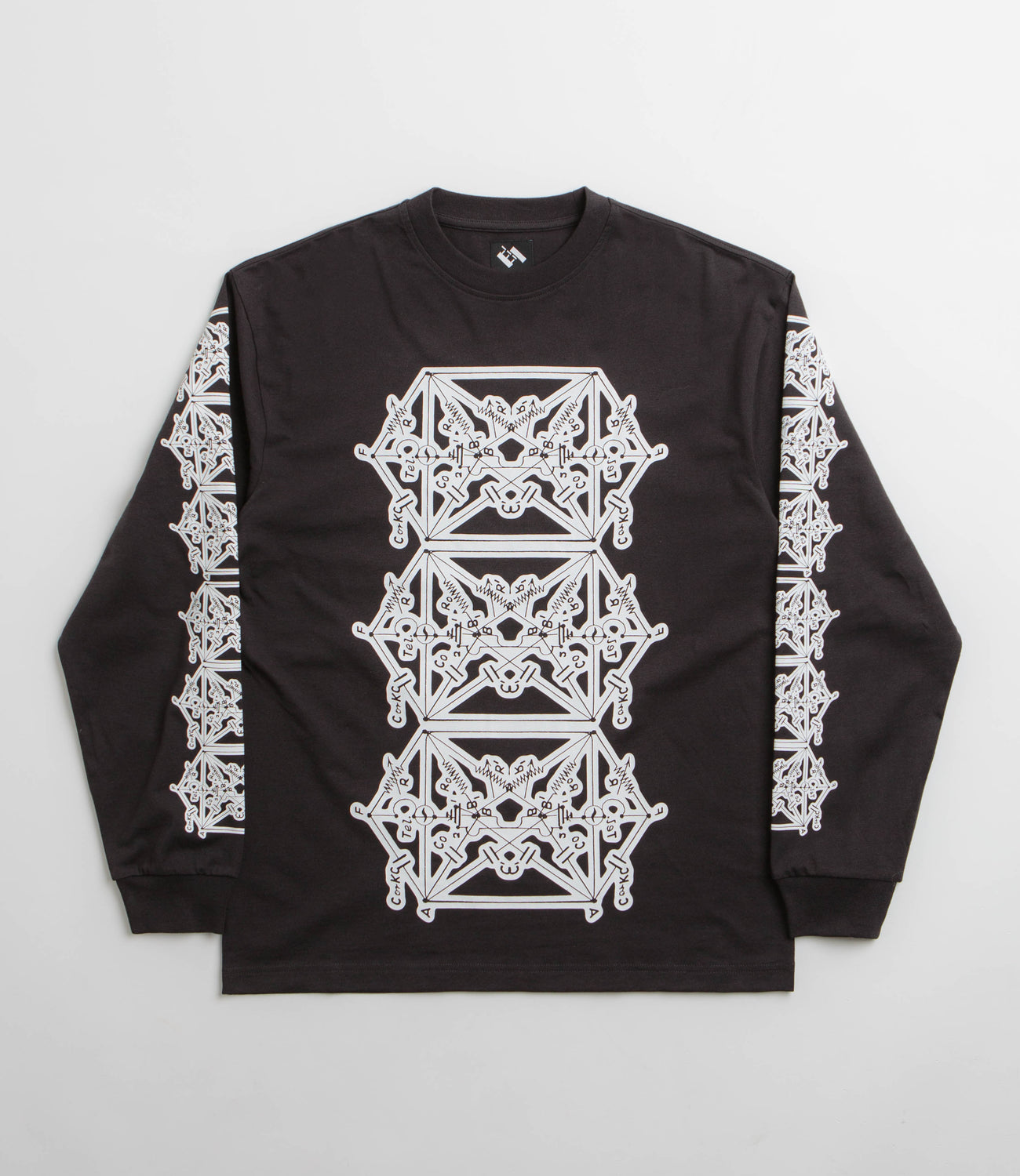 The Trilogy Tapes Envelope Goat Long Sleeve T-Shirt in Black. Made from 100% cotton with ribbed cuffs, this Trilogy Tapes t-shirt is tailored to a regular fitting. Featuring a flexible rib knit collar, this black Trilogy Tapes t-shirt is finished with printed sleeve graphics and printed centre chest detailing.