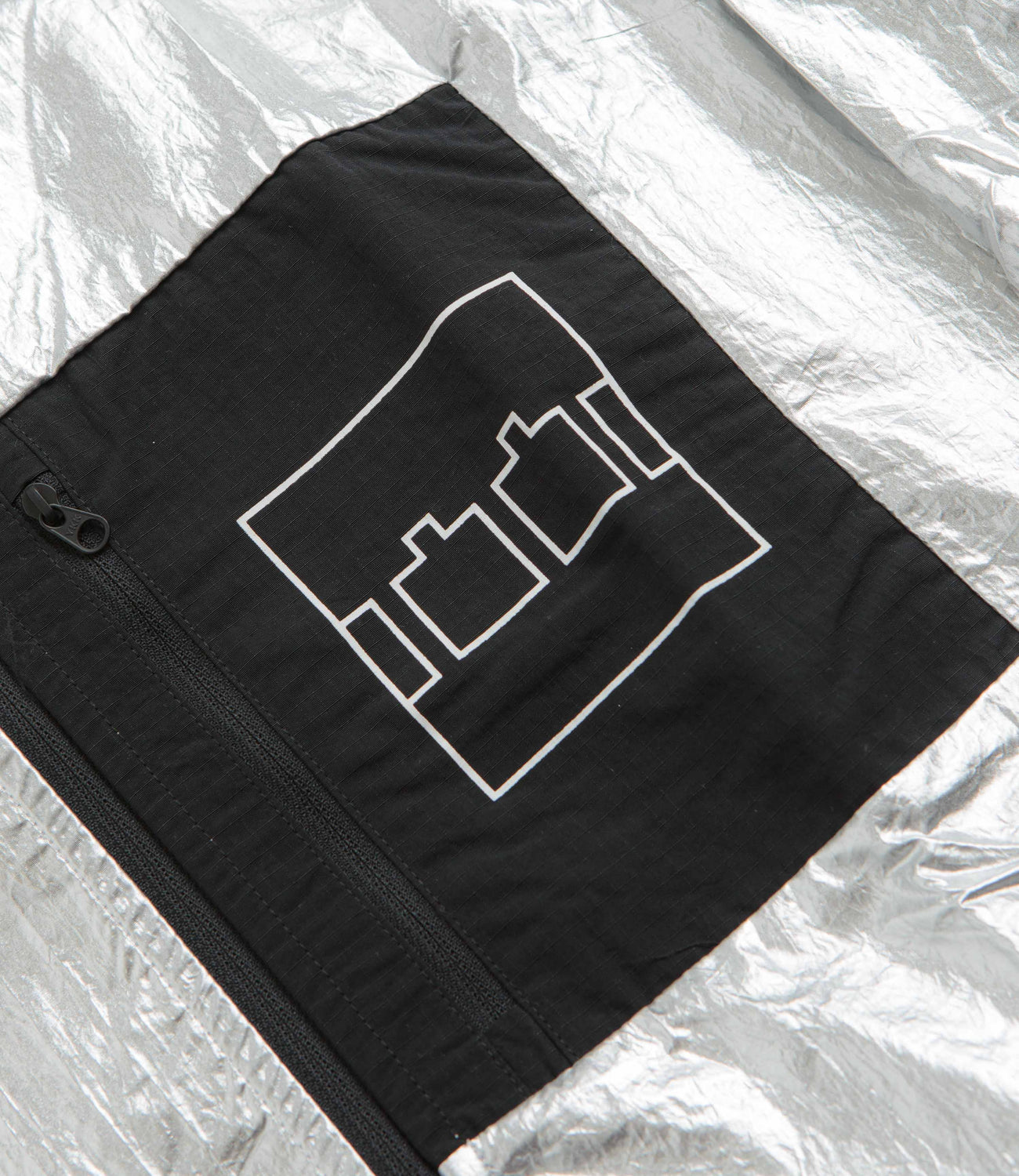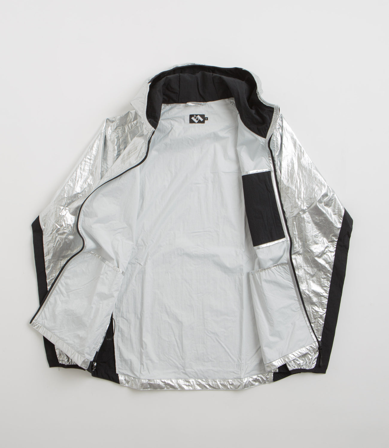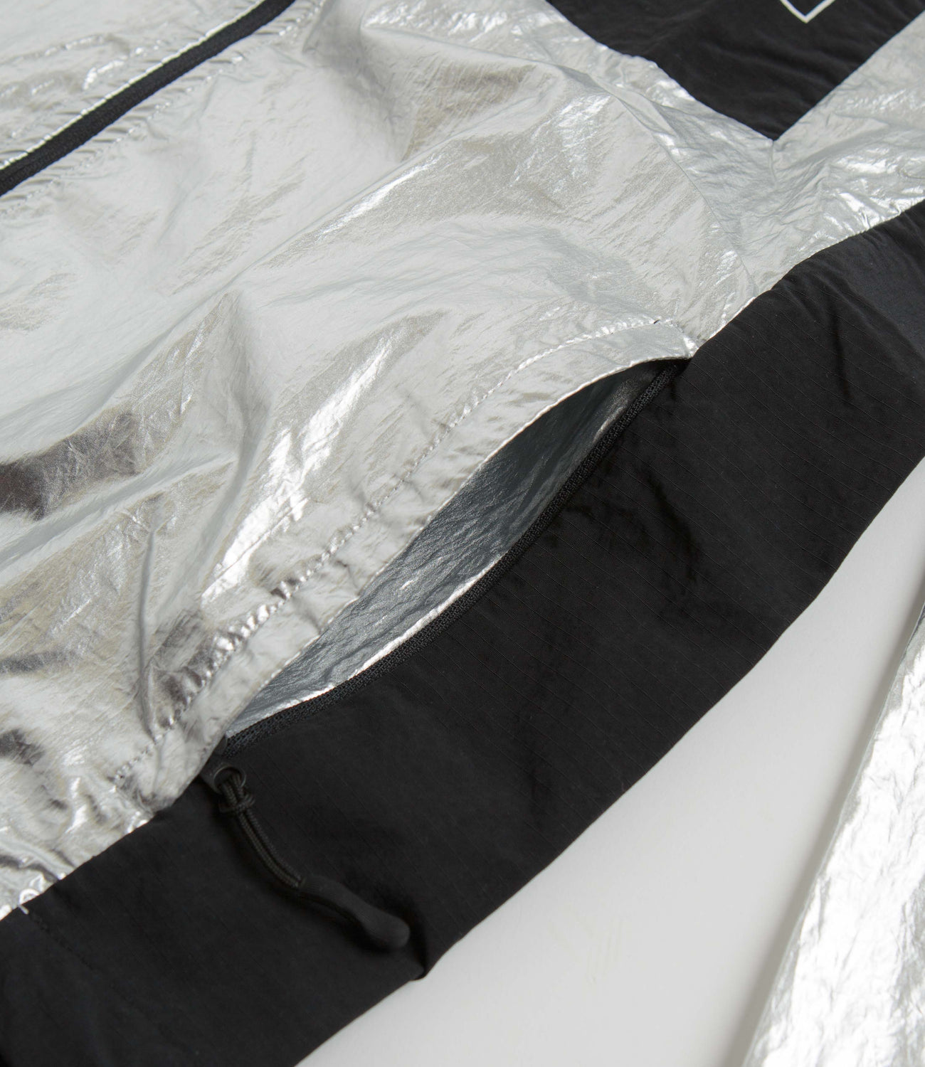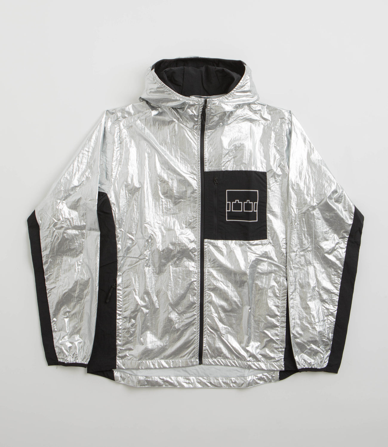 The Trilogy Tapes Lightweight Jacket in Silver. Regular fitting with a metal toned nylon shell, this Trilogy Tapes jacket is designed with an elasticated hood and a full length zipper fastening. Featuring elasticated cuffs and panelled sides, this silver Trilogy Tapes jacket is finished with two side pockets, a zippered chest pocket and with printed logo branding.
