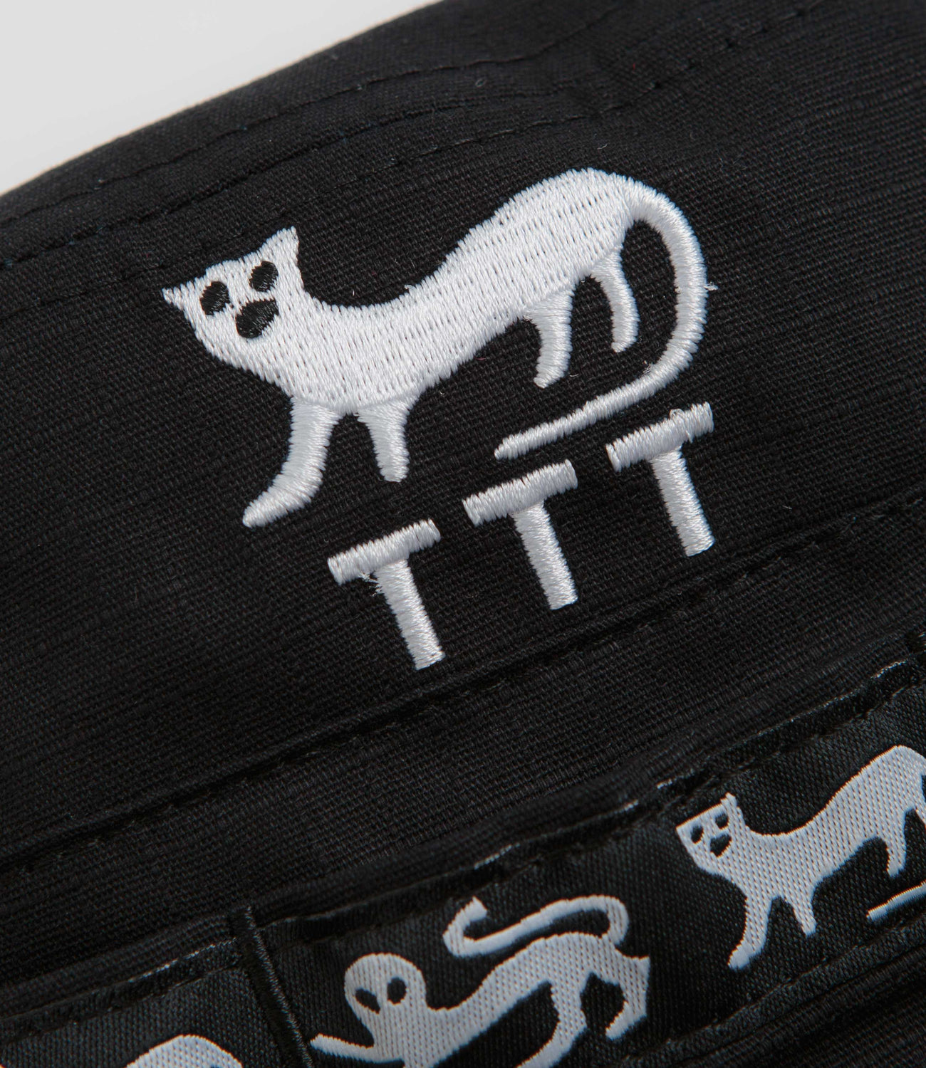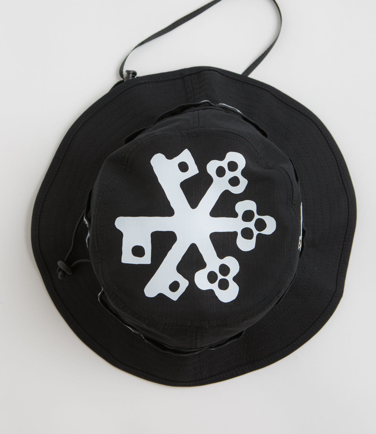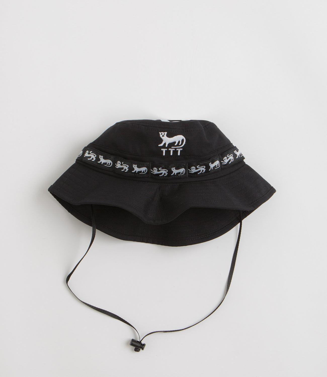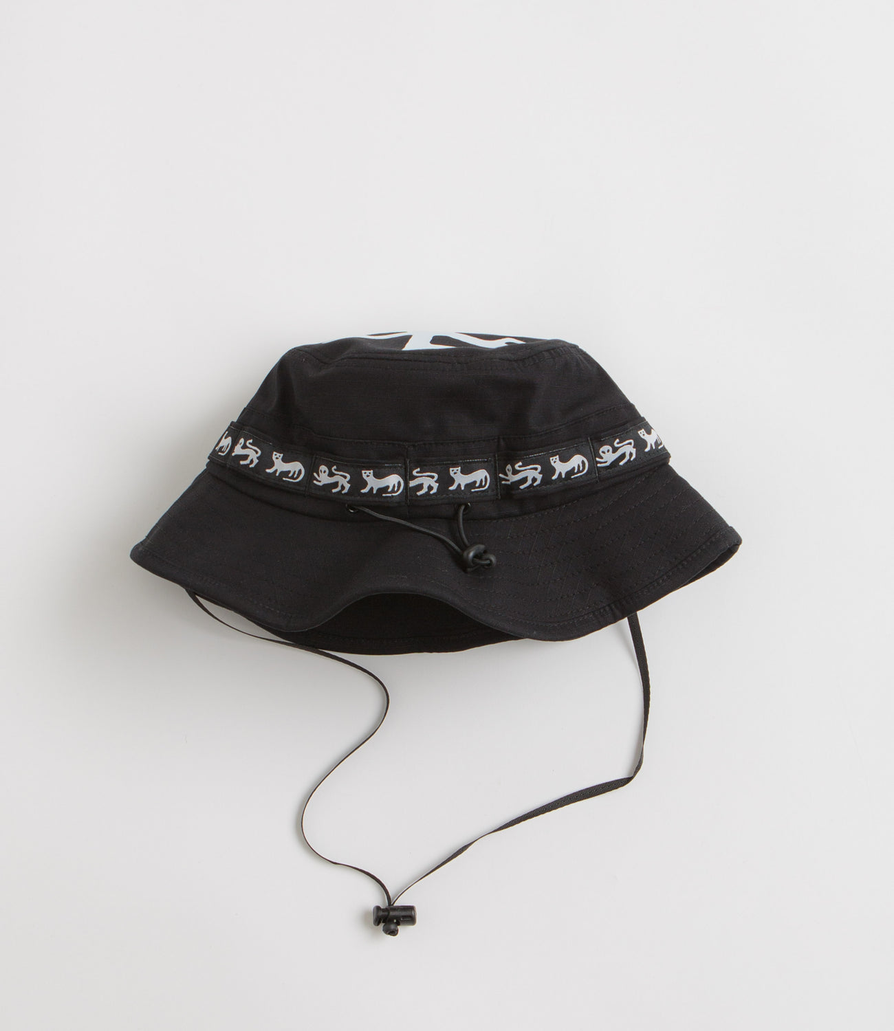 The Trilogy Tapes Lion Boonie Hat in Black. Single sized and made from 100% cotton, this Trilogy Tapes hat is designed with a wrap-around brim and woven webbing tape detailing. Finished in black with an adjustable rear fastening, an under-chin strap and printed graphics.