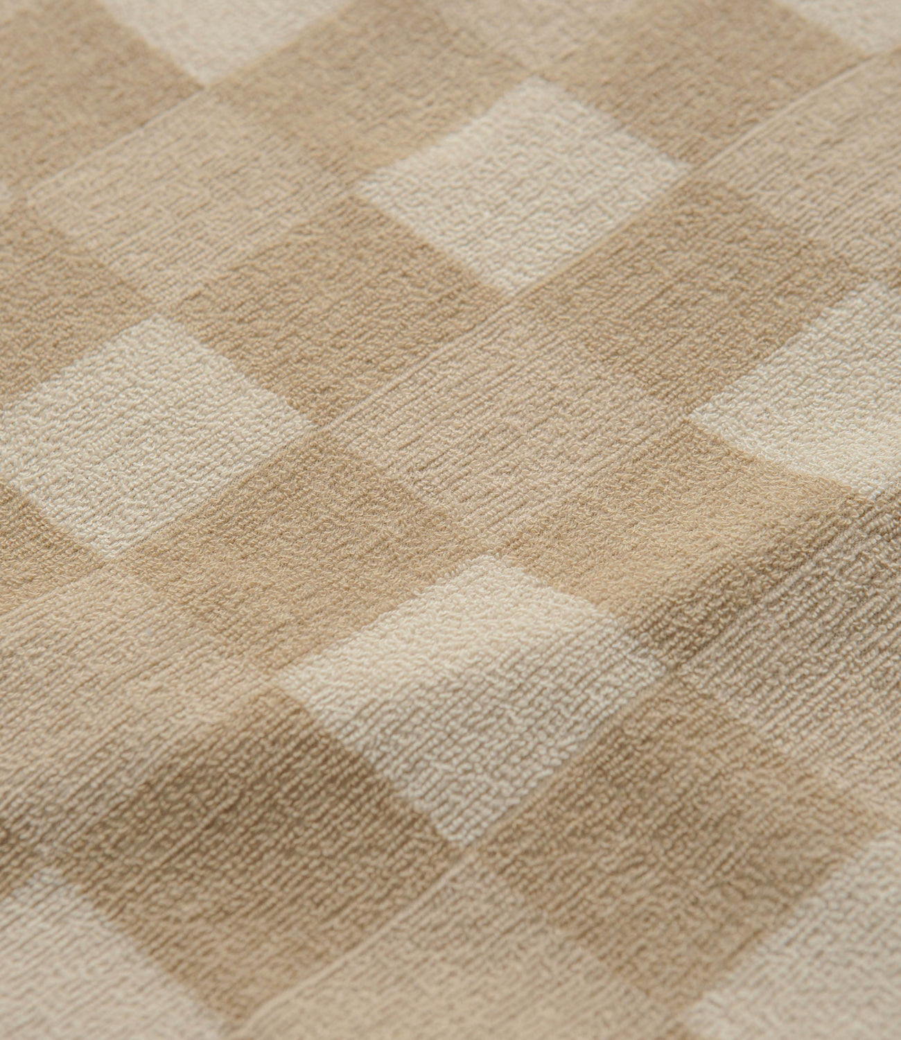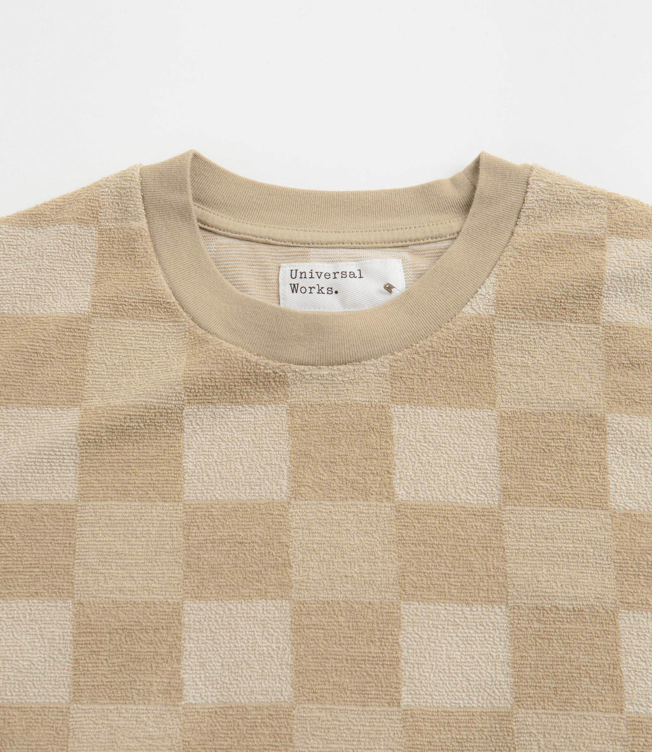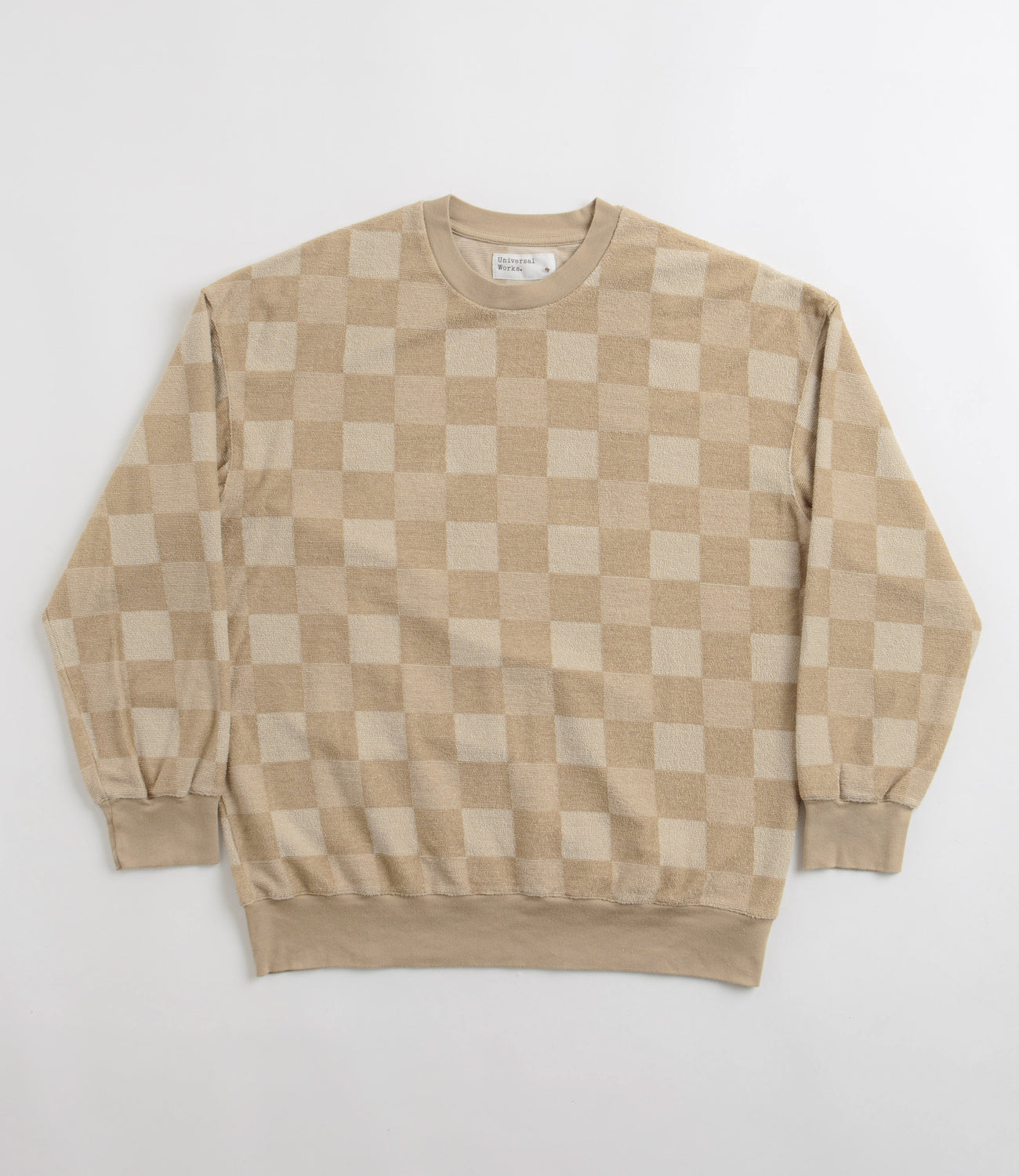 Universal Works Loose Crewneck Sweatshirt in Sand. Tailored to a relaxed fitting with an all-over checkered pattern, this Universal Works sweatshirt is crafted from a blend of cotton and recycled polyester. Featuring a rib knit collar, dropped shoulders and ribbed cuffs, this Universal Works sweater is finished in a checkerboard shade of khaki sand.