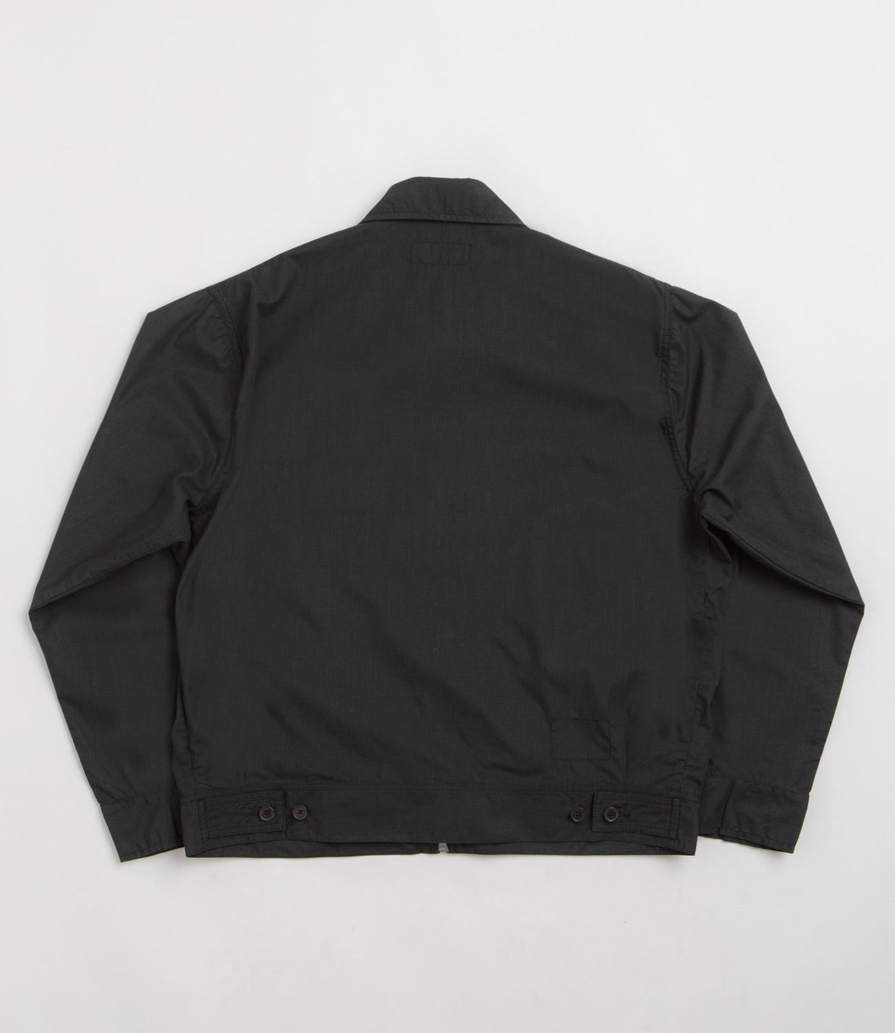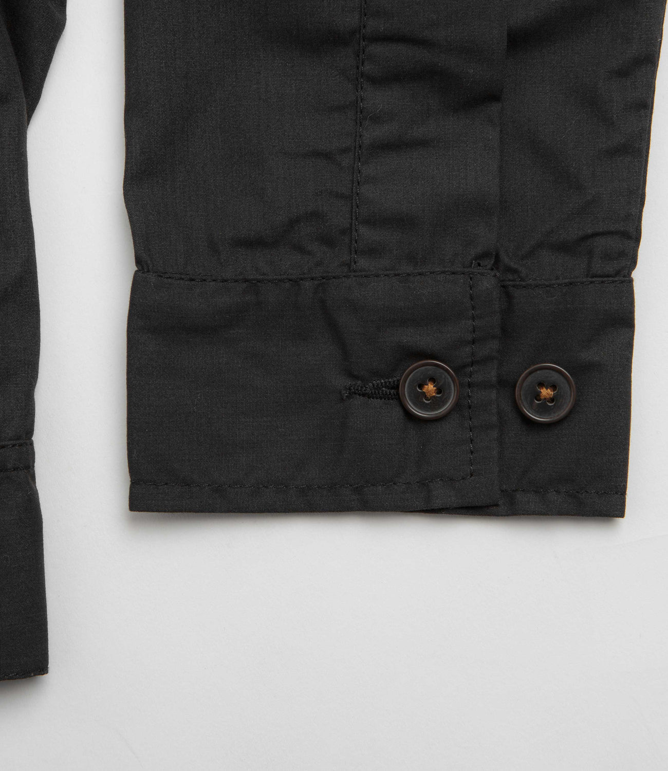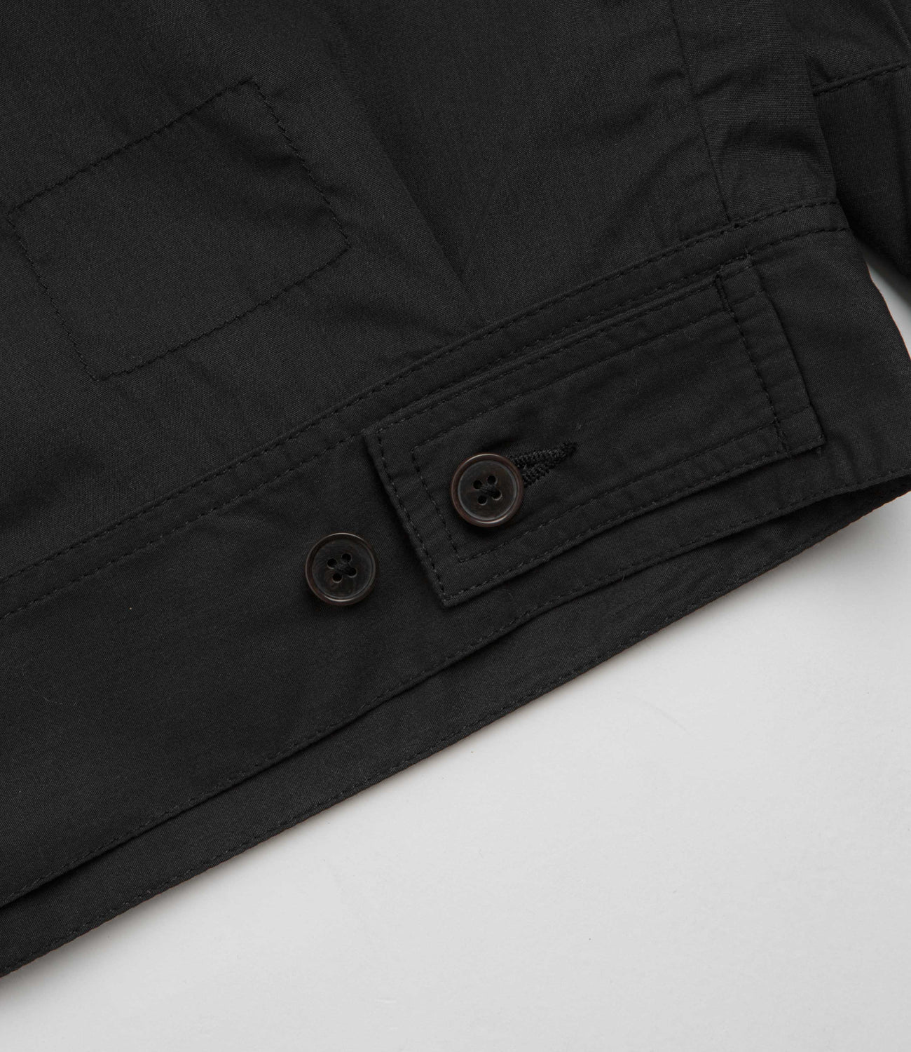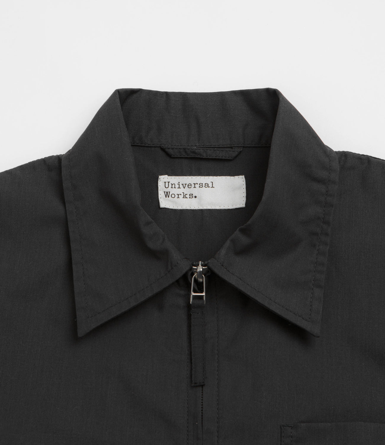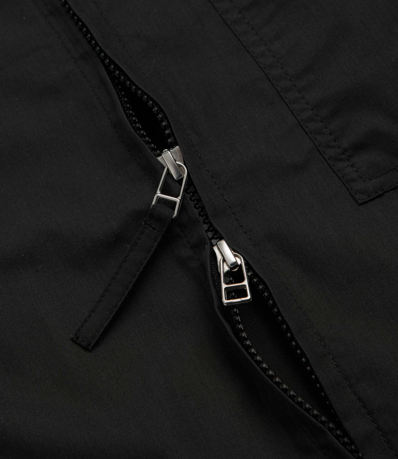 Universal Works Rose Bowl Jacket in Black. Crafted from a recycled polyester blend, this block tone Universal Works jacket is designed with a stand collar and a full length, two-way zipper fastening. Finished in black with two front pockets, a single chest pocket, buttoned cuffs and an adjustable hem.