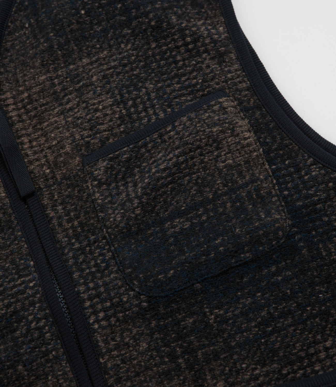 A go-to layer for crisp mornings or cooler evenings, this navy gilet blends wool and recycled polyester for warmth with minimal bulk. The textured all-over pattern adds subtle style, while the V-neck collar and two-way full-length zip let you adjust for comfort on the move. Practical details like a chest pocket and two front pockets keep essentials close, and the regular fit makes it easy to layer over shirts, hoodies, or lightweight jackets.