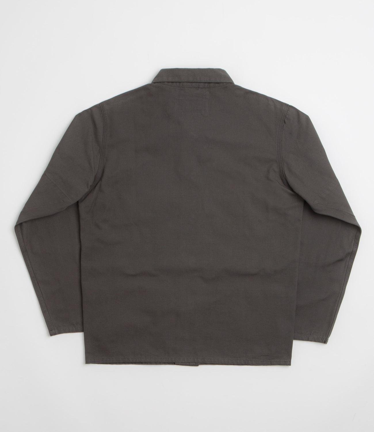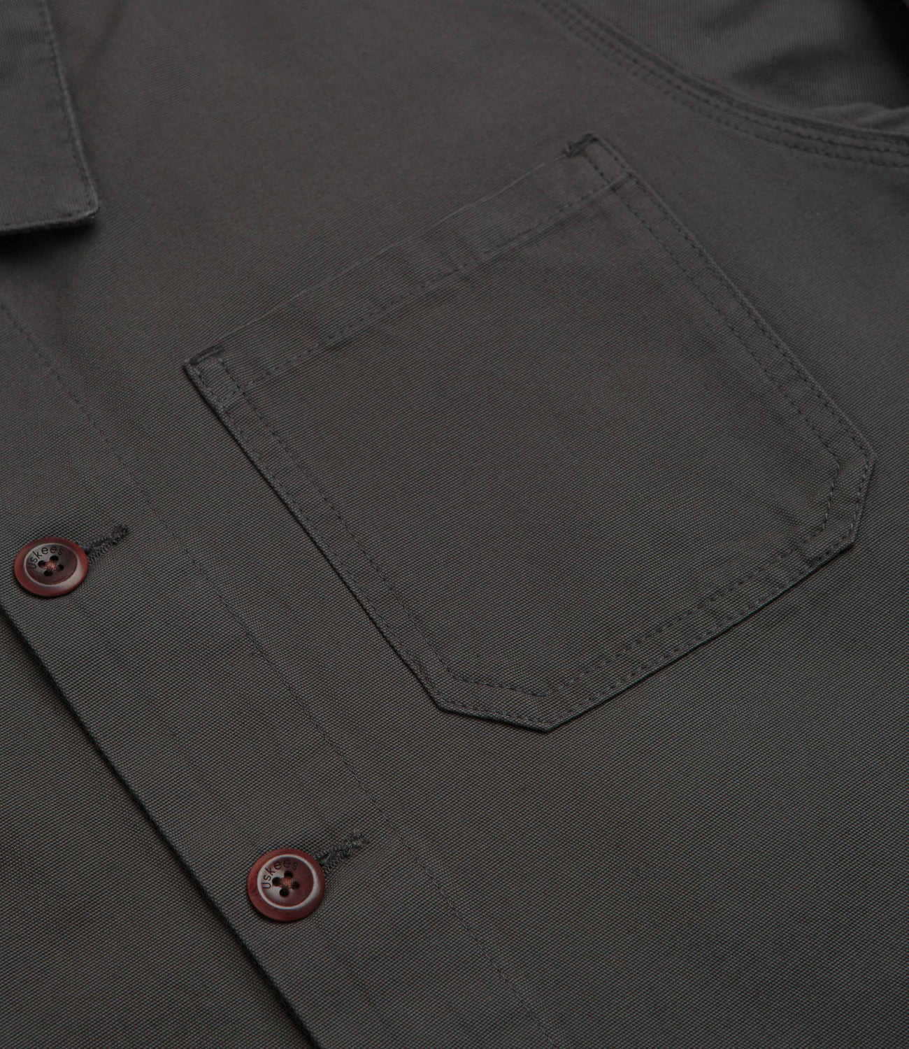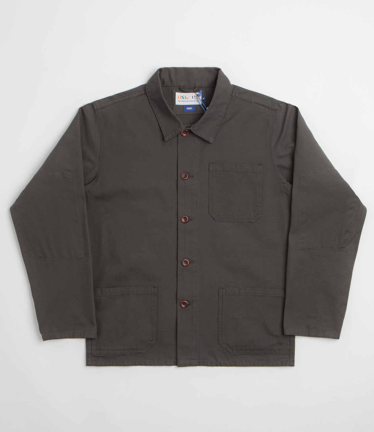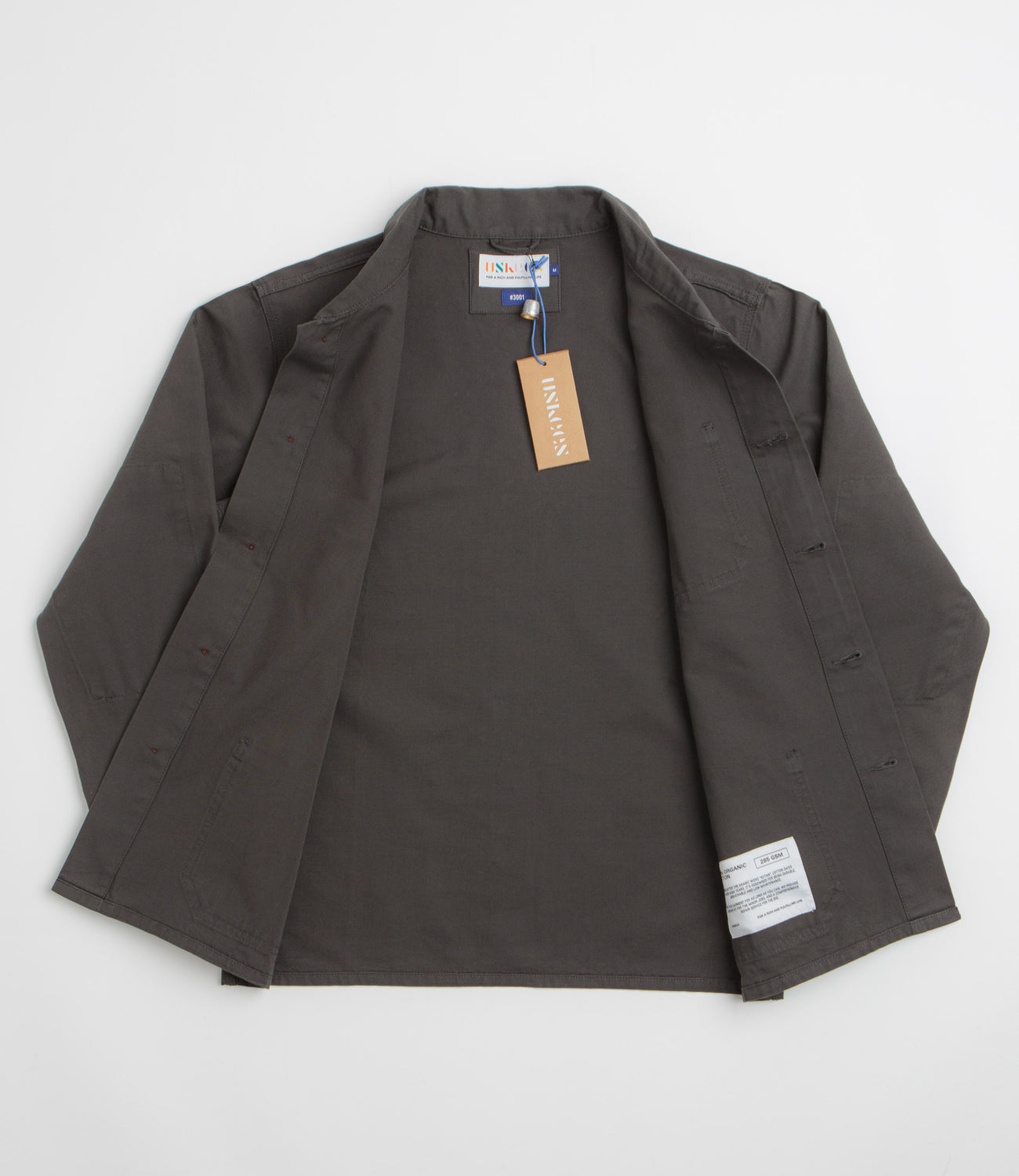Built for everyday wear with a nod to utility, this Uskees overshirt is crafted from 100% organic cotton with a relaxed, boxy fit. A classic stand collar and full-length button fastening keep it timeless, while plant-based corozo hardware and reinforced elbows add subtle durability. Finished with a single chest pocket and two waist pockets, this black grey overshirt blends practical details with easygoing style.