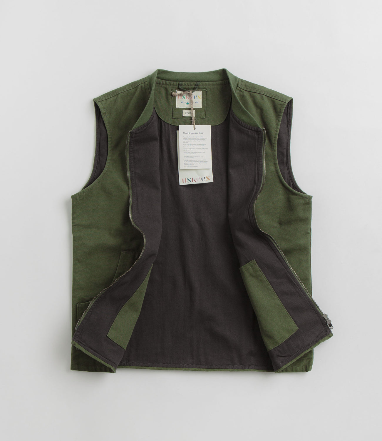 Uskees 3029 Patch Pocket Canvas Vest in Coriander. OCS approved and tailored to a regular fitting, this Uskees vest is made from 100% organic cotton canvas. Featuring a blanket-lined inner, a jersey collar and a full length two-way YKK zipper fastening, this green Uskees vest is finished with two waist pockets and with two inner chest pockets.