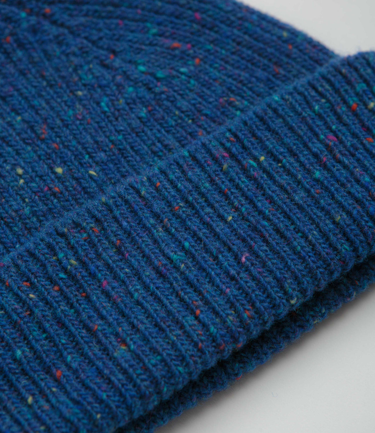 Uskees 4003 Speckled Donegal Wool Beanie in Ultra Blue. Made from 100% merino wool this single sized Uskees beanie is wrinkle, odour and stain resistant. Featuring a stretchy rib knit face and a speckled yarn blend, this blue Uskees beanie is finished with a classic fold-over cuff.