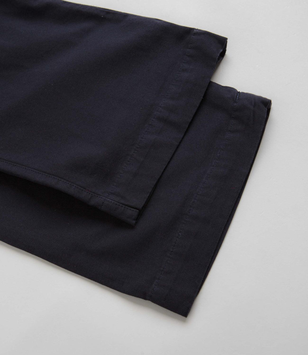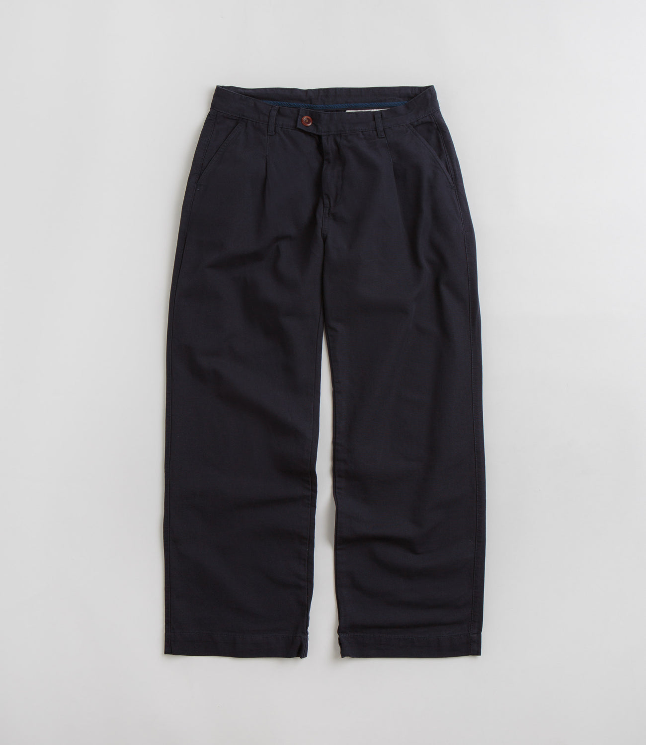 Uskees 5018 Boat Pants in Midnight Blue. Inspired by vintage slacks, these regular fitting Uskees pants are made from 100% organic cotton with a wide leg cut. GOTS certified with front pleat details, an adjustable waistband and a corozo button secured fly, these midnight blue Uskees boat pants are finished with two side pockets and two rear pockets.