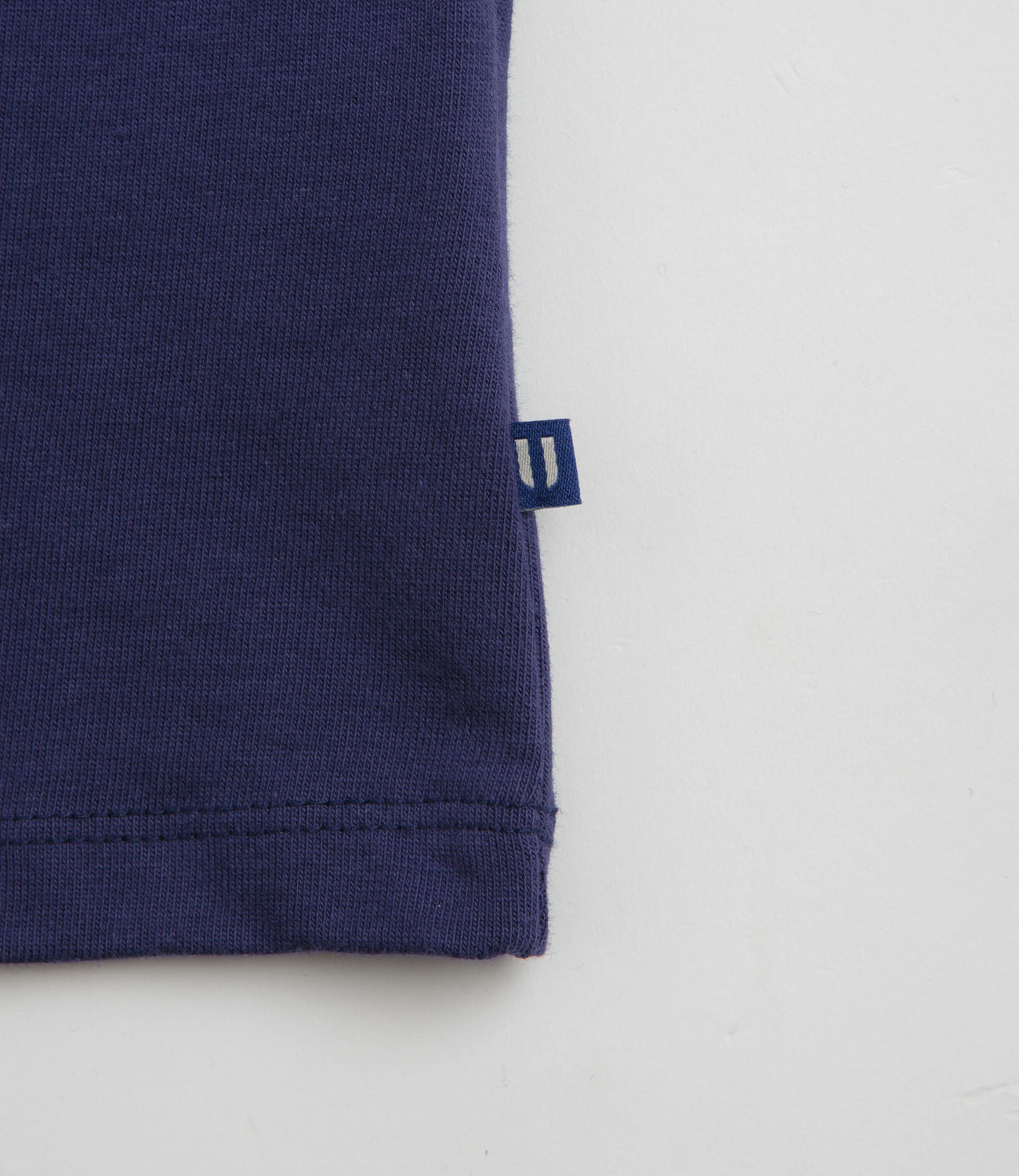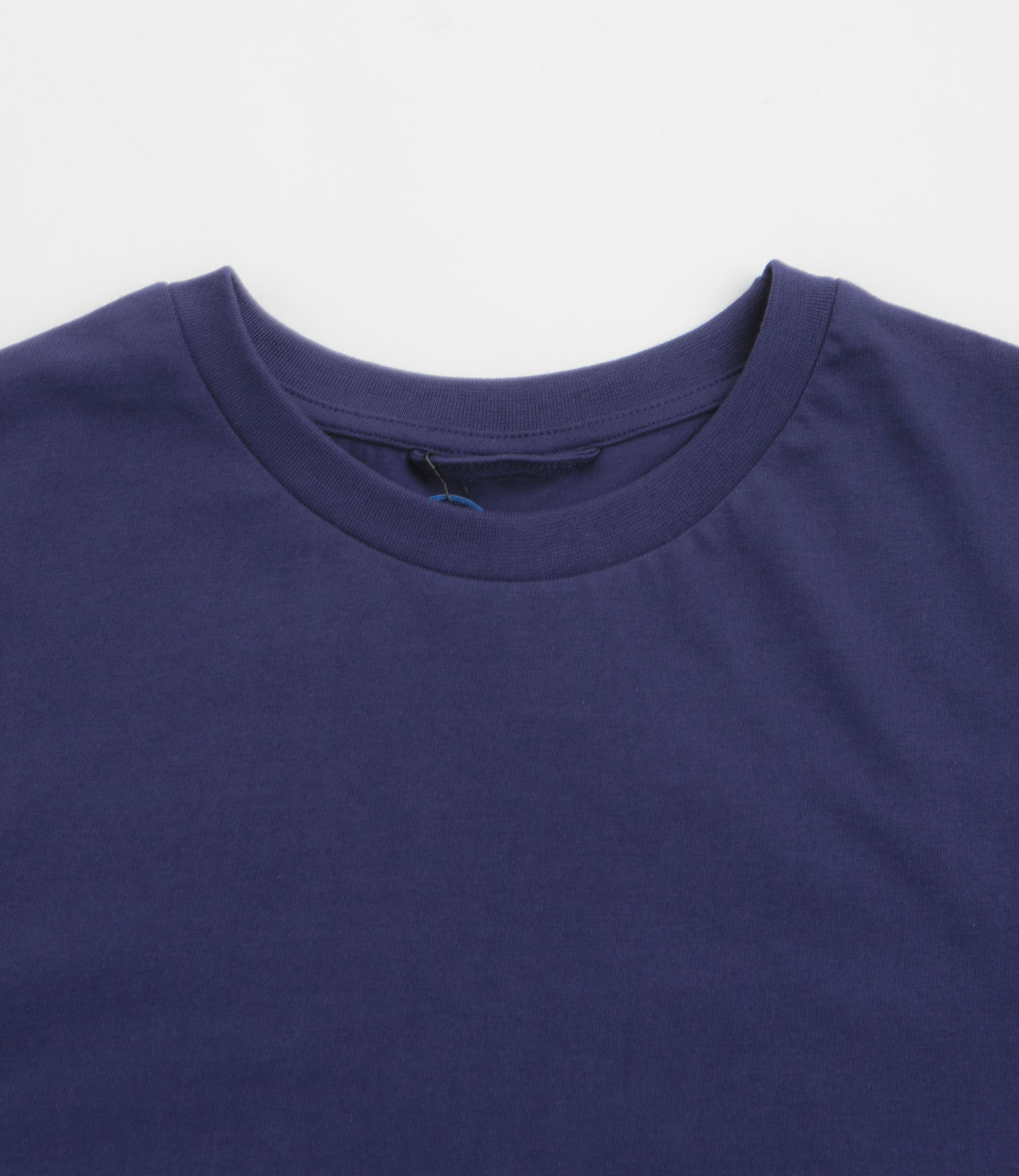 Uskees 7006 T-Shirt in Deep Indigo. Loose fitting and made from 100% organic cotton, this block tone Uskees t-shirt is designed with an enzyme-washed construction. Finished in deep blue with a rib knit collar and side seam branding.