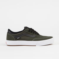 Vans Gilbert Crockett Shoes in Black and Forest Night. Designed by team rider Gilbert Crockett to deliver exemplary boardfeel, flex and traction, the Vans Gilbert Crockett is a signature silhouette enhanced with technical trims. Featuring premium suede and canvas uppers styled in a forest green colourway, this low collar skate shoe also features a bright white rubber WaffleCup outsole, tonal extended foxings and a reinforced auxetic toe bumper for additional protection. DURACAP reinforcements construct a sturdy upper, whilst the POPCUSH sockliner is complemented by Vans’ Waffle underfoot tread for increased traction. Contrasting white stitch details decorate the forefoot, eyestays and the trim of the black leather sidewall stripe, whilst flat laces across the six eyelet system secure the custom ‘Gilbert Crockett’ woven tongue in place. Finished with embroidered inner midfoot ventilation eyelets across the reinforced canvas panels and with padded, black leather ankle collars above the ‘Off The Wall Skateboarding’ rubber heel scabs.
